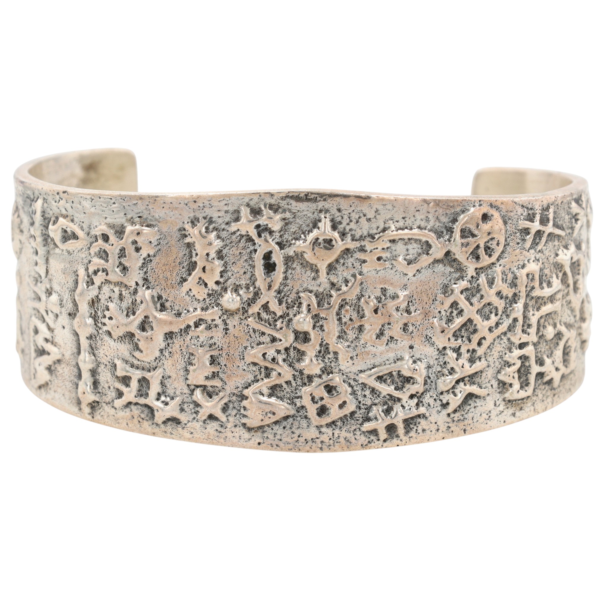 A Running Bear Navajo made sterling silver cast cuff bracelet with an abstract, textured design, weighing 70g and fitting a 6 1/4″ to 6 1/2″ wrist.
