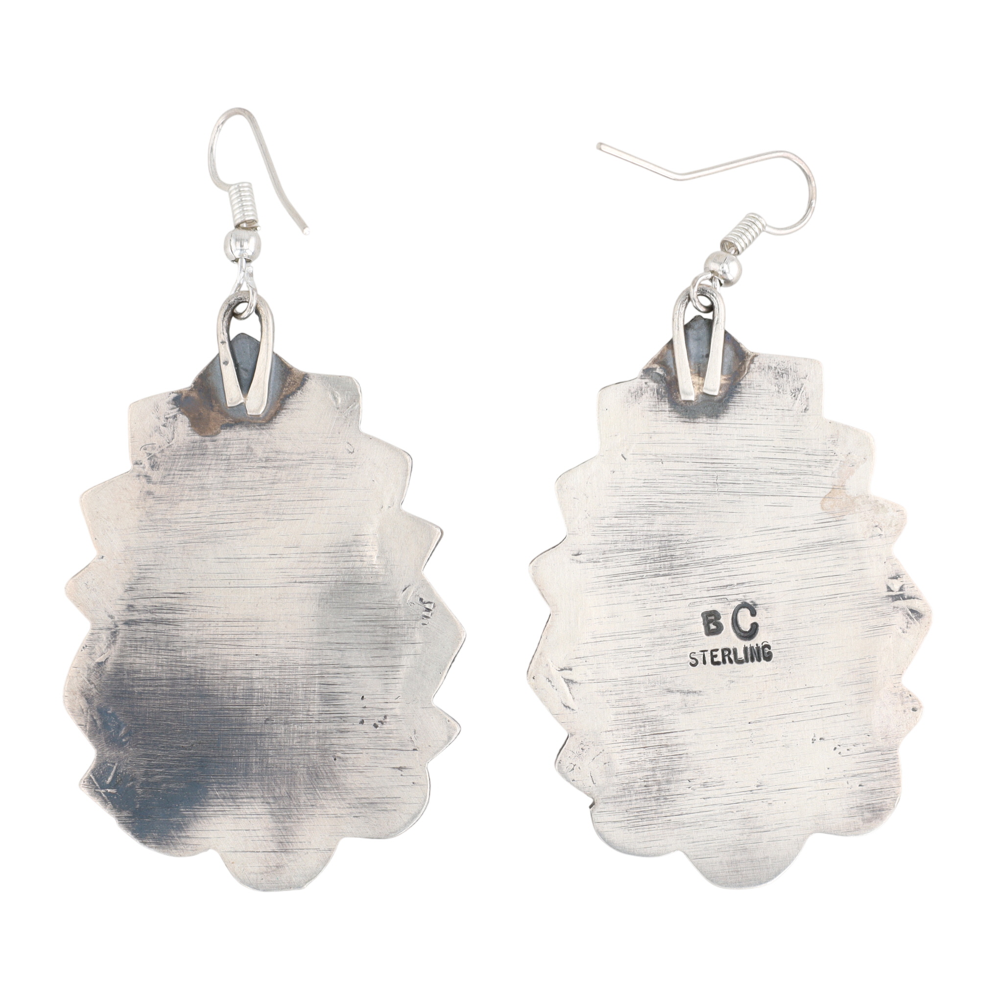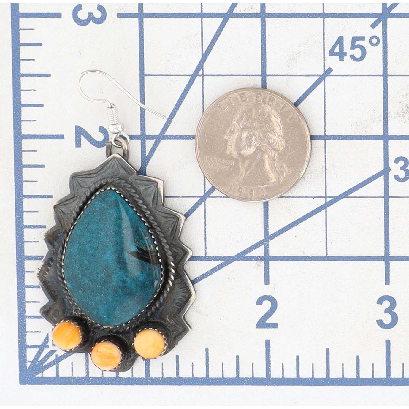 A pair of Britton Cayotinito Navajo sterling silver earrings with blue-green Hubei turquoise and orange spiny oyster stones, weighing 41g and measuring approximately 2.5 inches long.