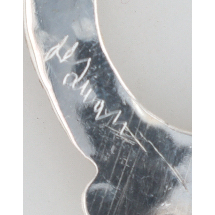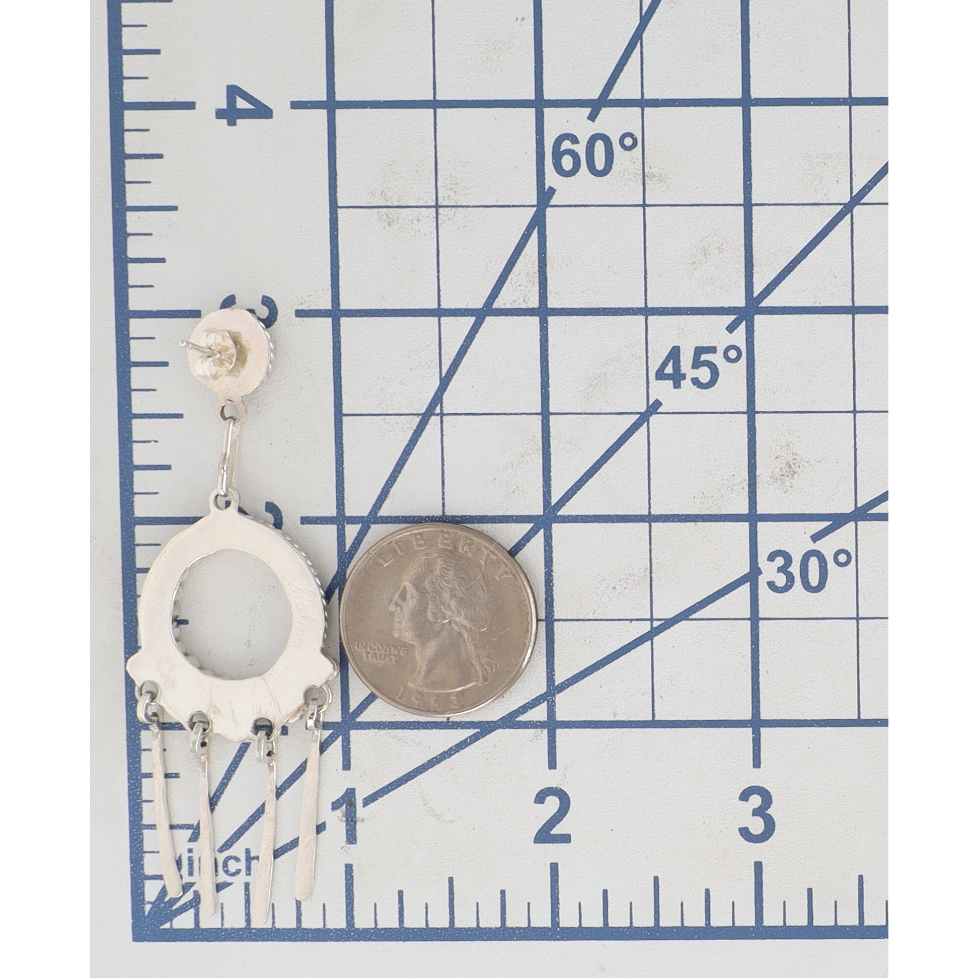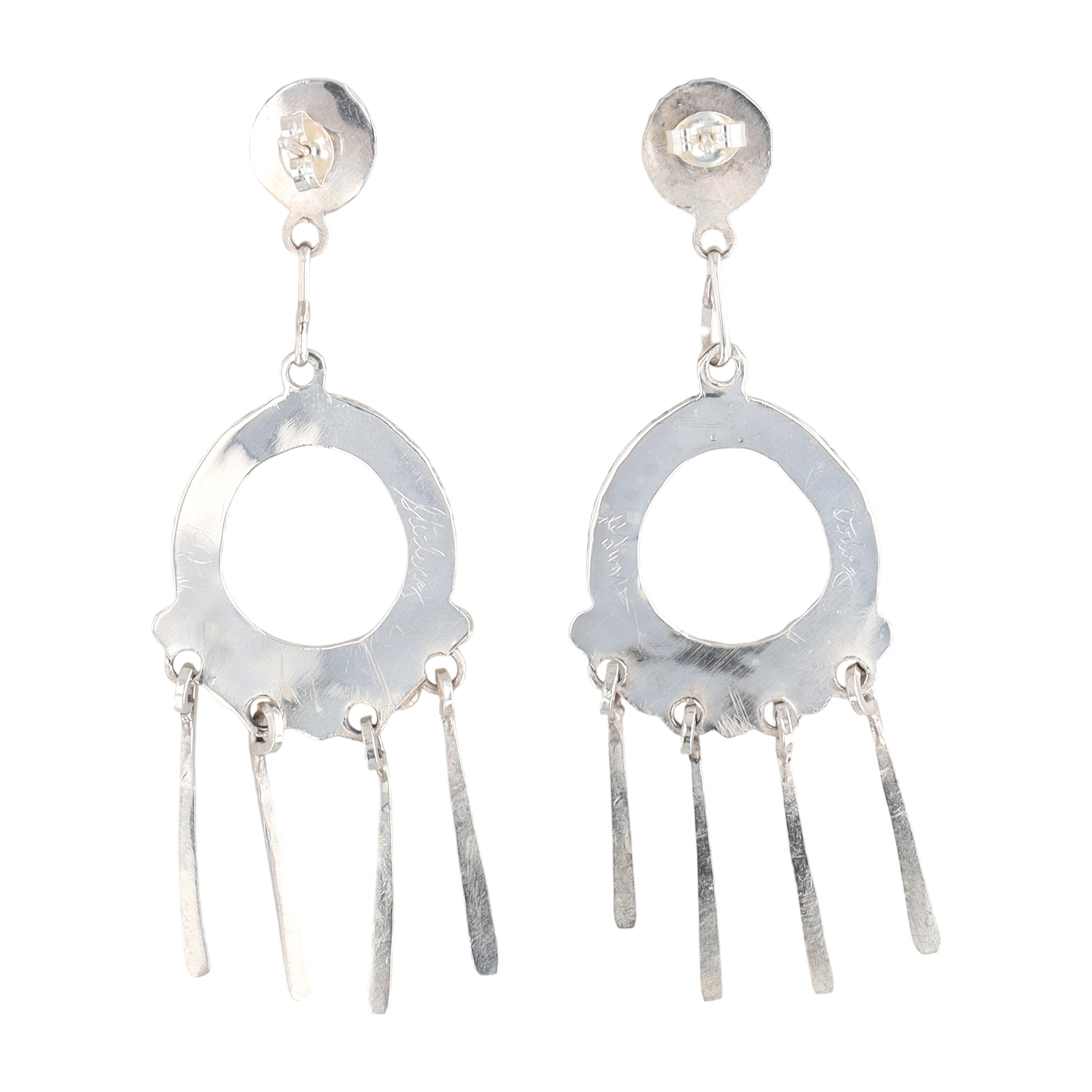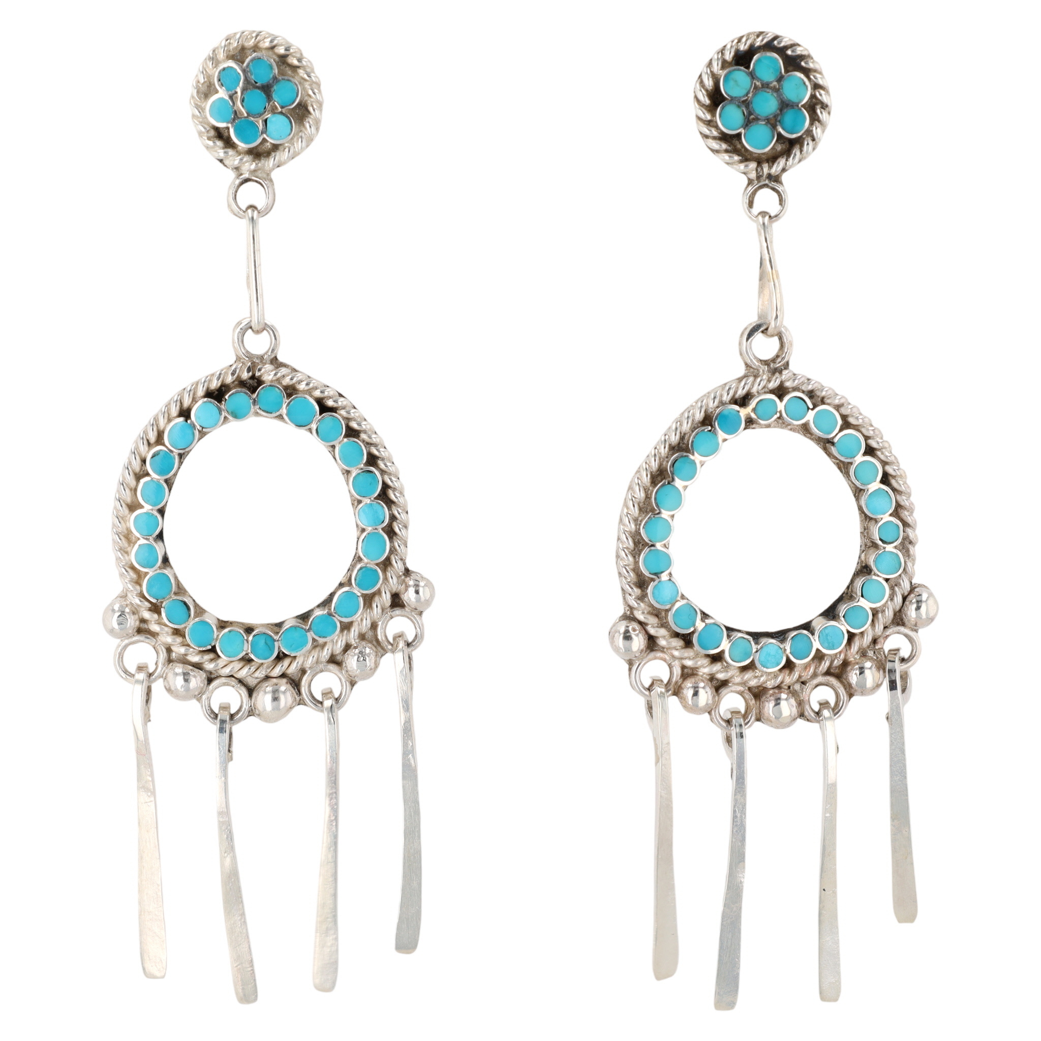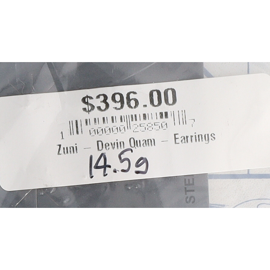 A pair of silver Zuni dangle earrings, featuring turquoise stones, inscribed with “Devin Quam” and “Sterling”, measuring approximately 2.5 inches long and weighing 14.5g.