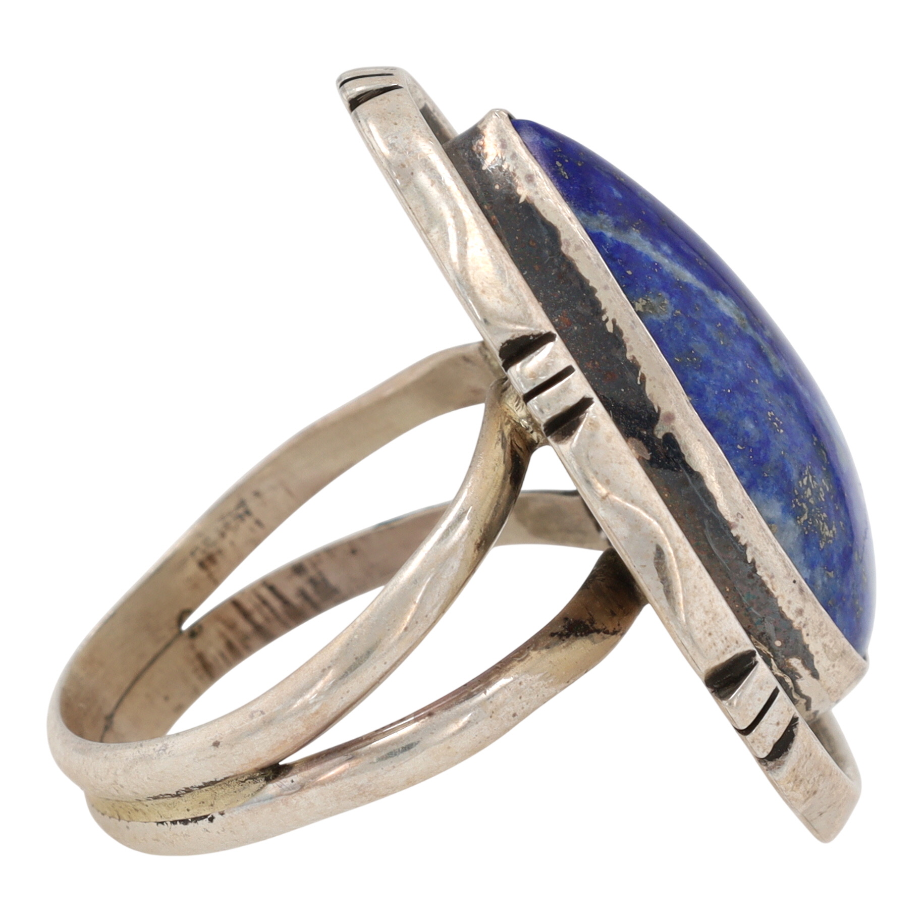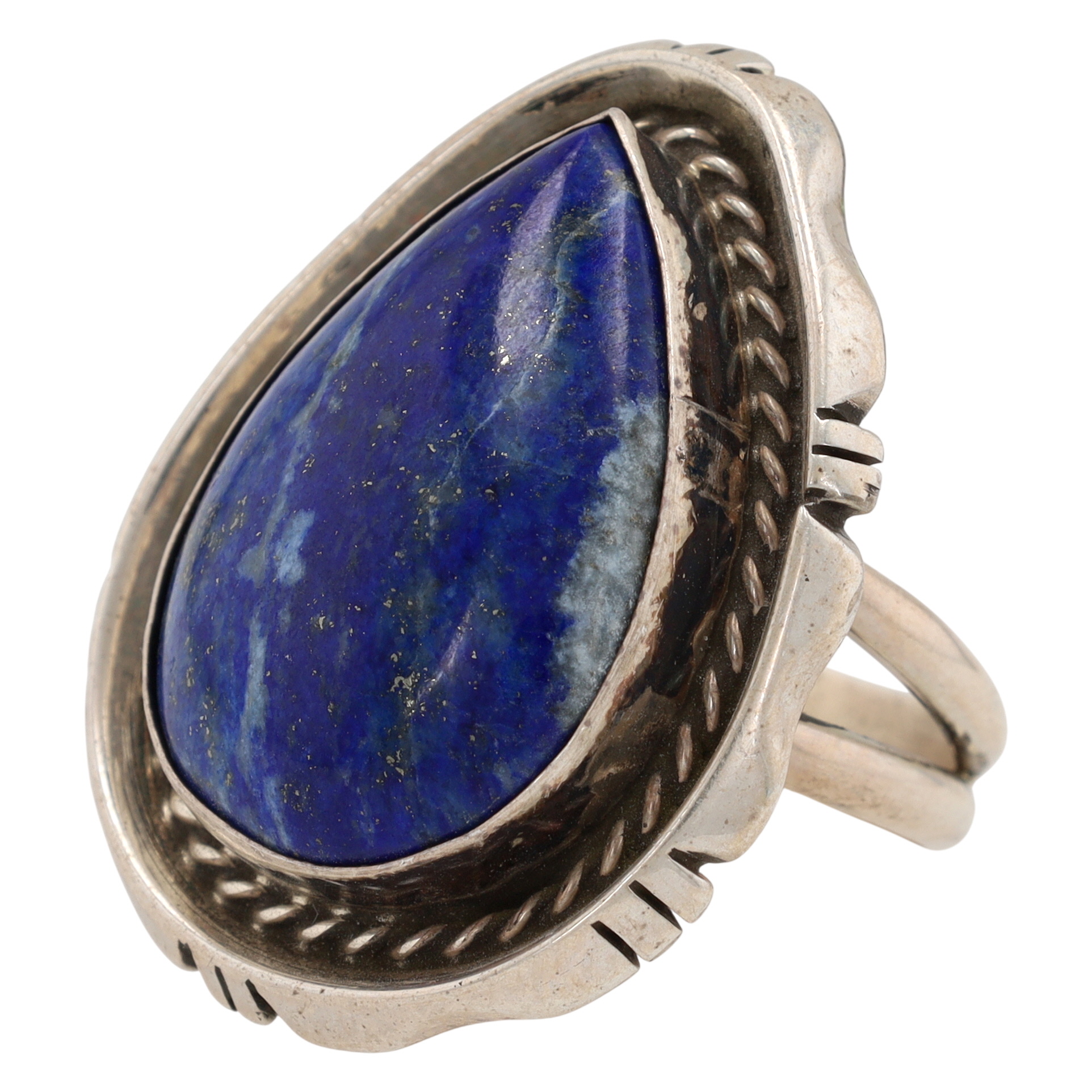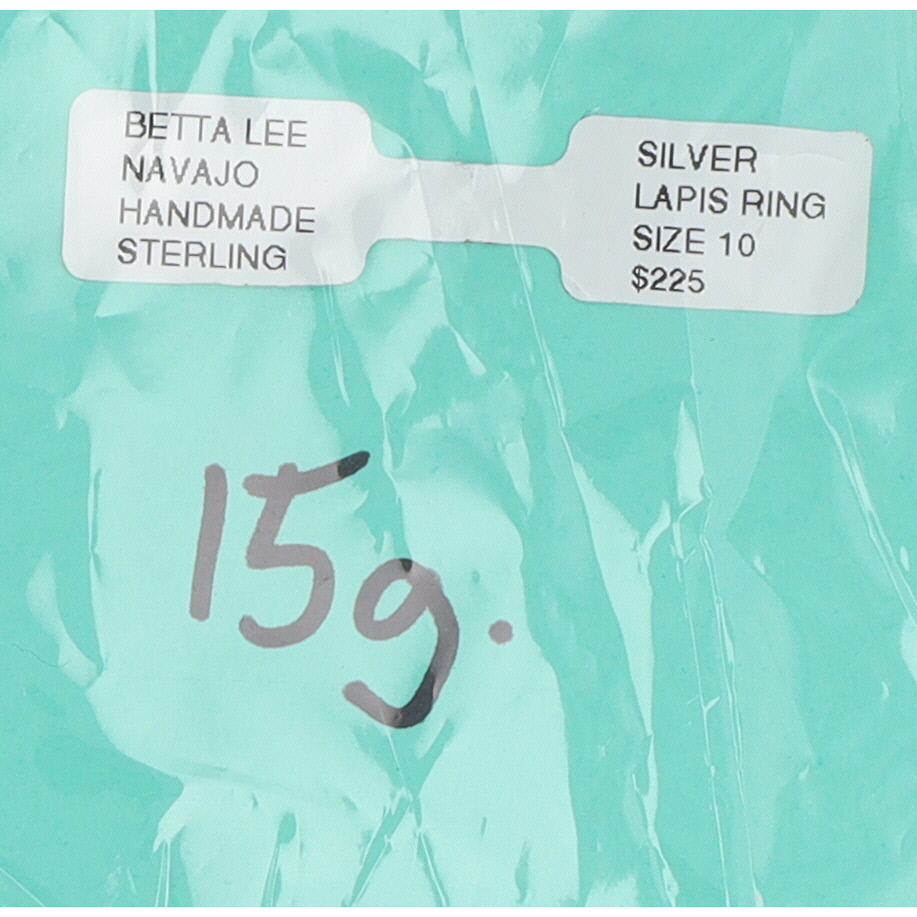 A Betta Lee Navajo handmade sterling silver lapis lazuli ring, size 10, featuring a deep blue stone and marked “Sterling” and “B. LEE”, weighing 15g.