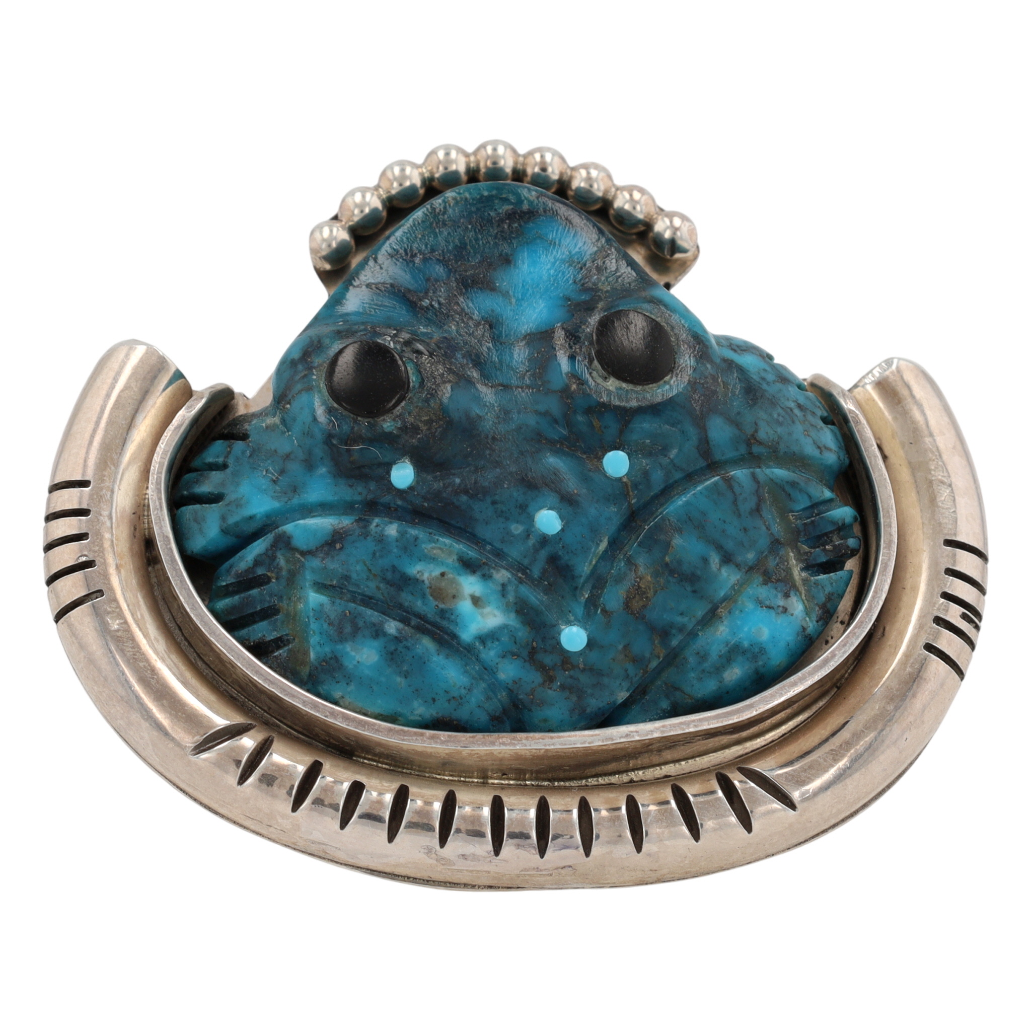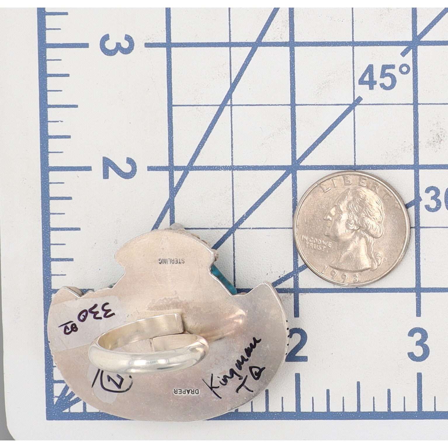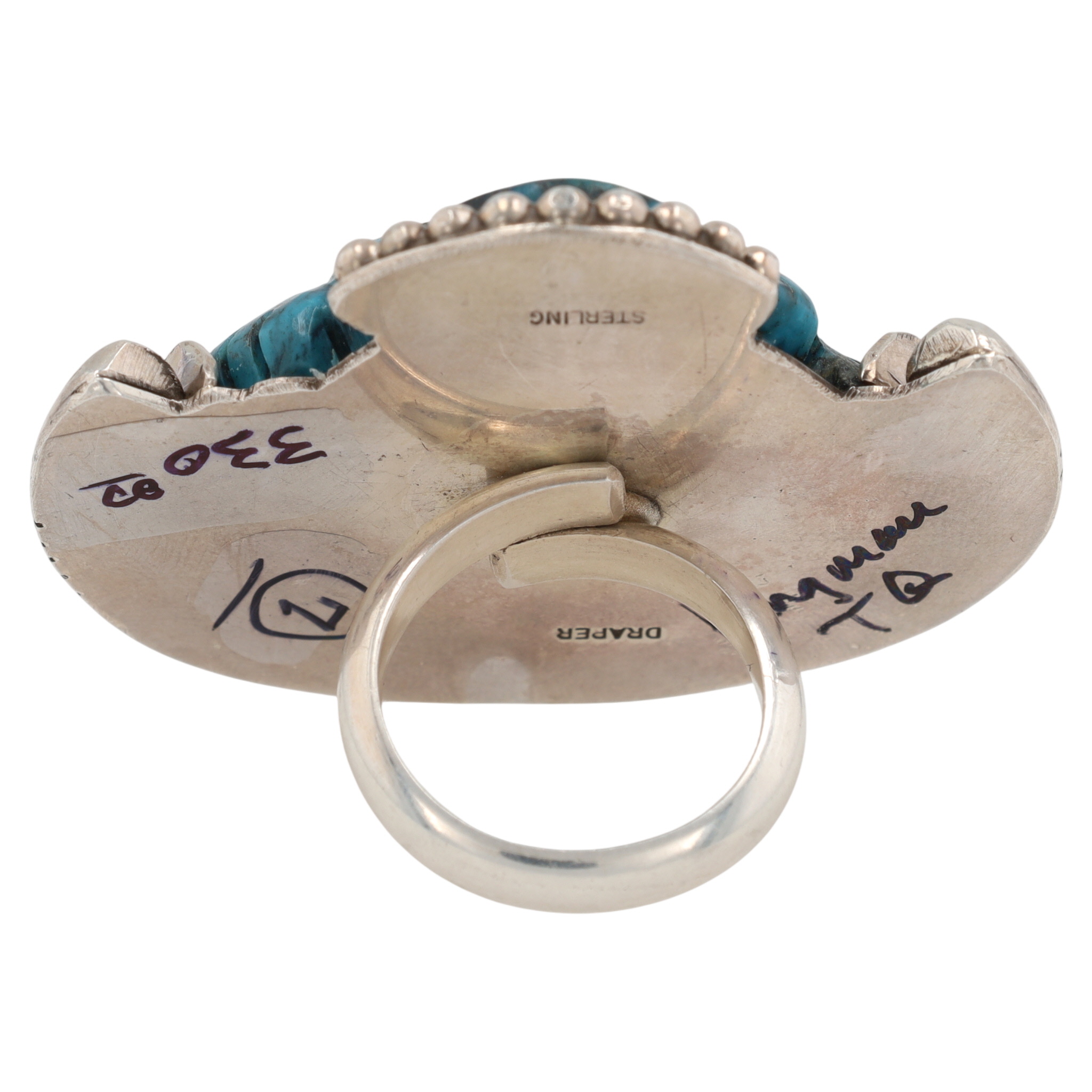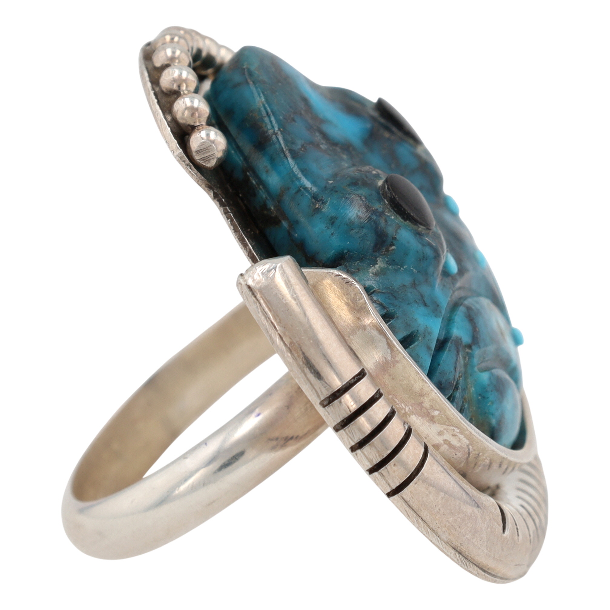A Joelias Draper silver ring, approximately 1.75 x 2 inches, weighing 37g, and size US 7, featuring a carved blue-green Kingman turquoise frog with black jet eyes, marked ‘DRAPER’ and ‘STERLING’.