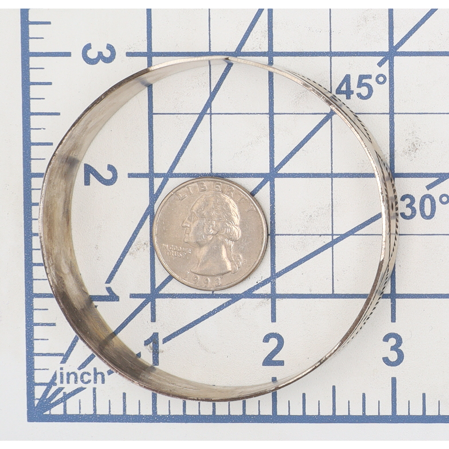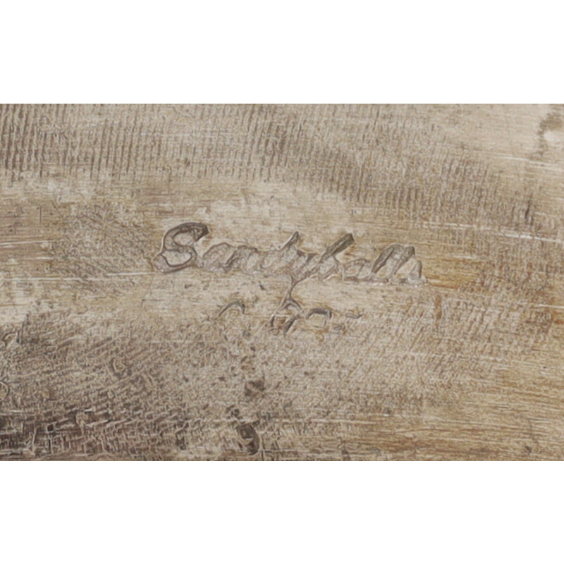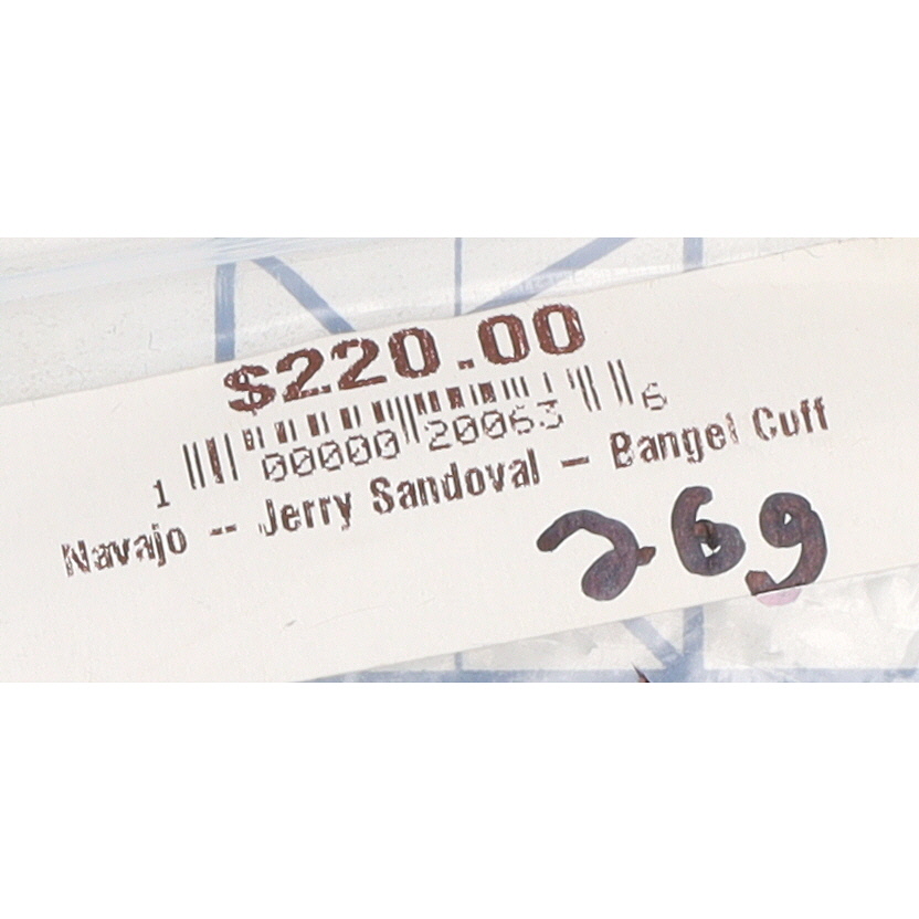 A sterling metal bangle cuff bracelet measuring approximately 8 inches in circumference, weighing 26g, featuring an etched pattern, inscribed “Sandoval,” and identified by a tag as “Navajo — Jerry Sandoval – Bangel Cuff.”