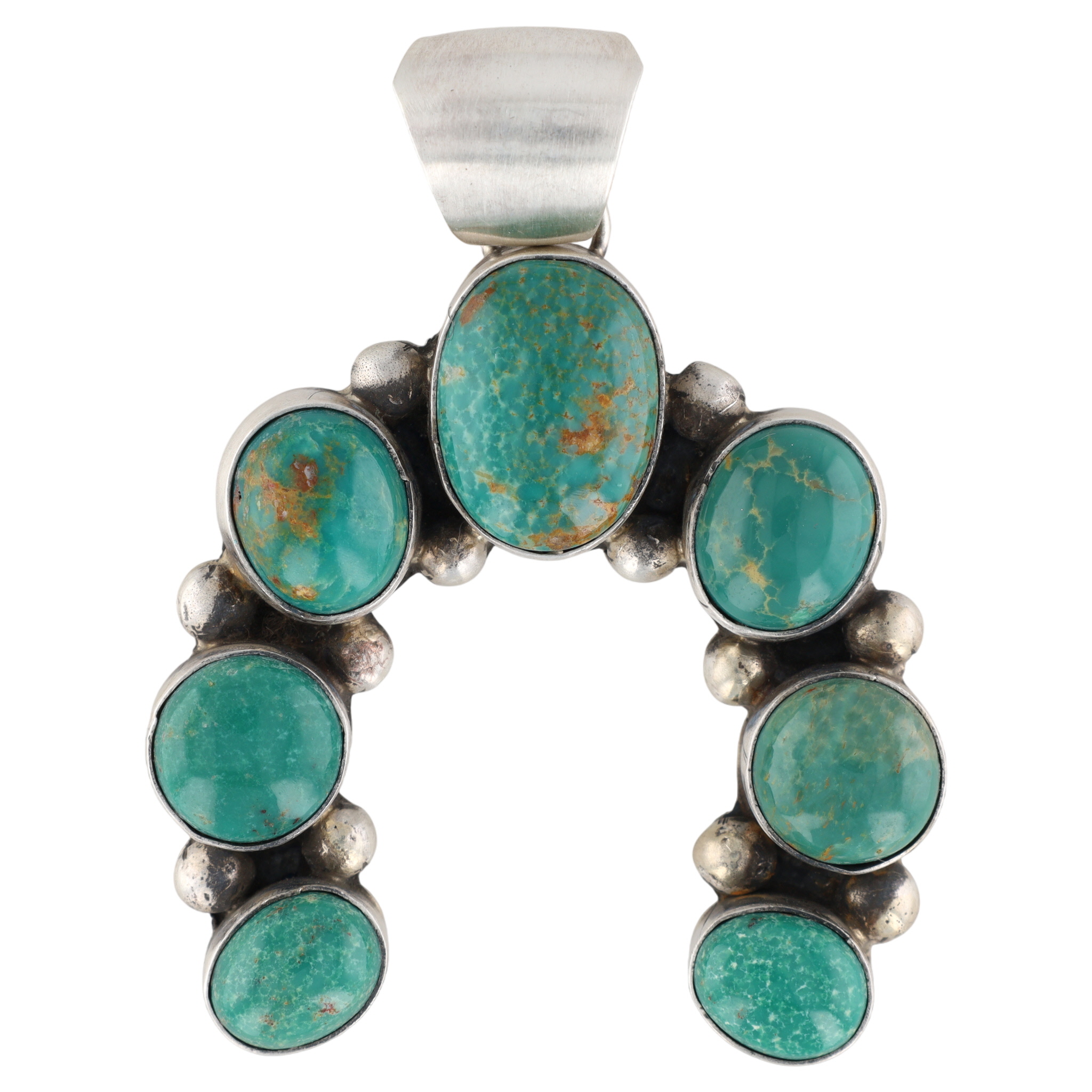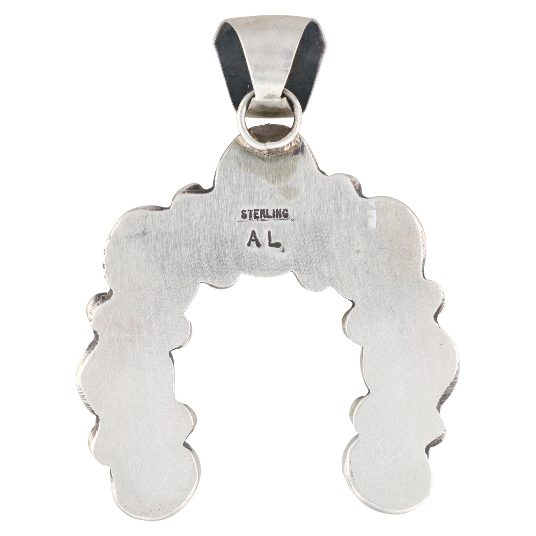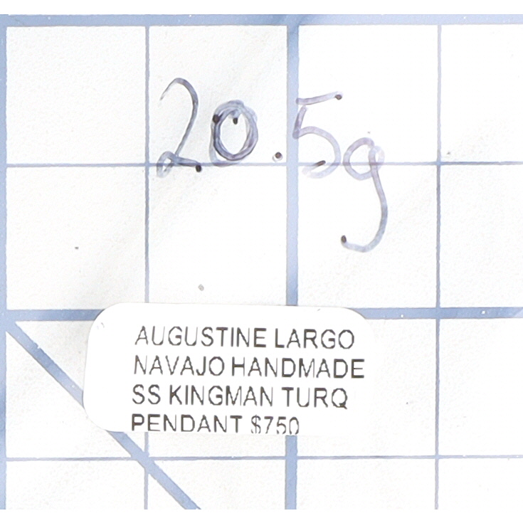 A Navajo handmade sterling silver Kingman turquoise Naja pendant by Augustine Largo, marked ‘STERLING’ and ‘AL’, weighing 20.5g and measuring approximately 2.5 inches tall by 2 inches wide.