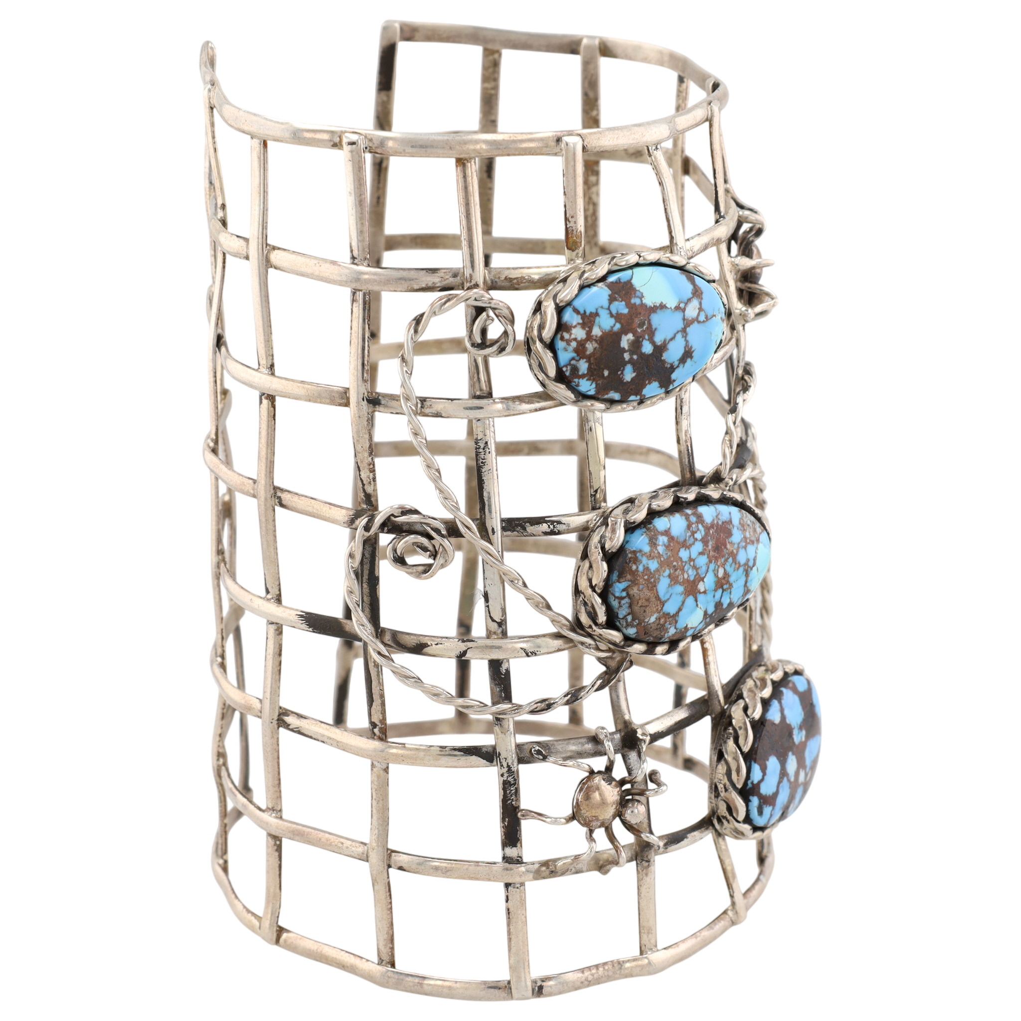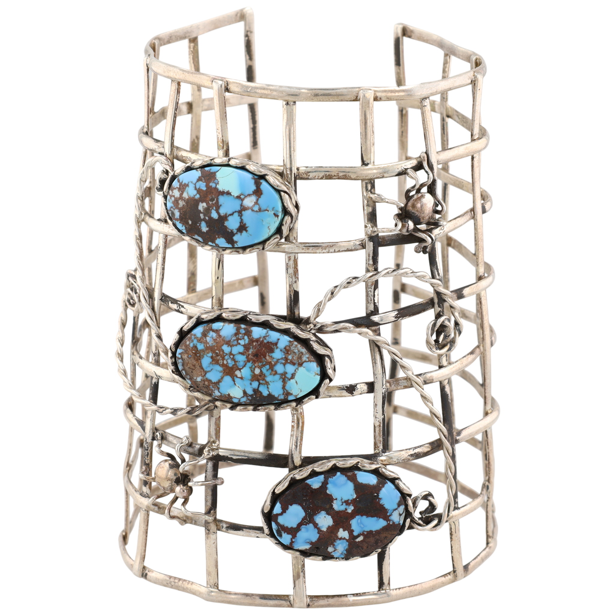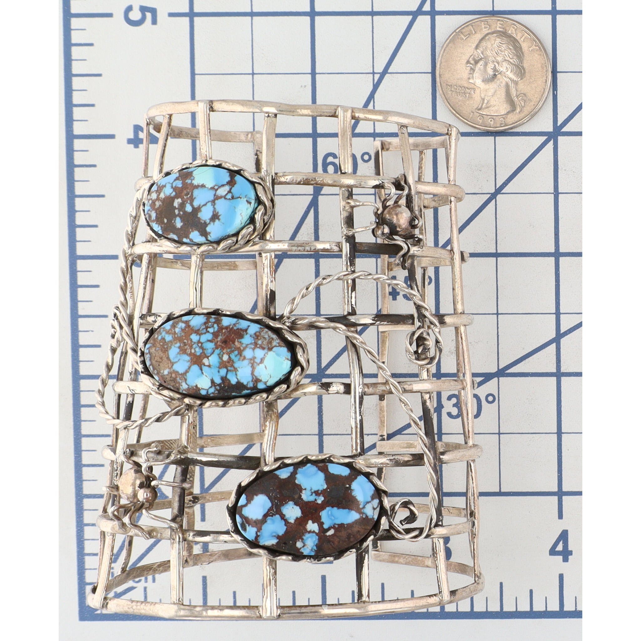 A signed Navajo handmade contemporary silver cuff bracelet with three oval Golden Hills turquoise stones and spider embellishments on a grid design, marked ‘925 BA’ for the cuff’s silversmith, and weighing 65.5g.