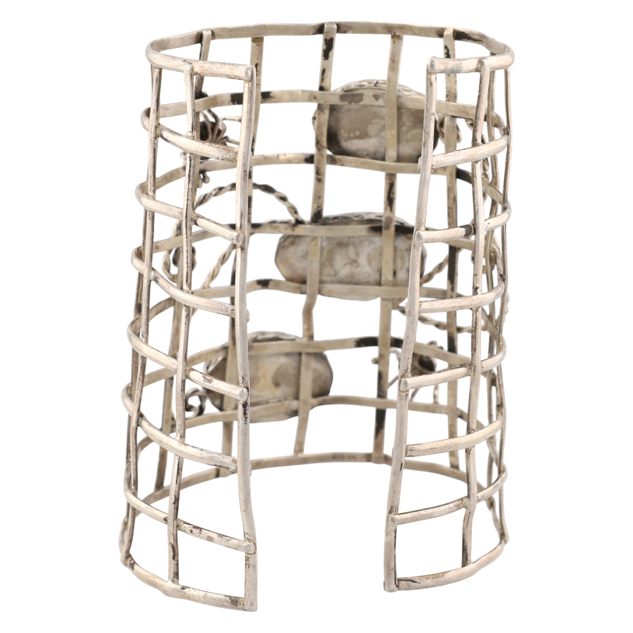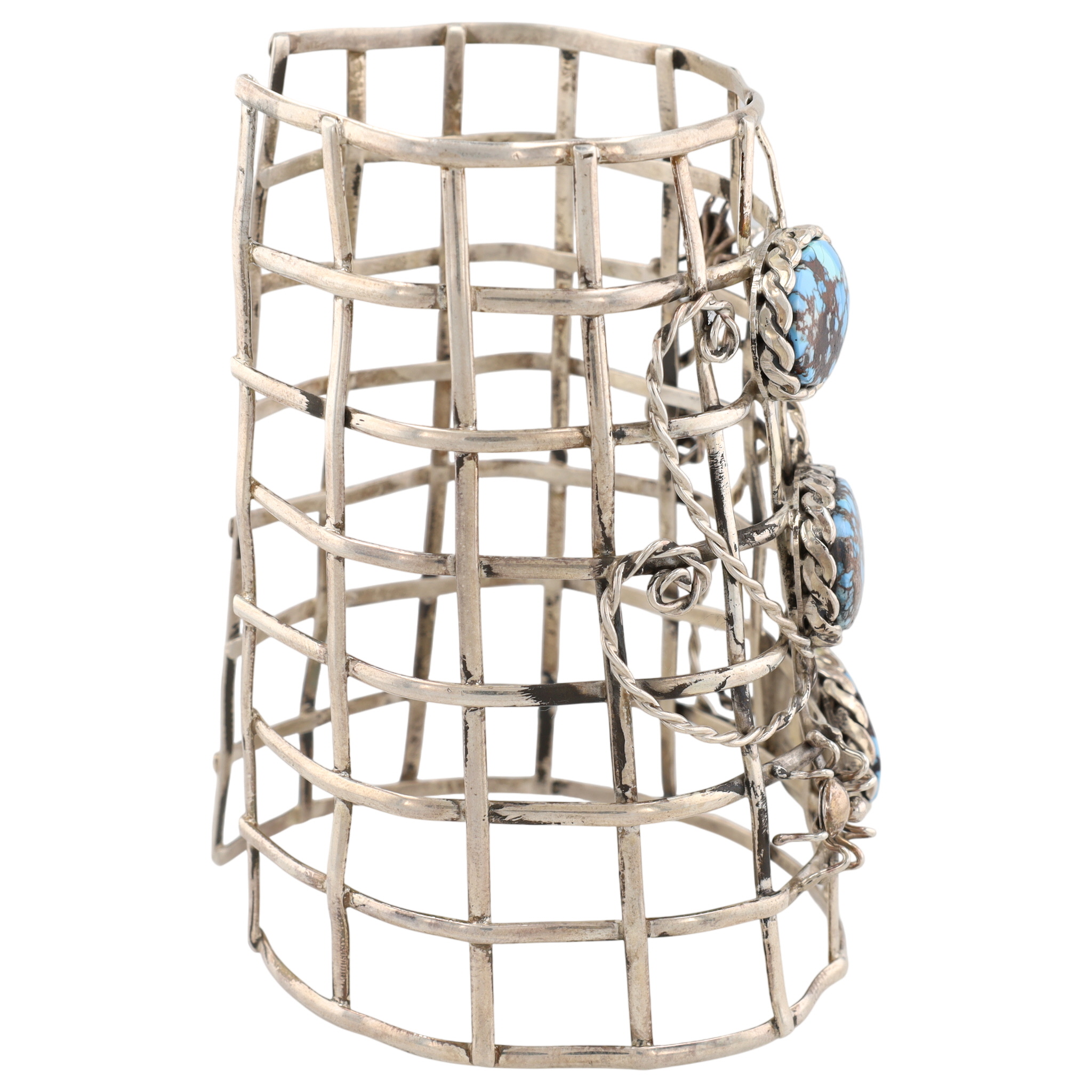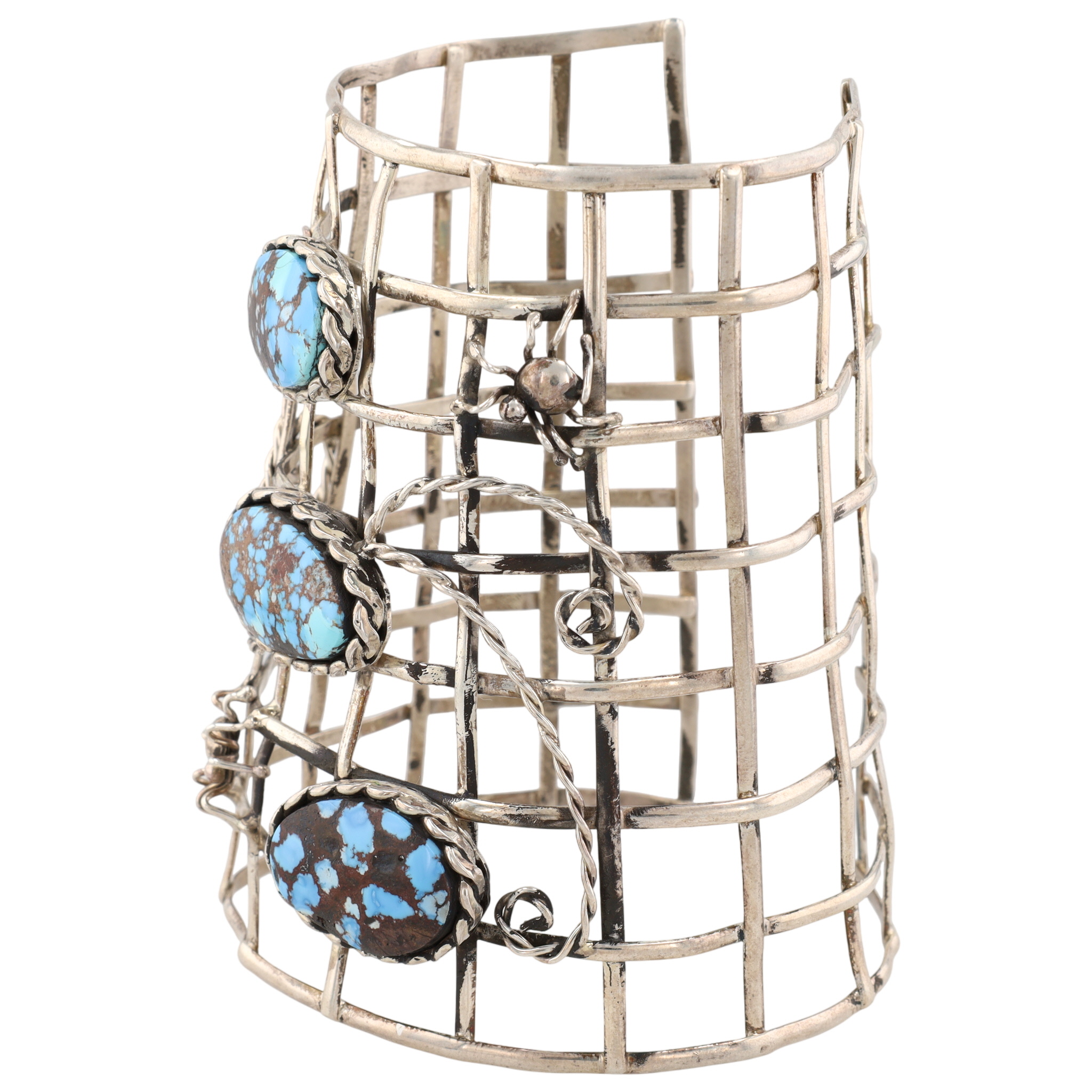 A signed Navajo handmade contemporary silver cuff bracelet with three oval Golden Hills turquoise stones and spider embellishments on a grid design, marked ‘925 BA’ for the cuff’s silversmith, and weighing 65.5g.