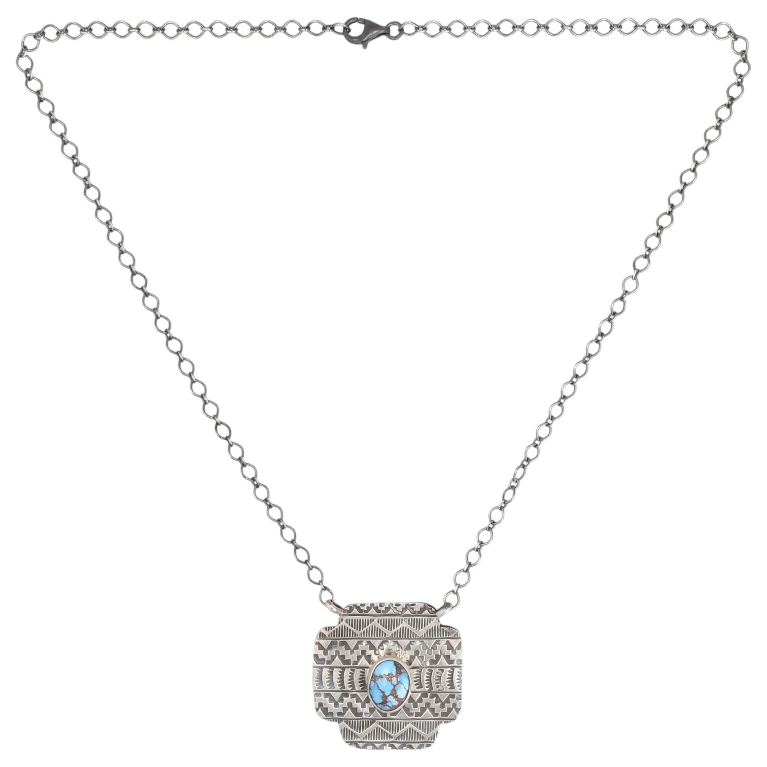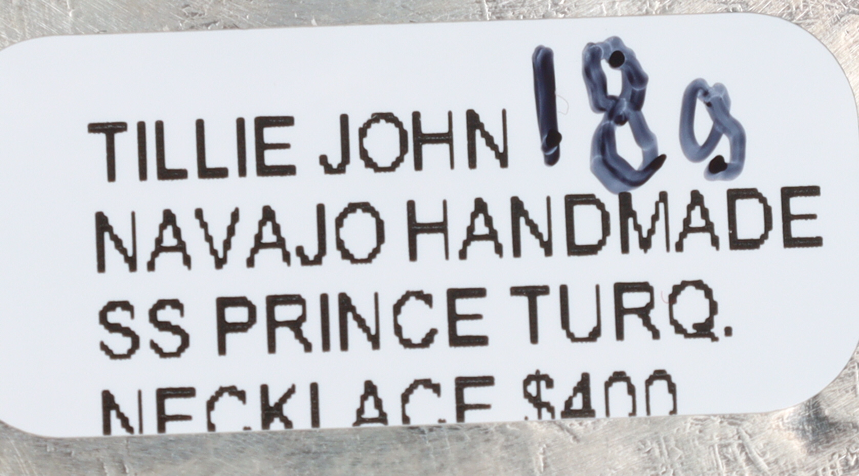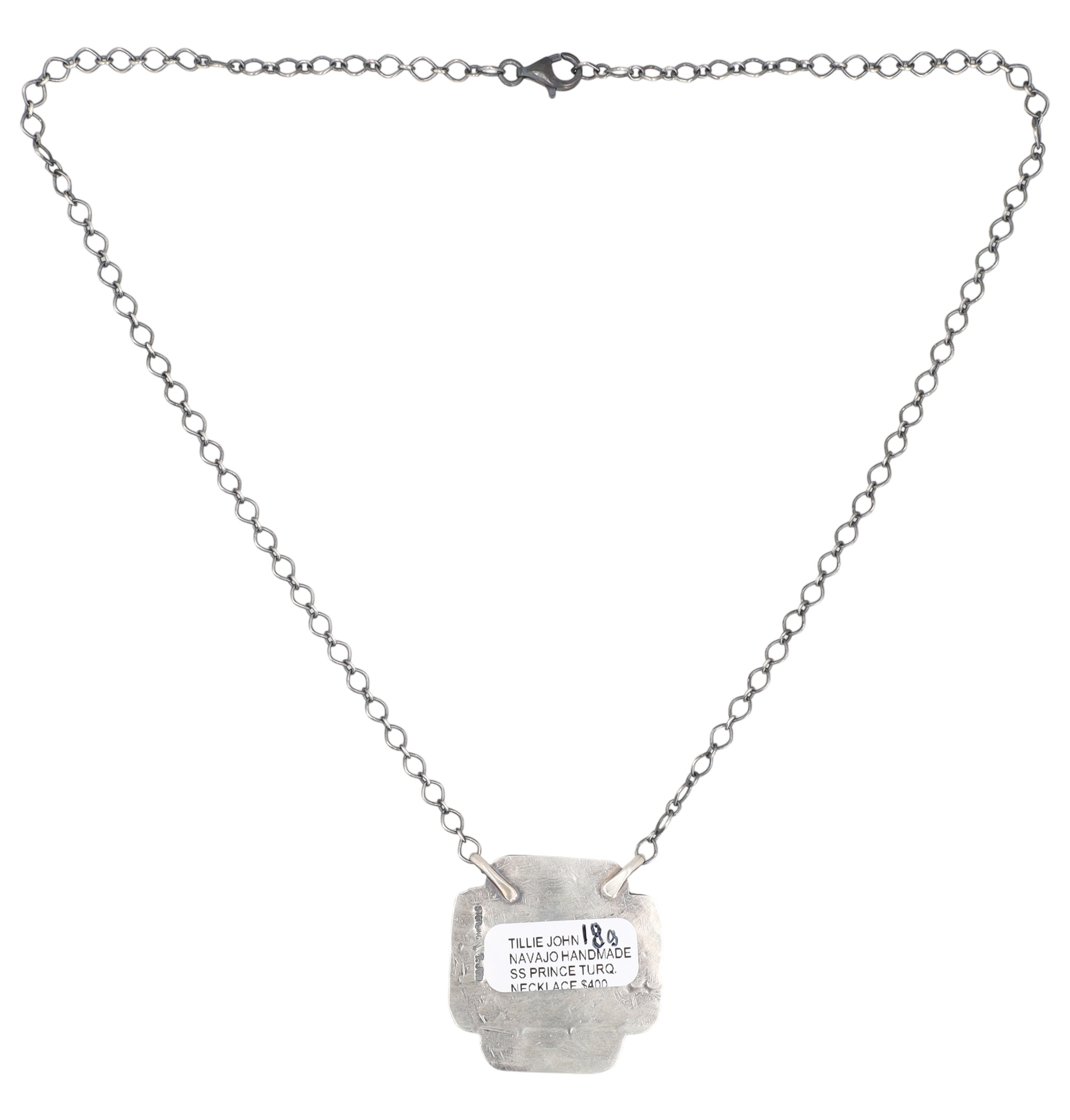 A Navajo handmade sterling silver necklace by Tillie Jon, featuring an approximately 1.5-inch square pendant with an oval light blue turquoise stone with brown matrix consistent of Prince Turquoise, on a roughly 20-inch chain, weighs 18g, marked “STERLING T. JON” and labeled “TILLIE JOHN NAVAJO HANDMADE SS PRINCE TURQ. NECKLACE”.