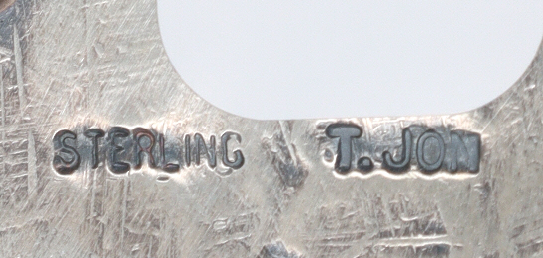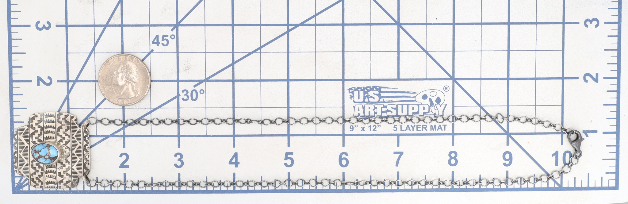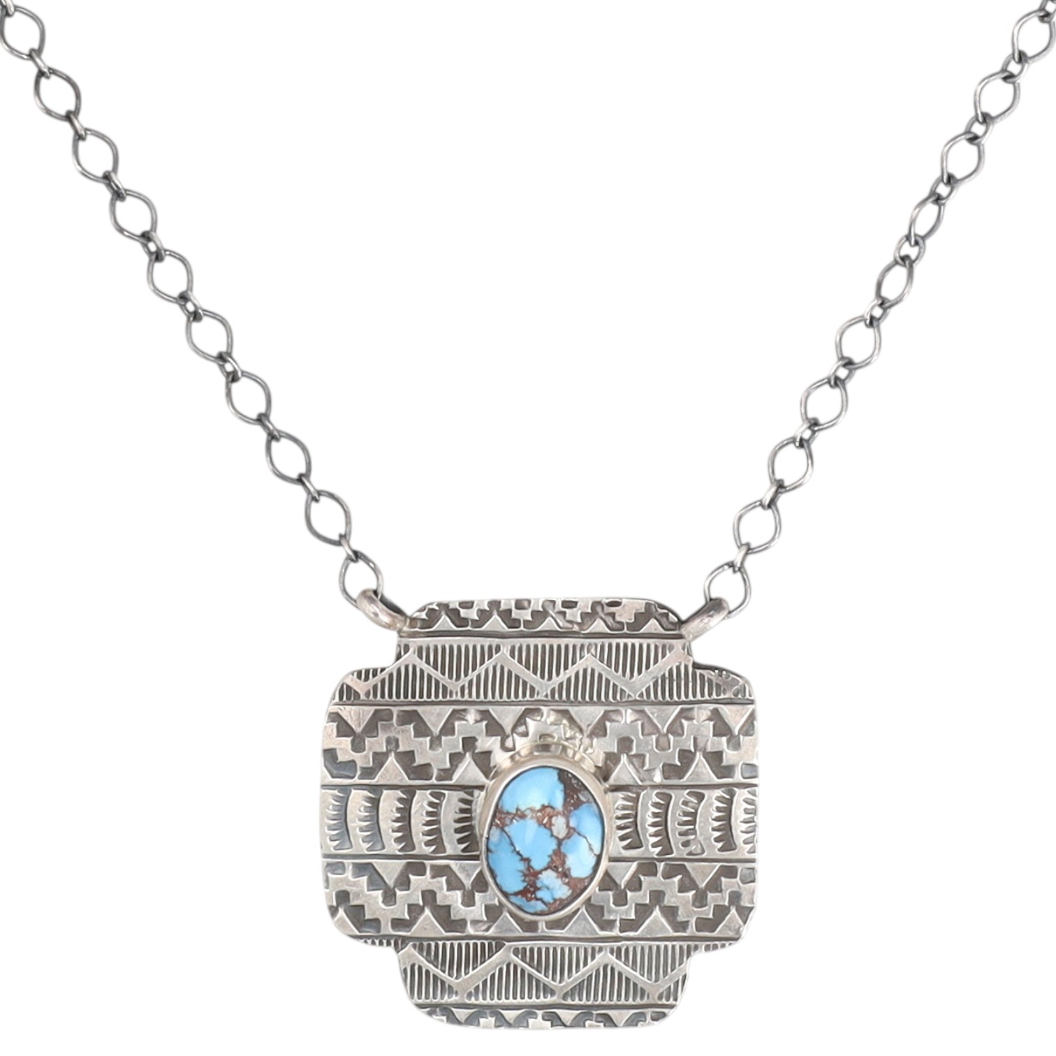 A Navajo handmade sterling silver necklace by Tillie Jon, featuring an approximately 1.5-inch square pendant with an oval light blue turquoise stone with brown matrix consistent of Prince Turquoise, on a roughly 20-inch chain, weighs 18g, marked “STERLING T. JON” and labeled “TILLIE JOHN NAVAJO HANDMADE SS PRINCE TURQ. NECKLACE”.