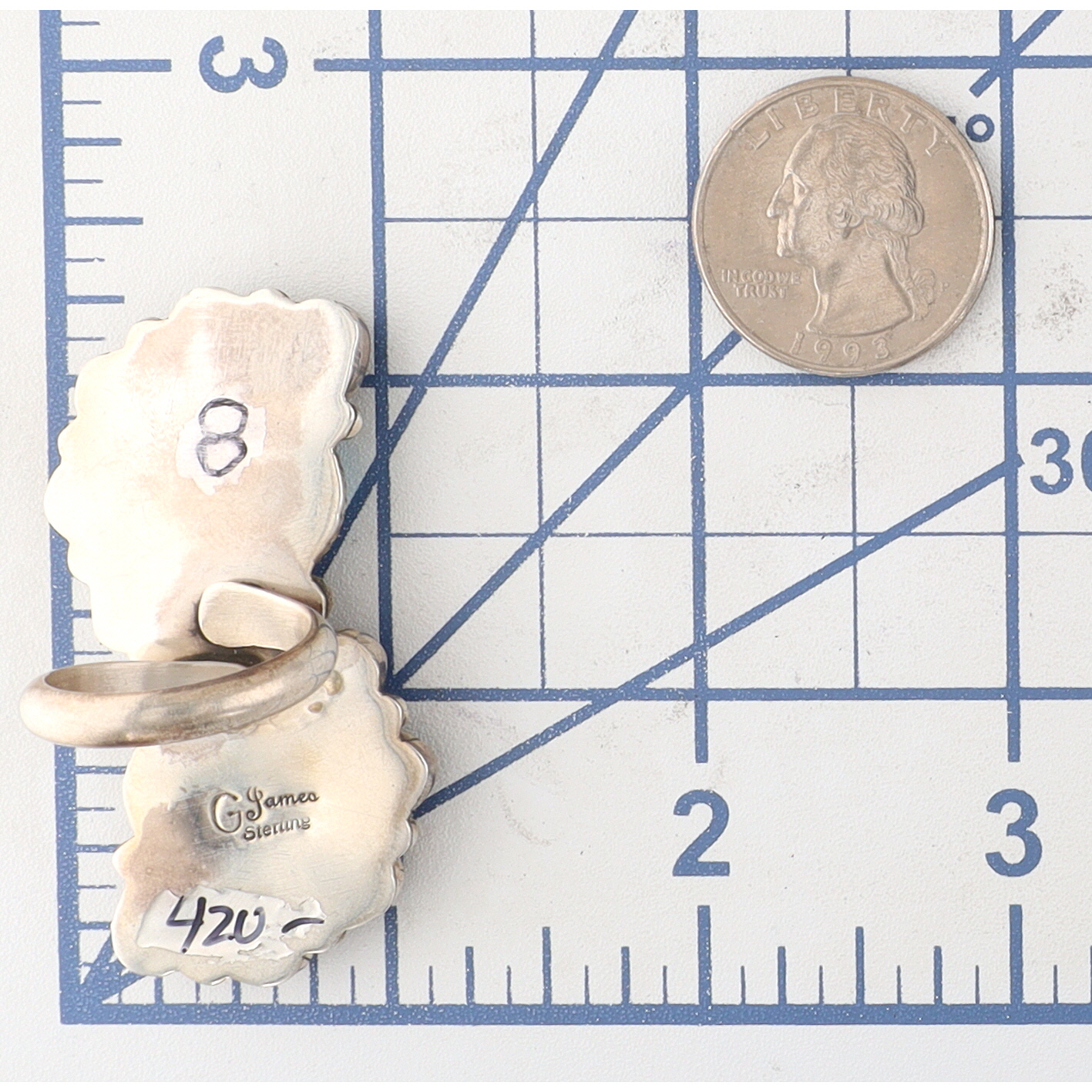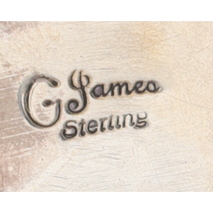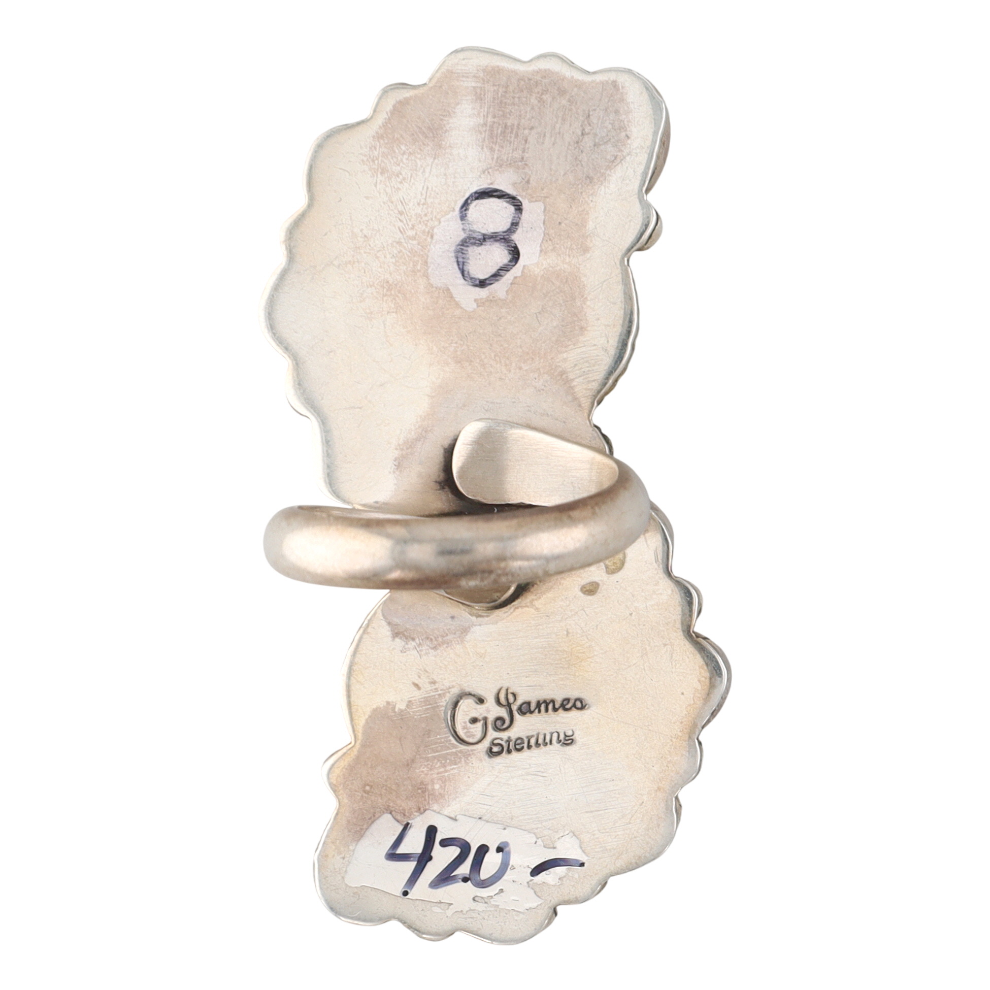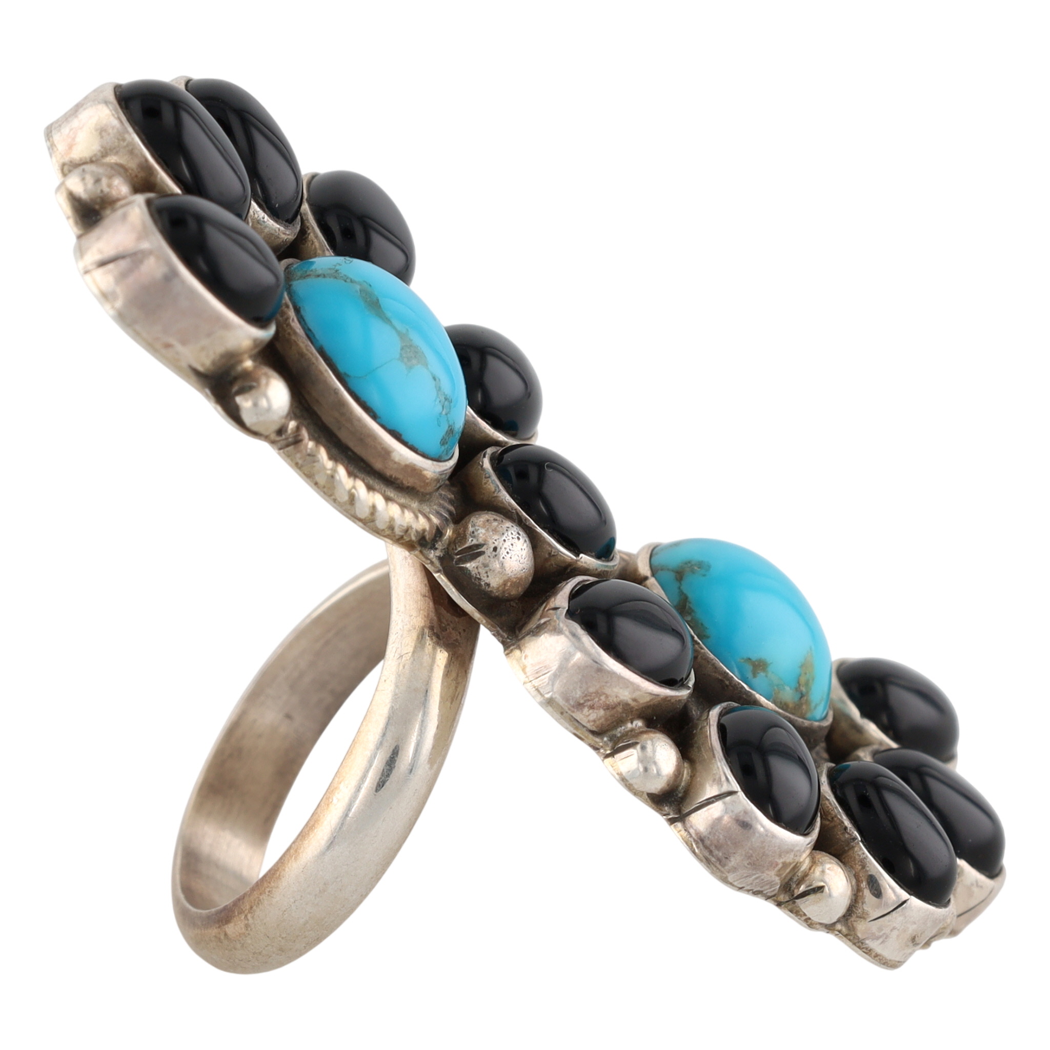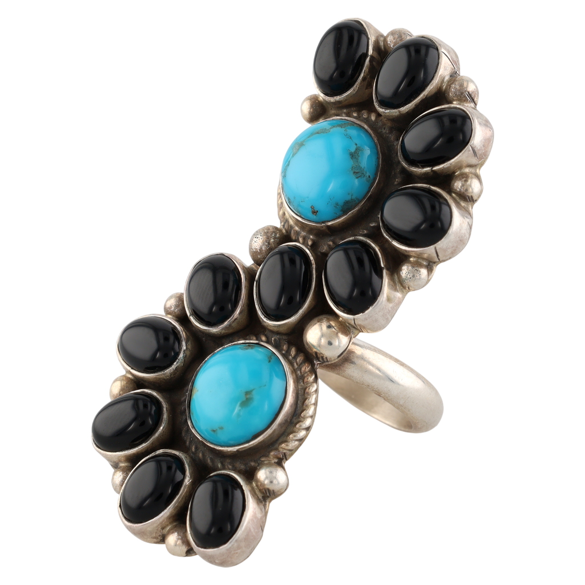 A Geraldine James Navajo sterling silver ring featuring two oval turquoise stones surrounded by ten oval black onyx stones, marked ‘G. James Sterling’ with size ‘8’ weighing 22g