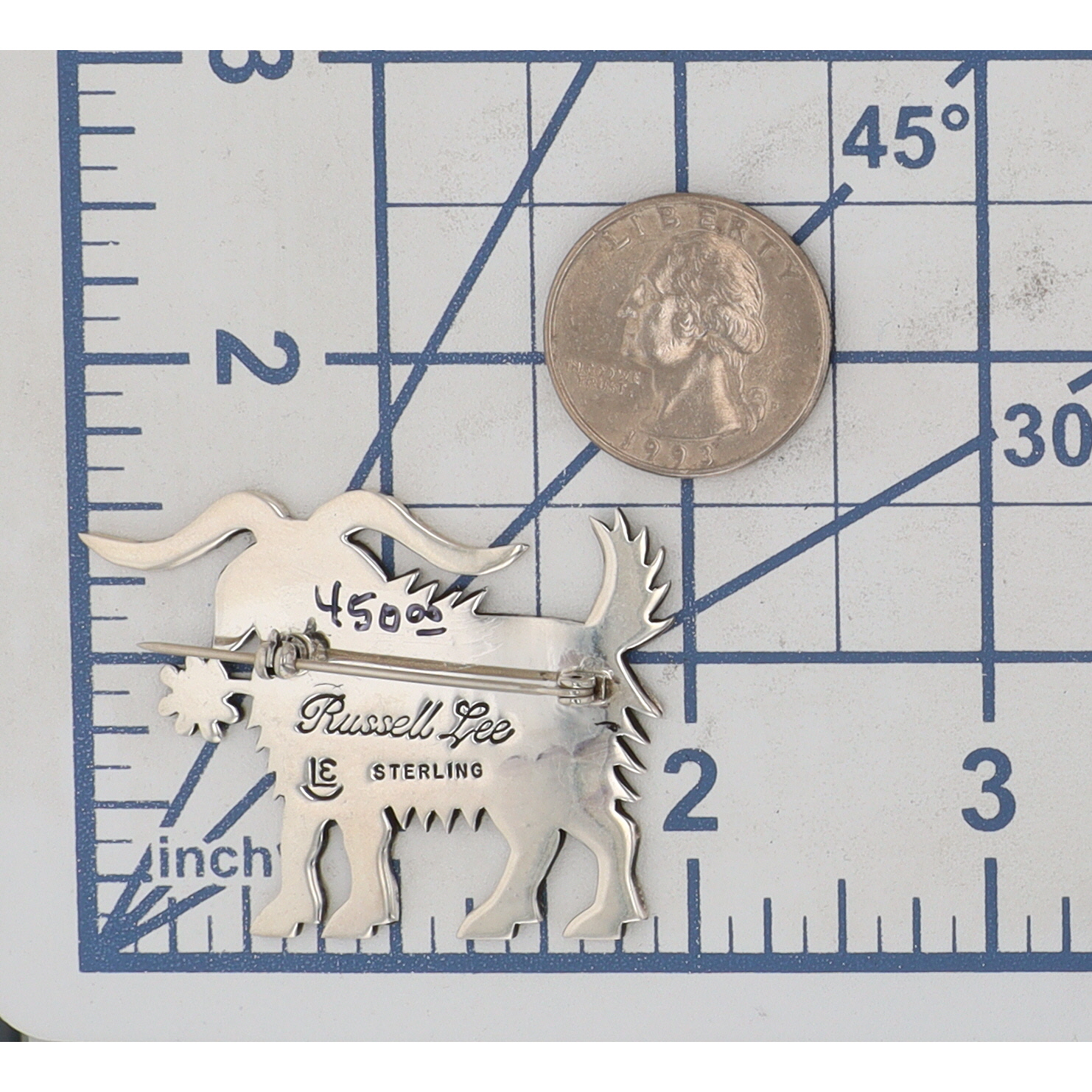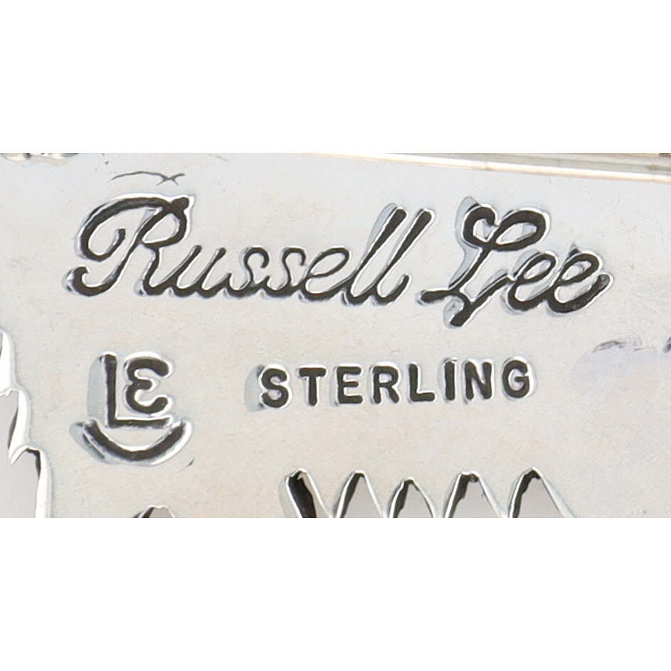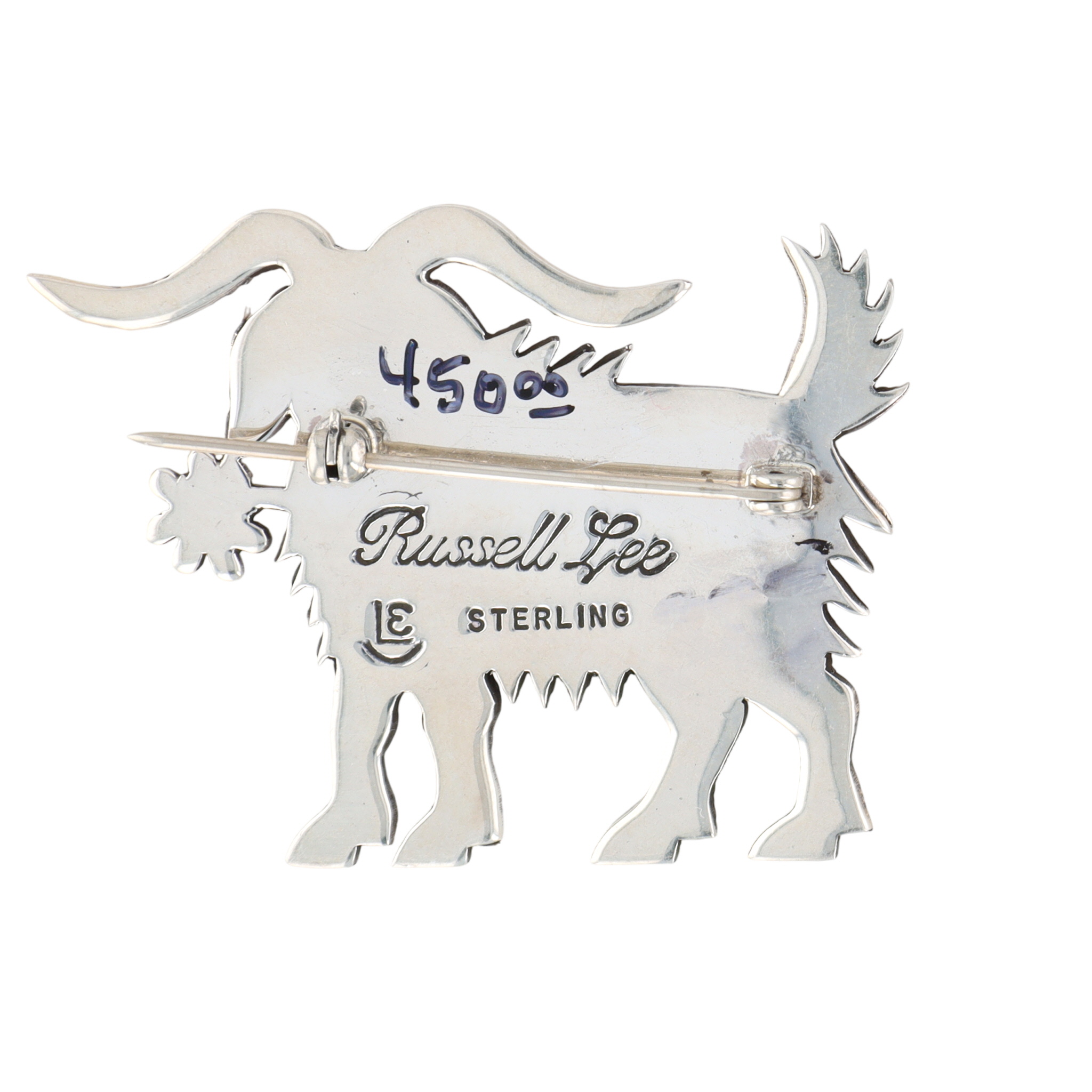 A silver goat-shaped brooch, inscribed “Russell Lee” and “STERLING” with an “LE” maker’s mark, weighing 13g and measuring approximately 2.5 inches wide.