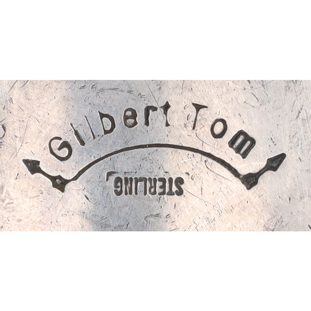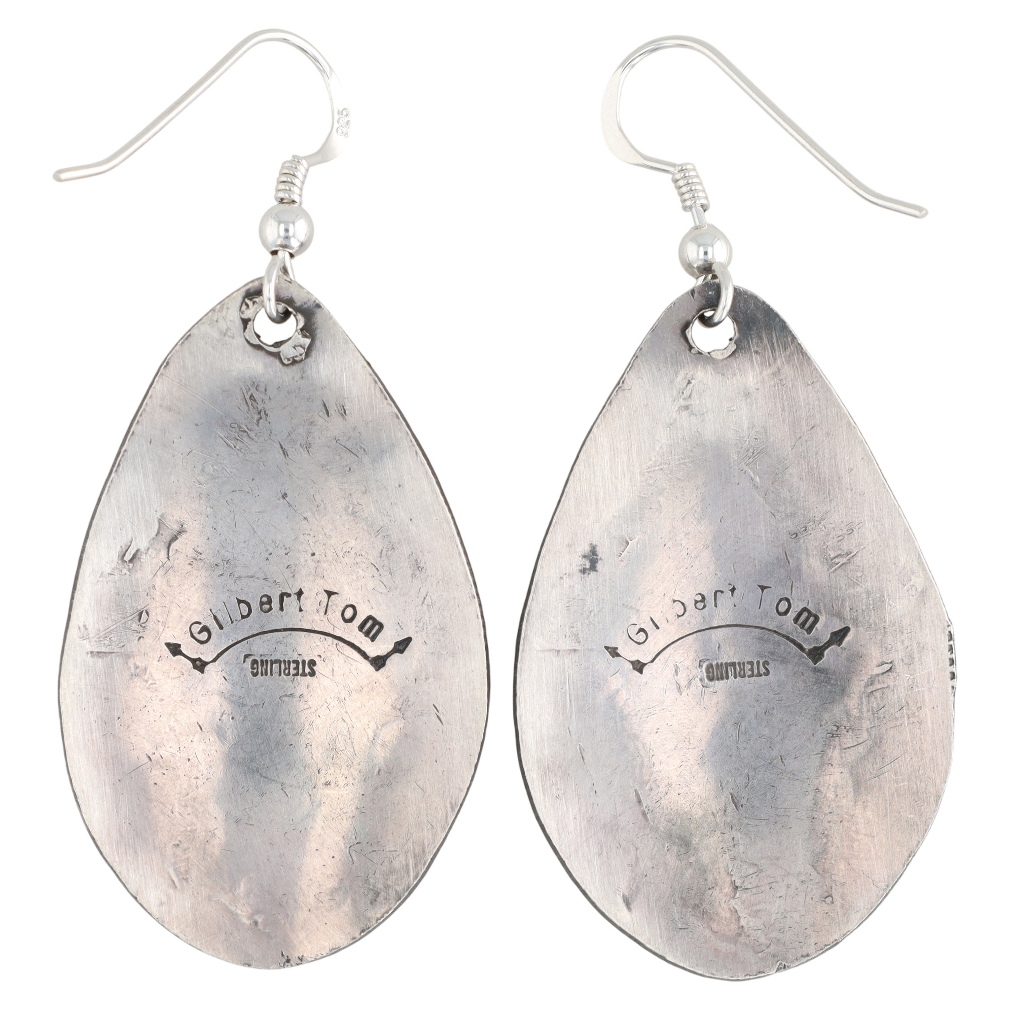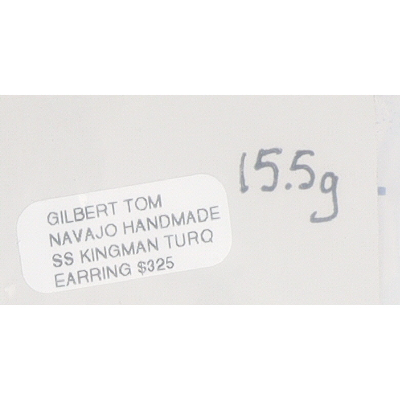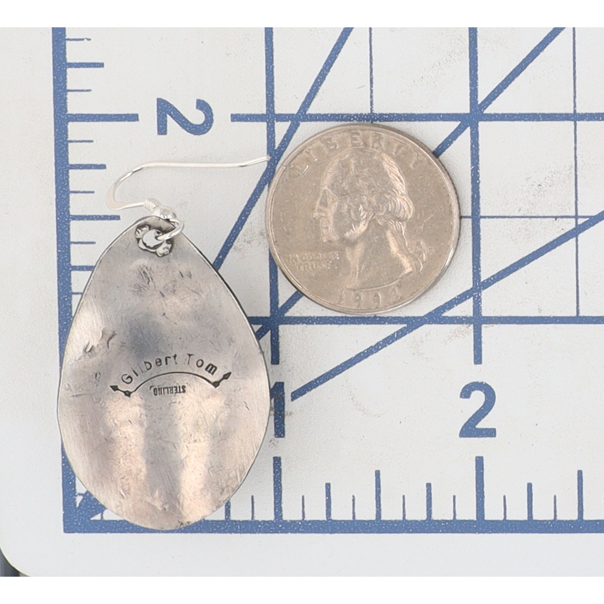 A pair of Gilbert Tom Navajo handmade sterling silver dangle earrings, each featuring a cobblestone Kingman turquoise inlay, marked “Gilbert Tom” and “STERLING”, weighing 15.5g, measuring approximately 2 inches long.