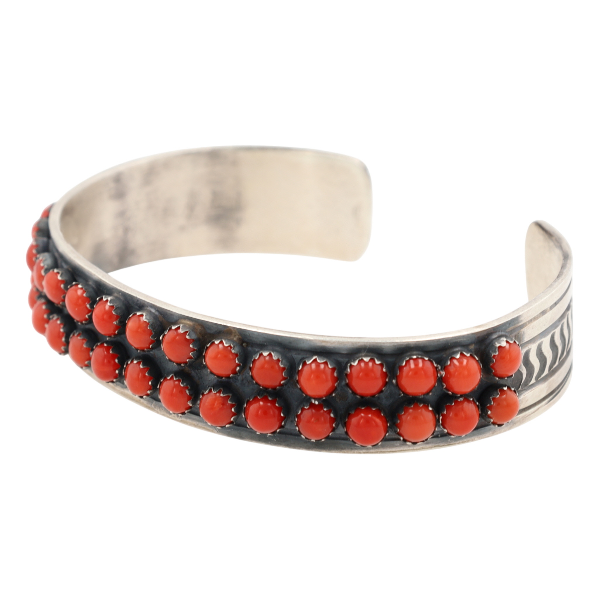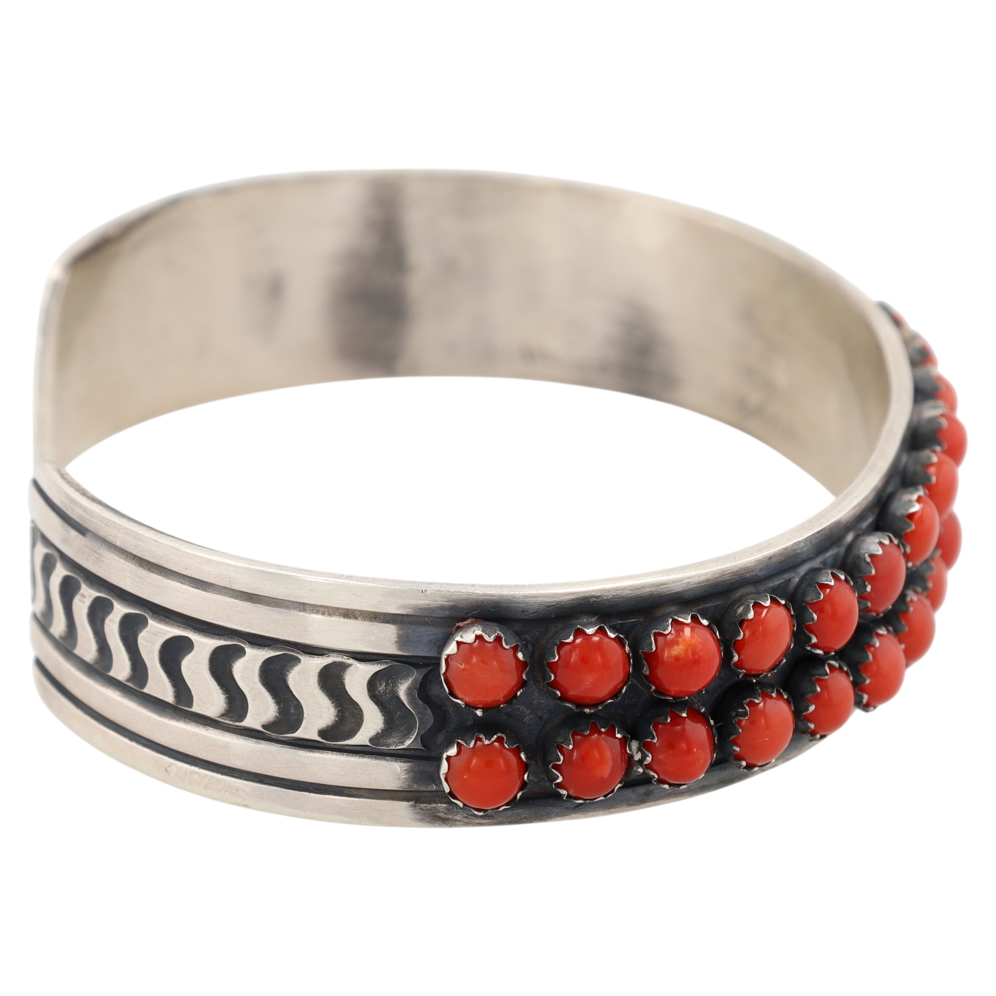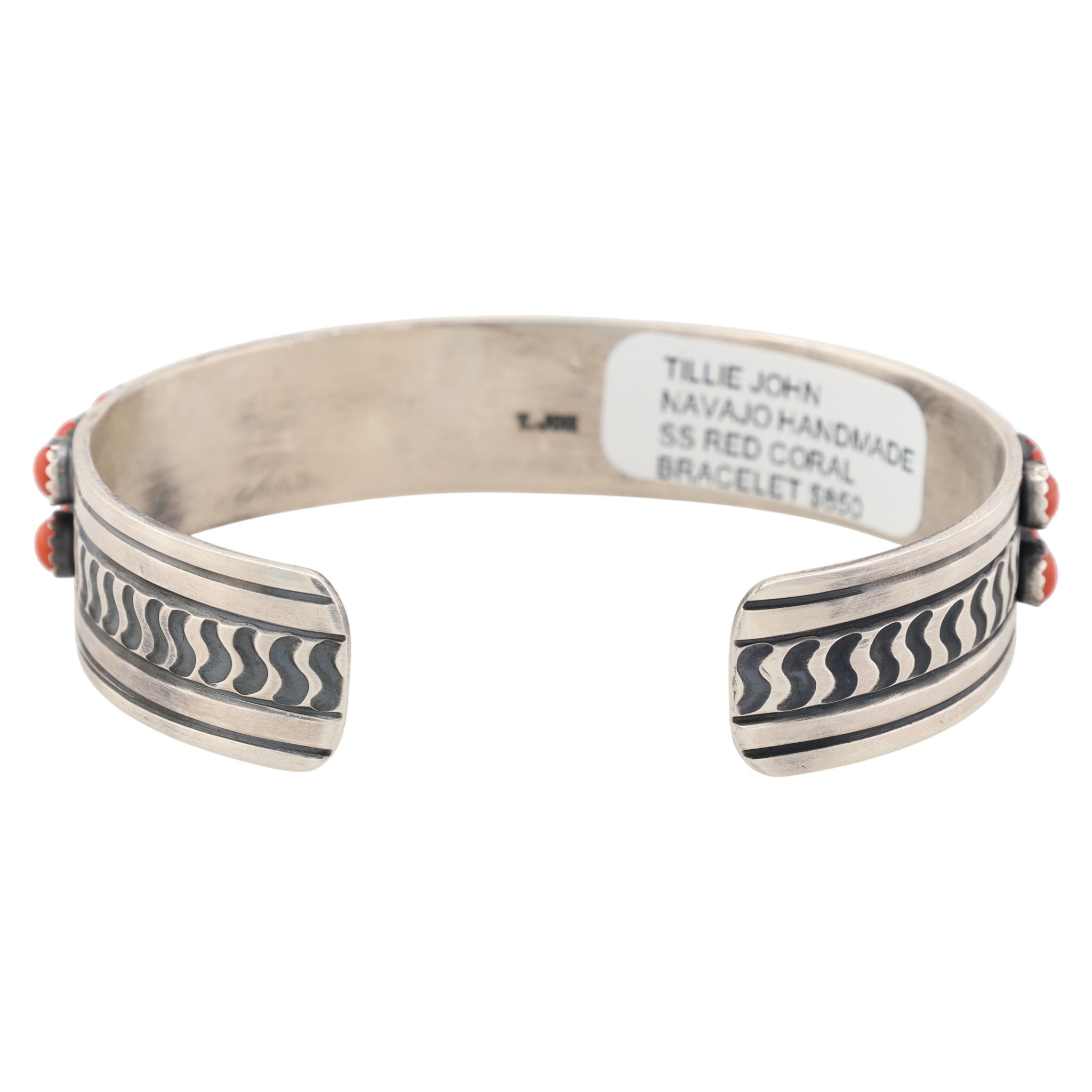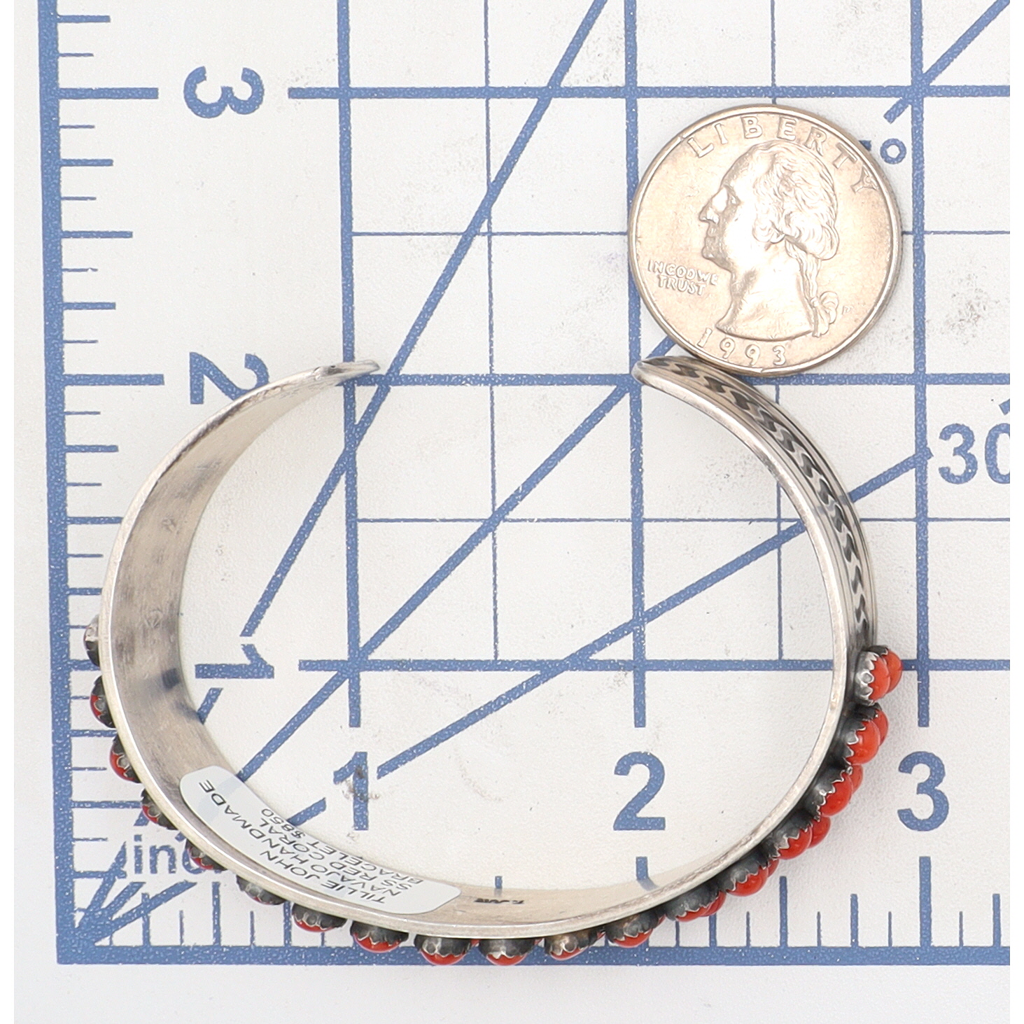 A Navajo handmade sterling silver cuff bracelet by Tillie Jon, marked “T. JON”, adorned with two rows of red Mediterranean coral cabochons, weighing 31g and measuring approximately 6 1/2 inches.