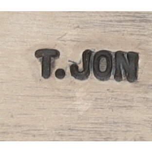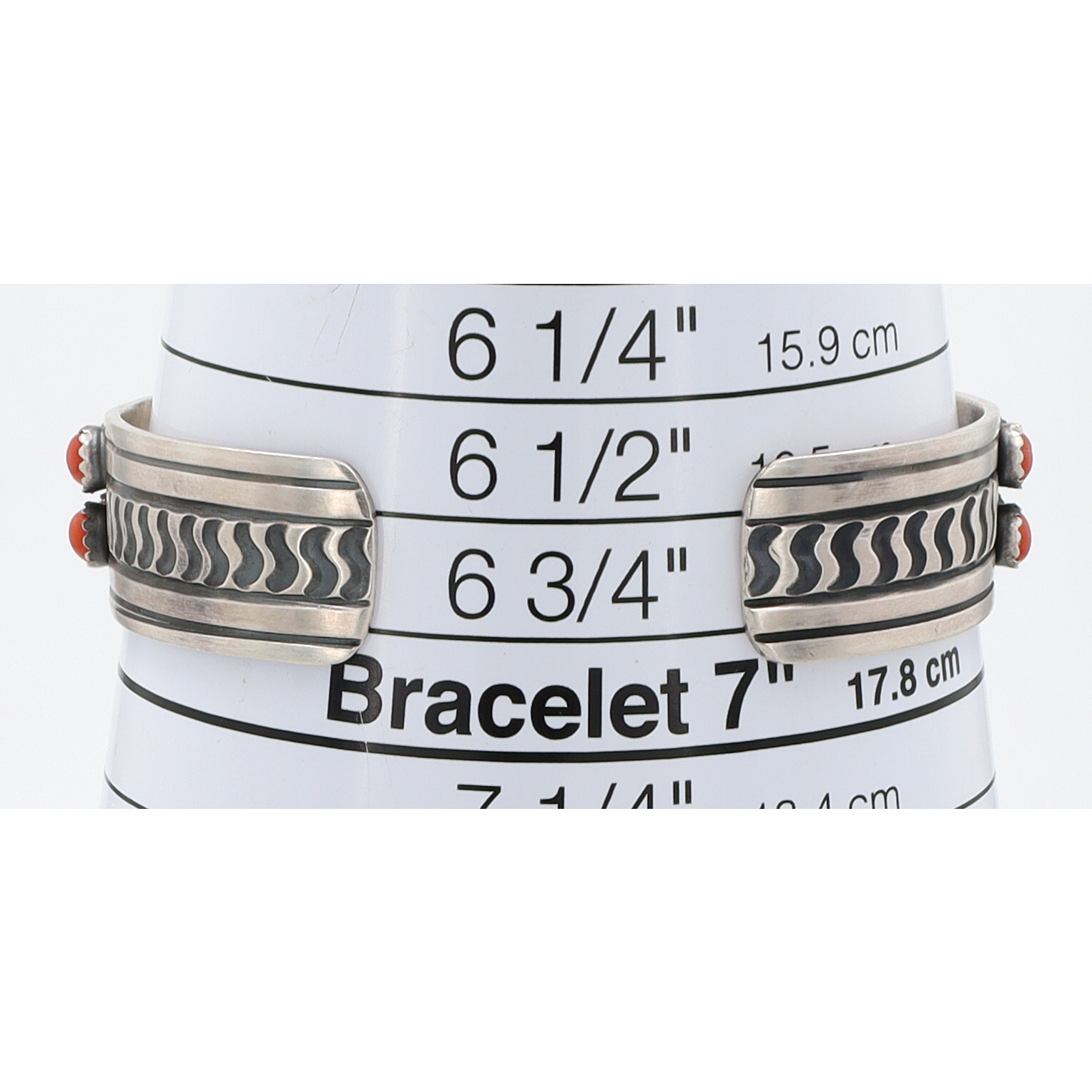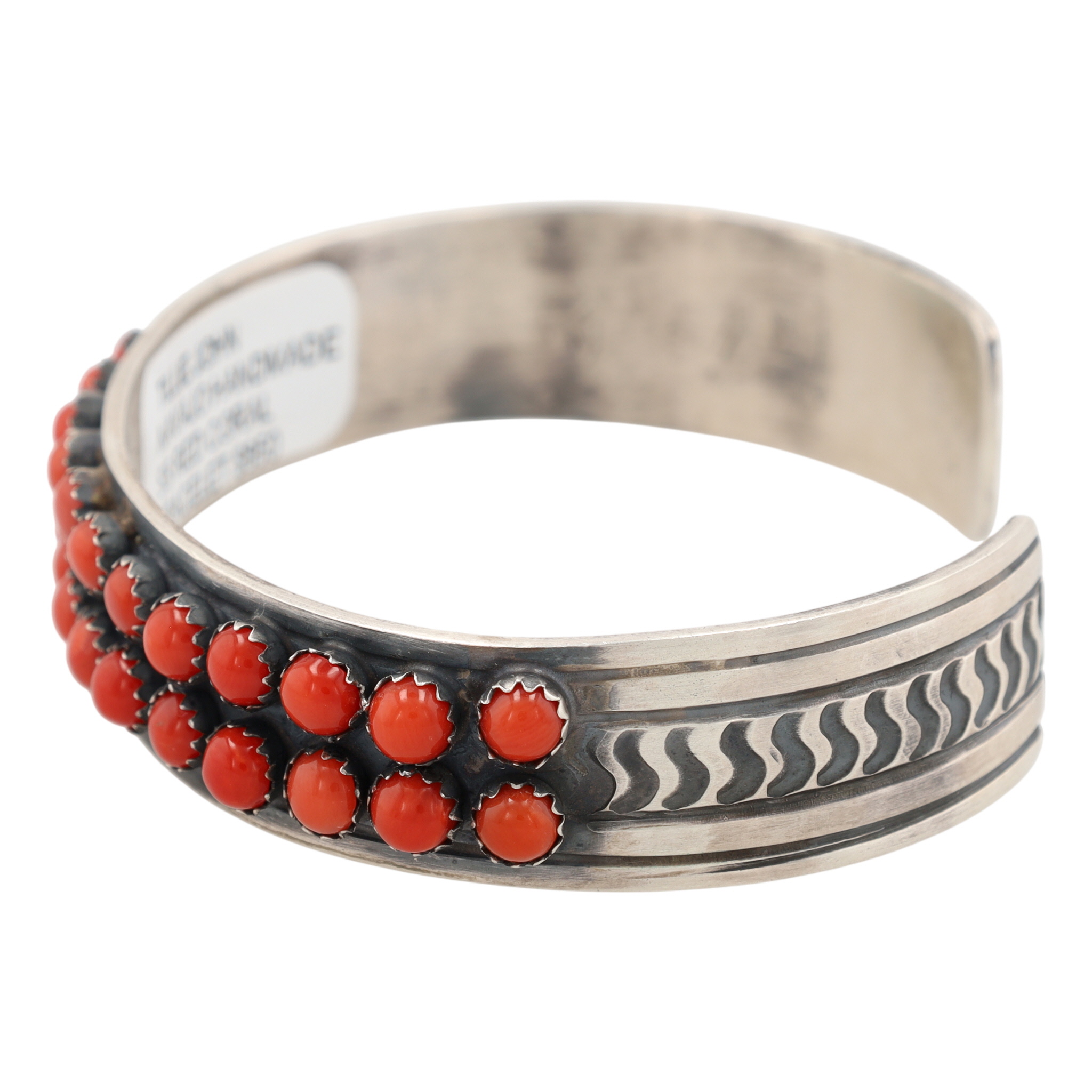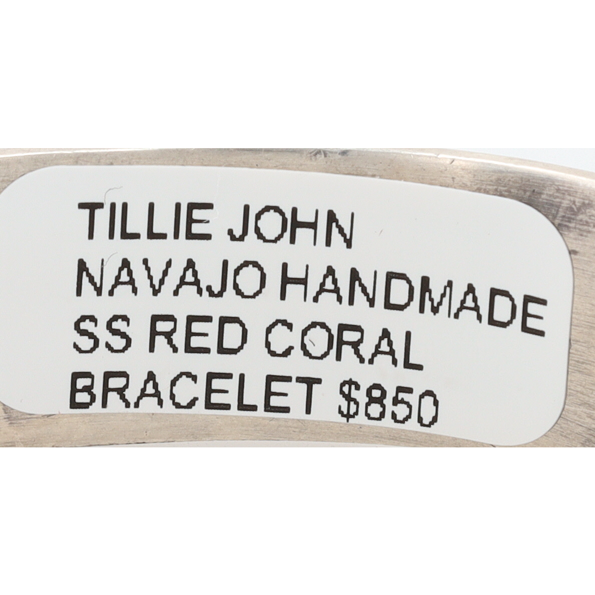 A Navajo handmade sterling silver cuff bracelet by Tillie Jon, marked “T. JON”, adorned with two rows of red Mediterranean coral cabochons, weighing 31g and measuring approximately 6 1/2 inches.