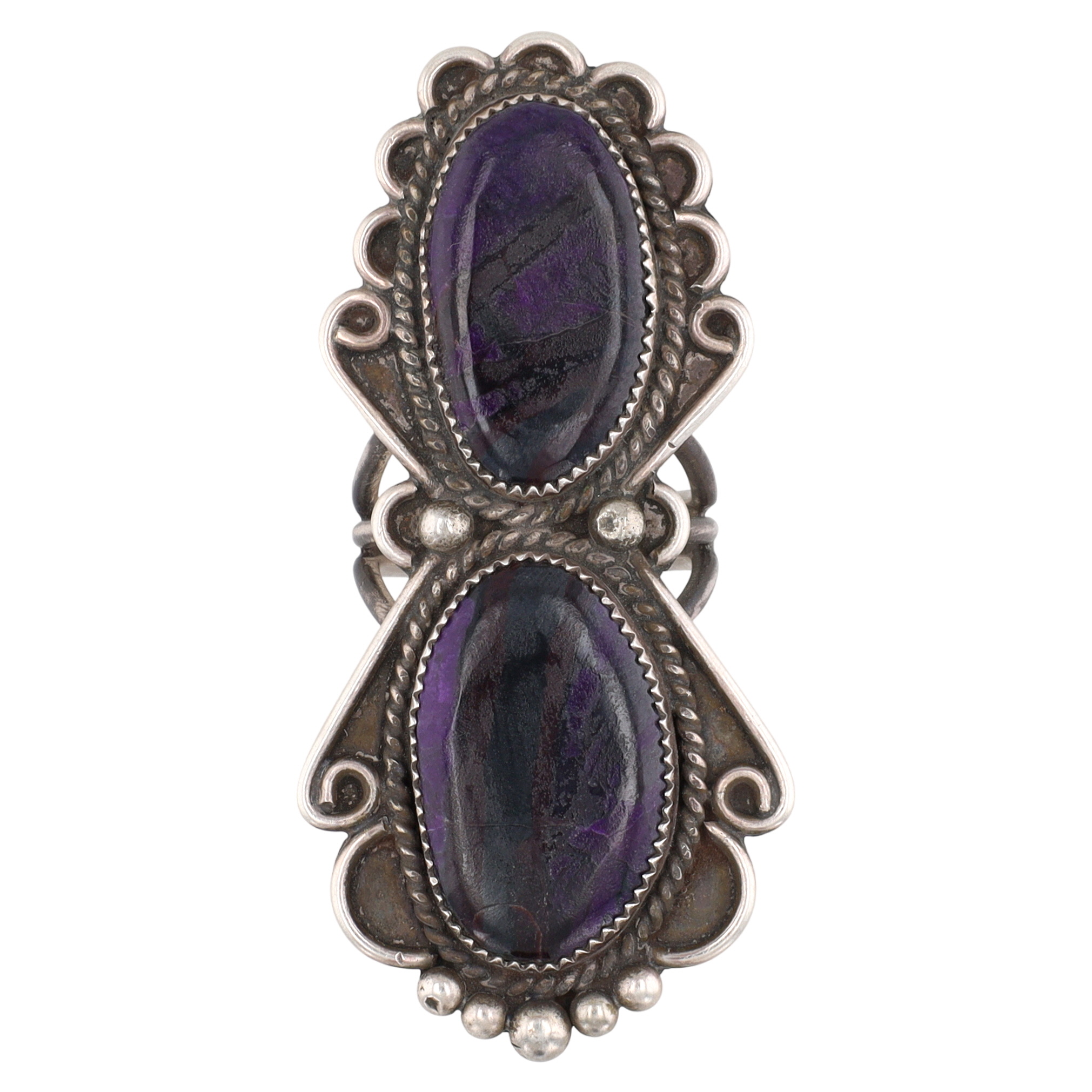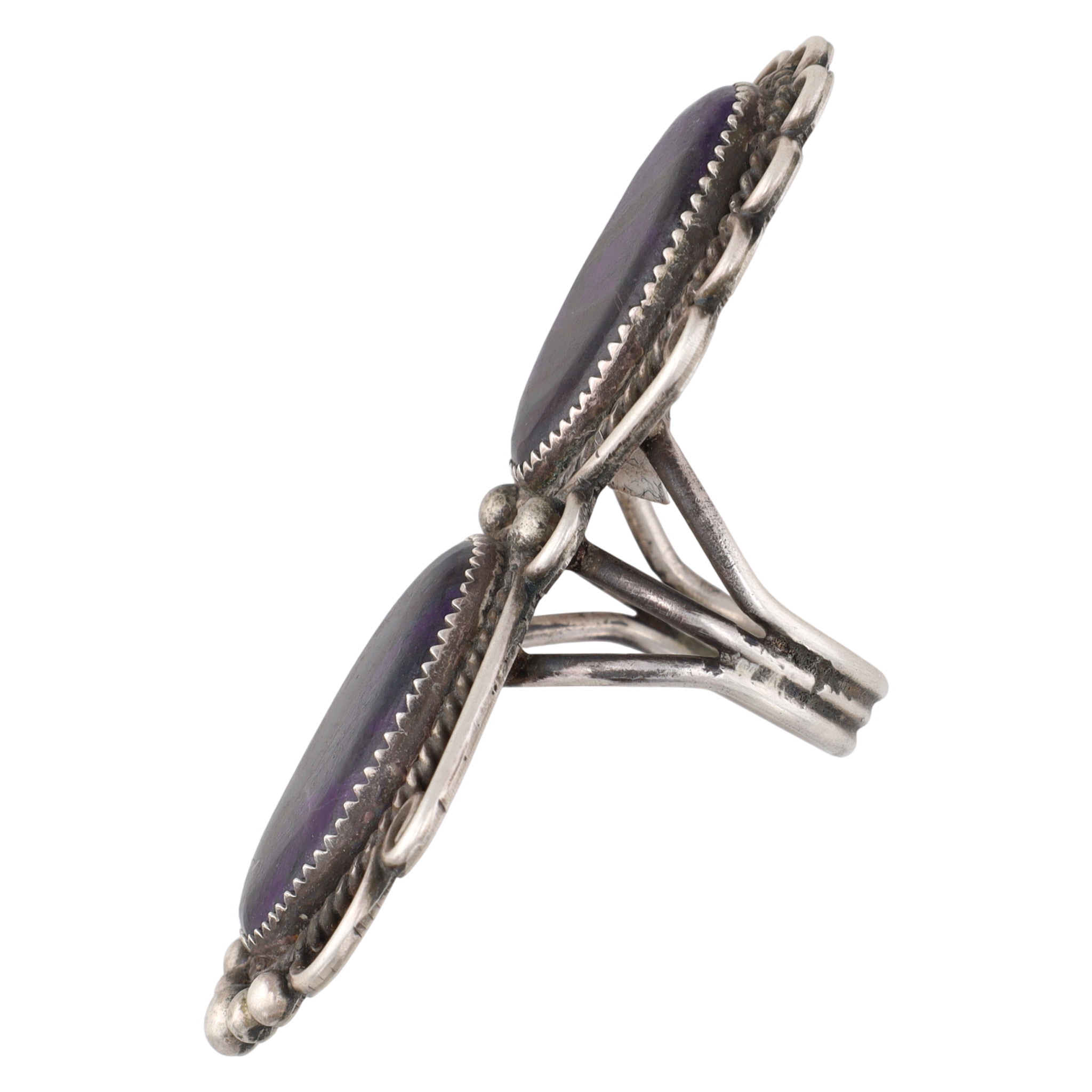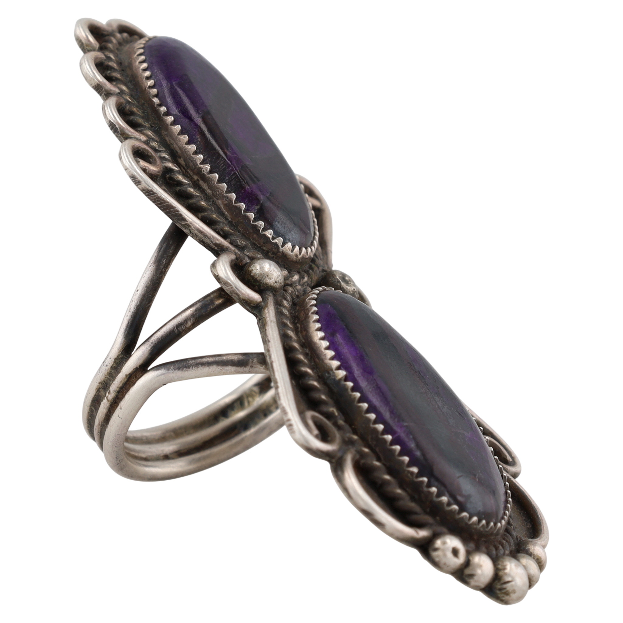 A Lee Brown Navajo sterling silver ring, weighing 17.5g, ring size US 8, and approximately 2.5 inches long, features two oval sugilite, inscribed “STERLING” and “LB”, with a label displaying “Lee Brown”