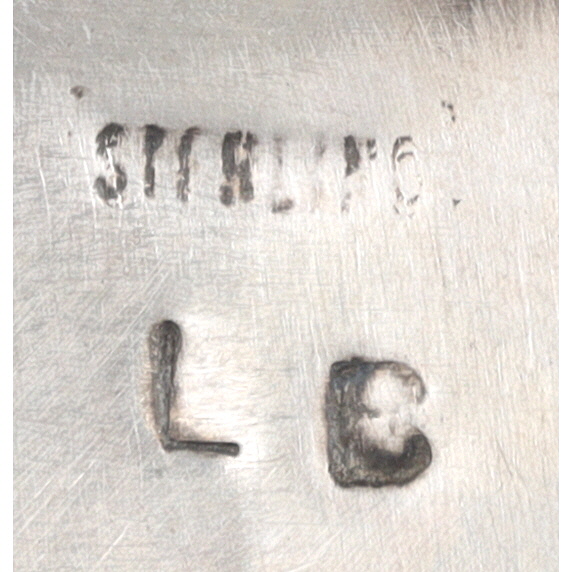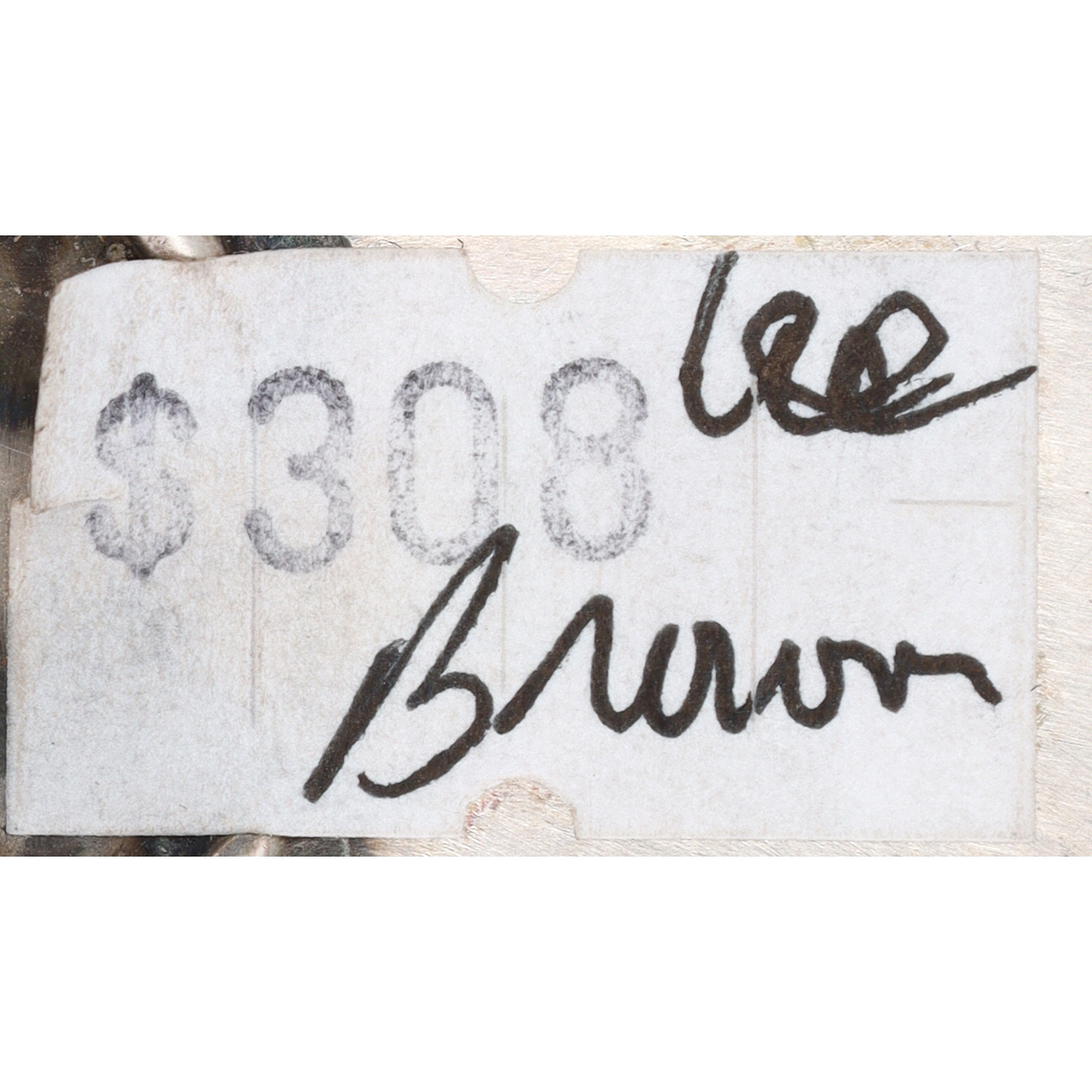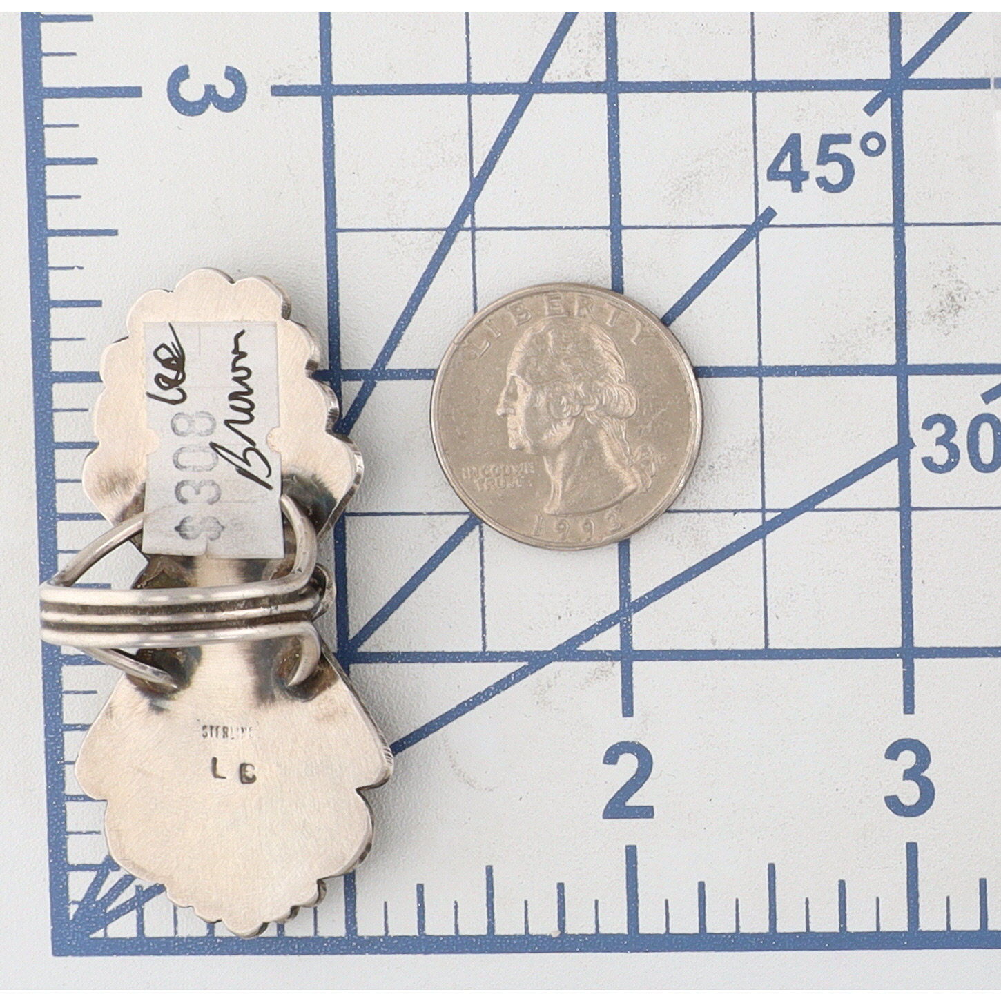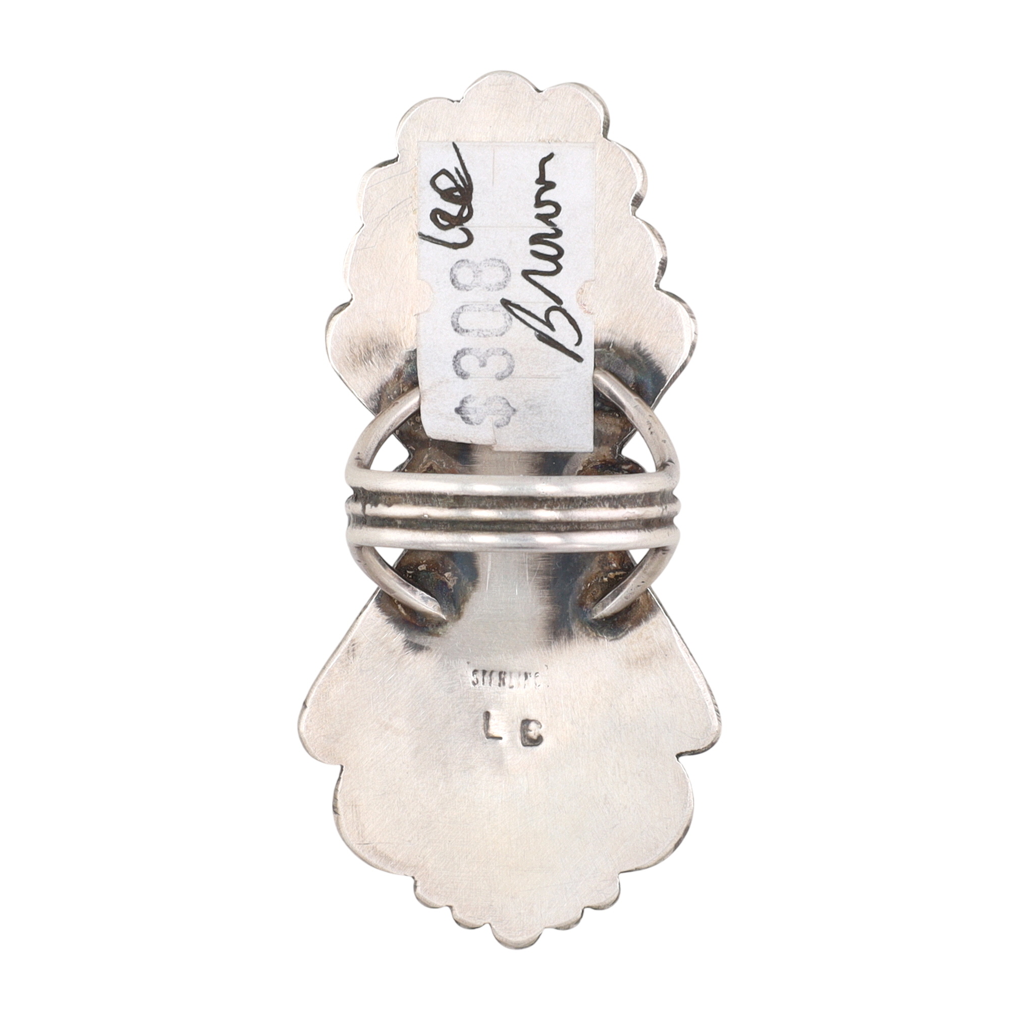 A Lee Brown Navajo sterling silver ring, weighing 17.5g, ring size US 8, and approximately 2.5 inches long, features two oval sugilite, inscribed “STERLING” and “LB”, with a label displaying “Lee Brown”