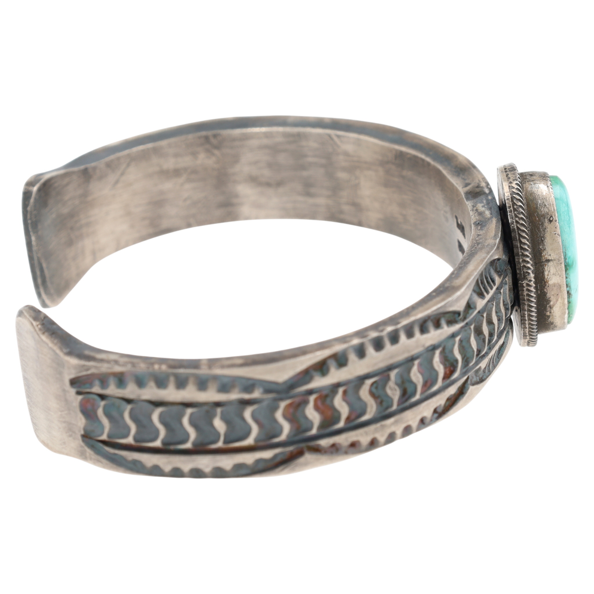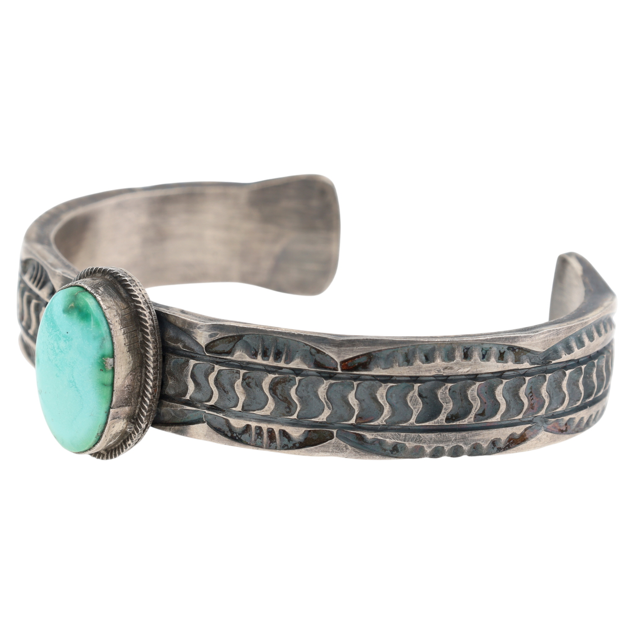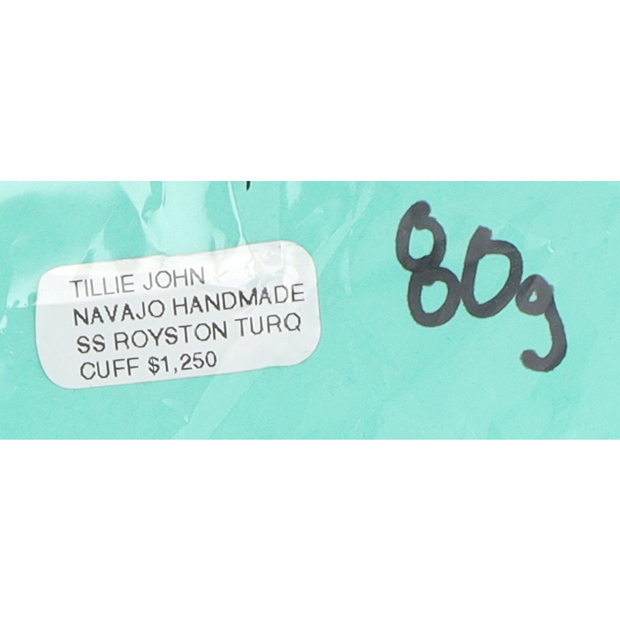 A sterling cuff bracelet with a light blue/green Royston turquoise stone, marked “T. JON” and “STERLING”, identified as Tillie Jon Navajo handmade sterling silver, weighing 80g and fitting a 7″ wrist.