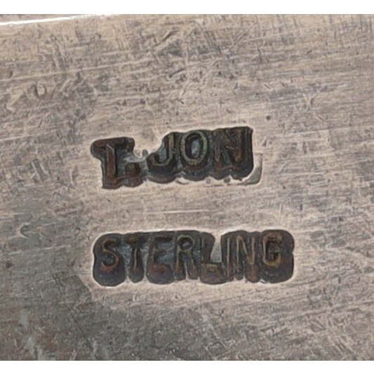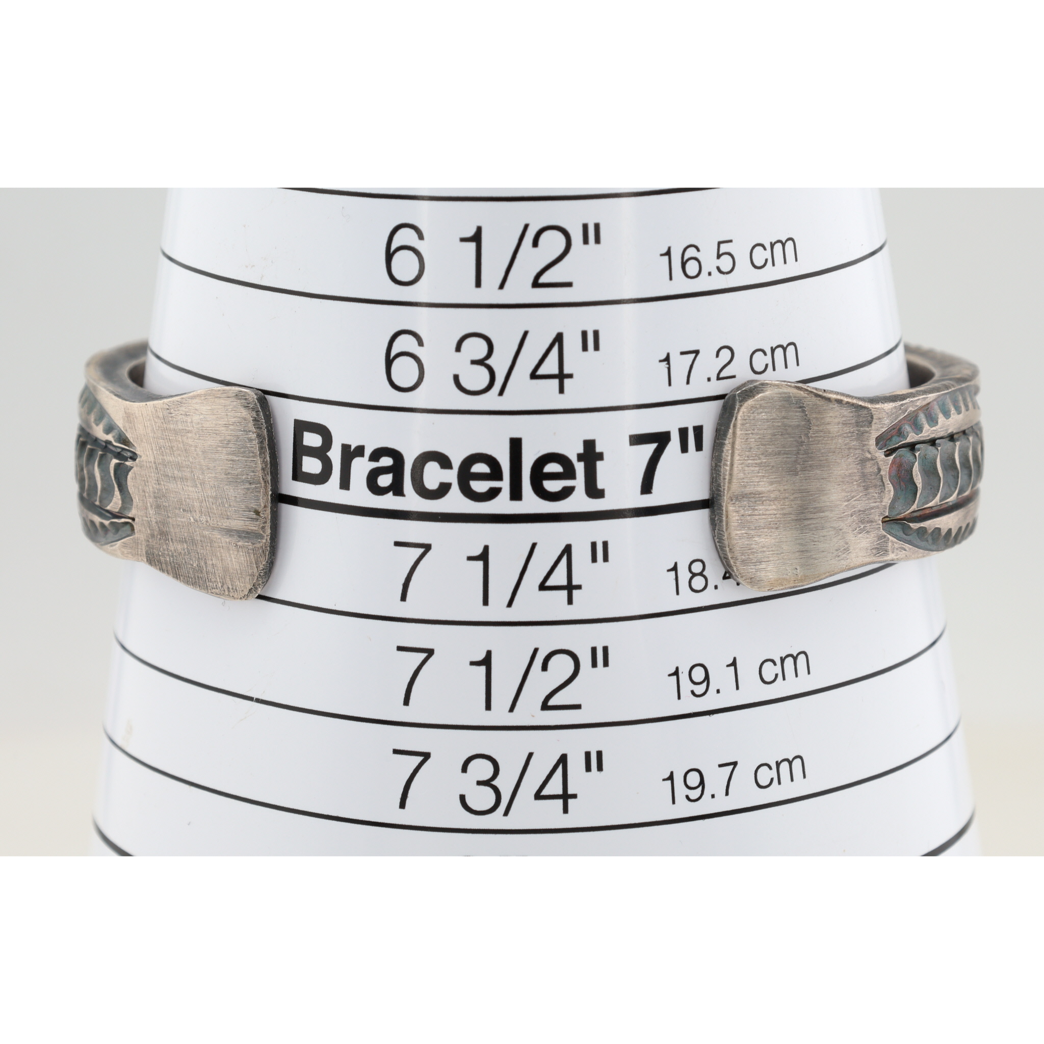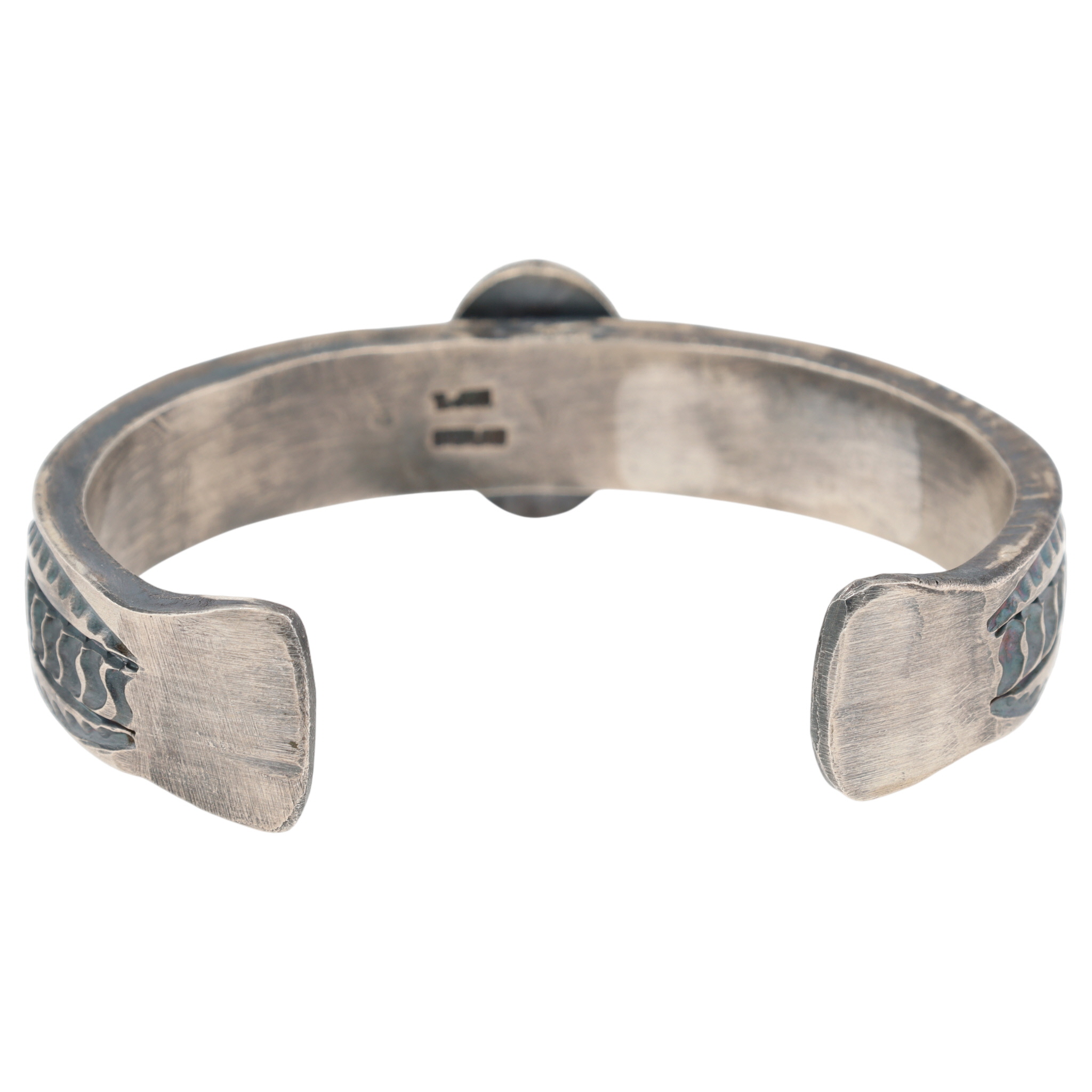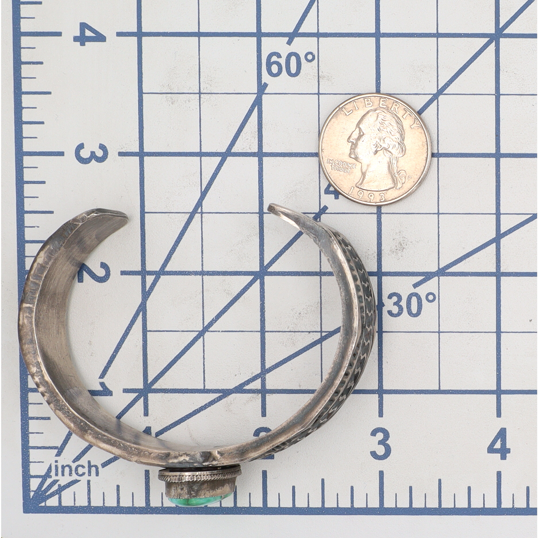 A sterling cuff bracelet with a light blue/green Royston turquoise stone, marked “T. JON” and “STERLING”, identified as Tillie Jon Navajo handmade sterling silver, weighing 80g and fitting a 7″ wrist.