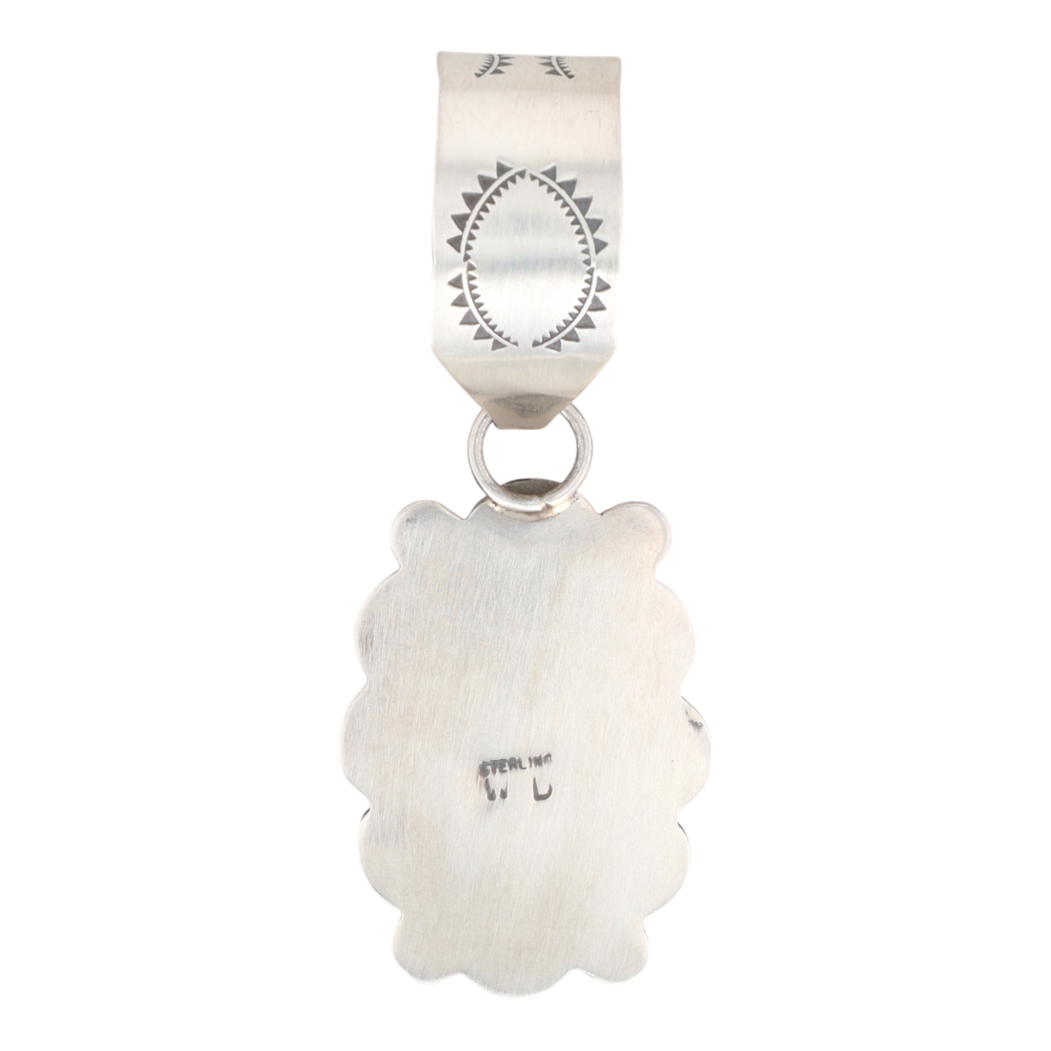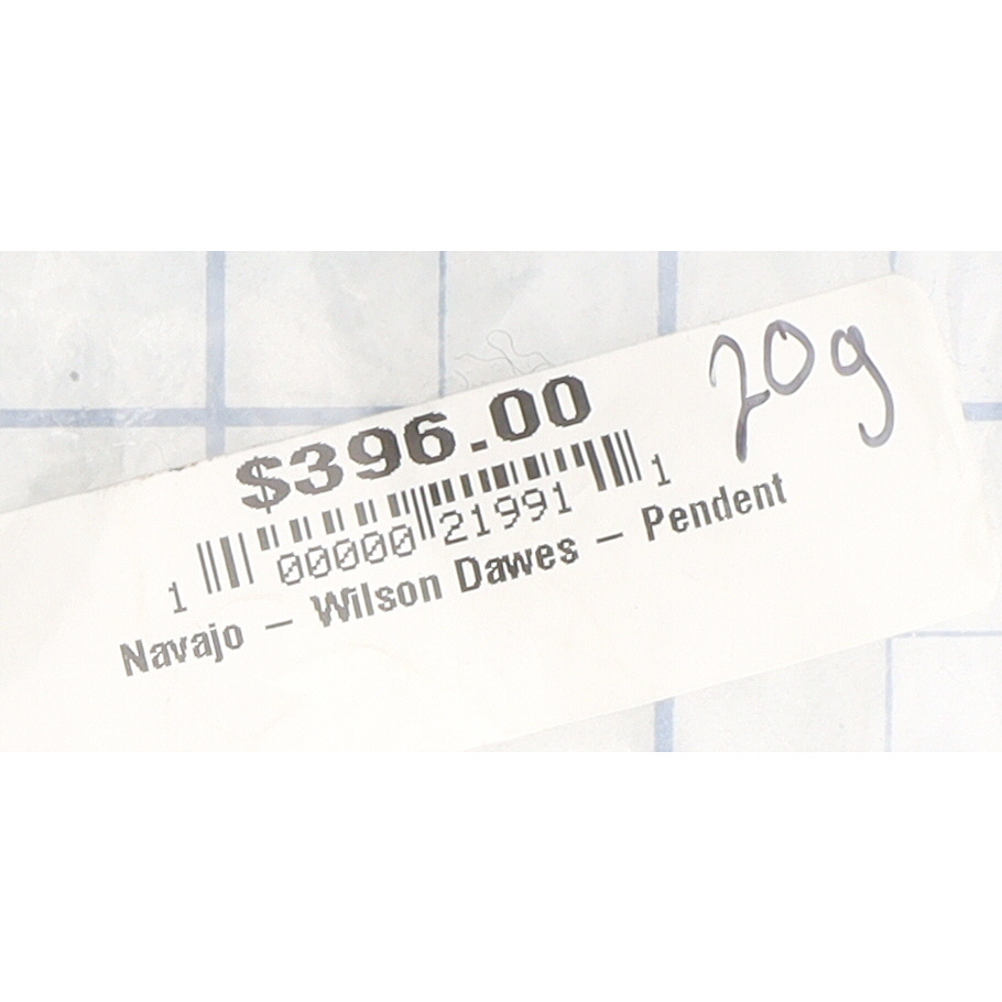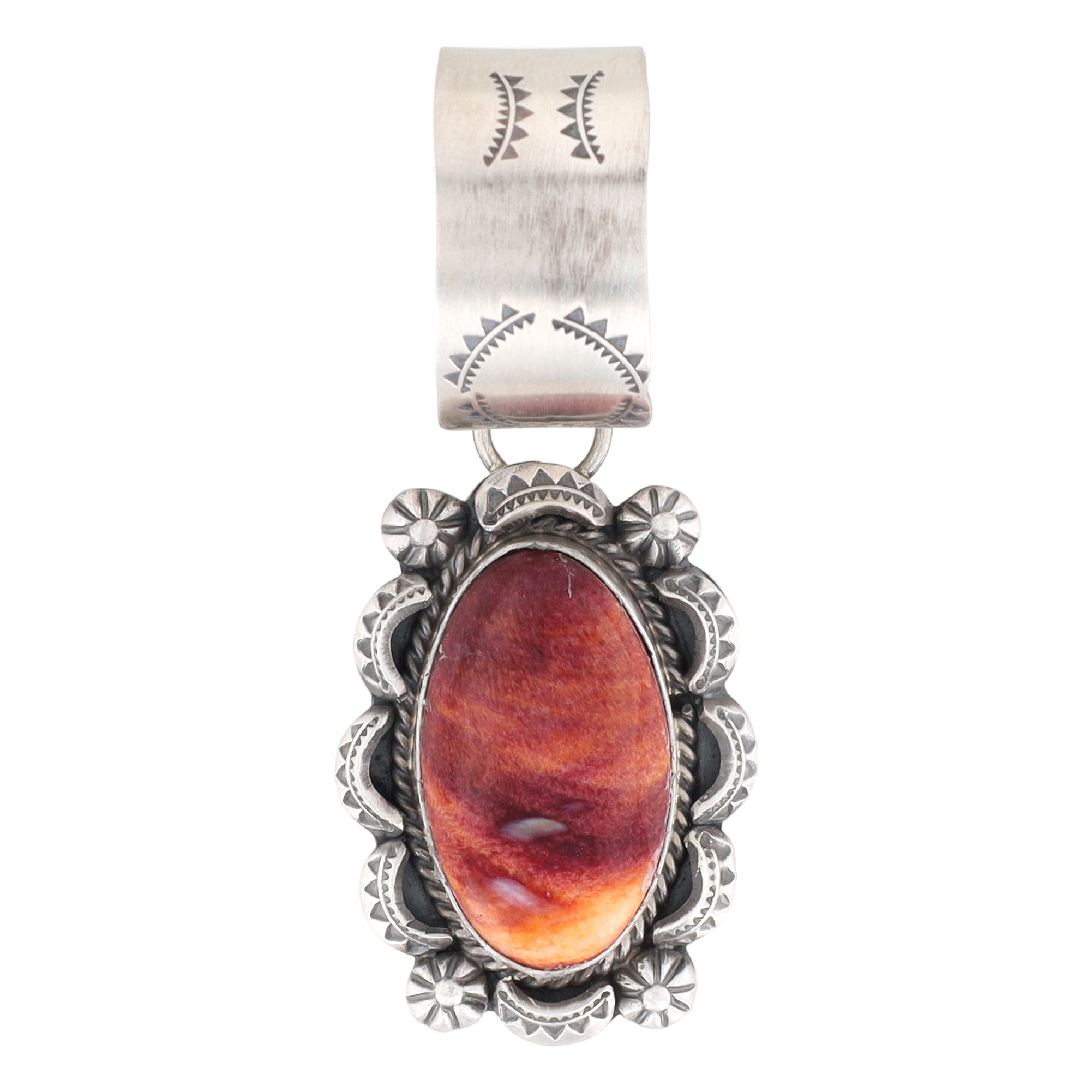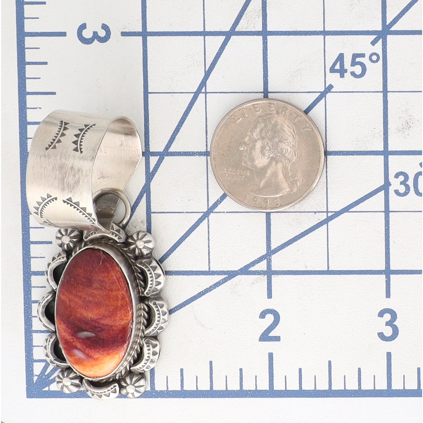 A Navajo sterling silver pendant, marked ‘STERLING’ and ‘W.D.’, features a reddish-orange oval spiny oyster stone, identified as a Wilson Dawes piece, weighing 20g and measuring approximately 2.5 inches long.
