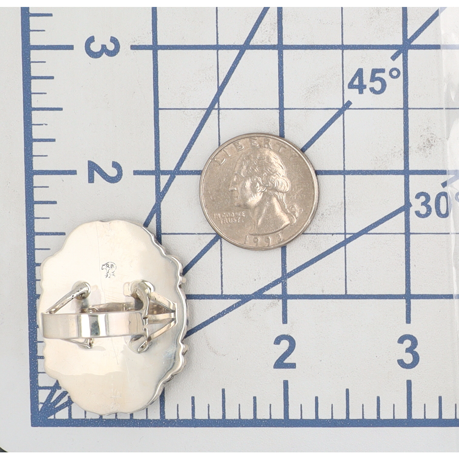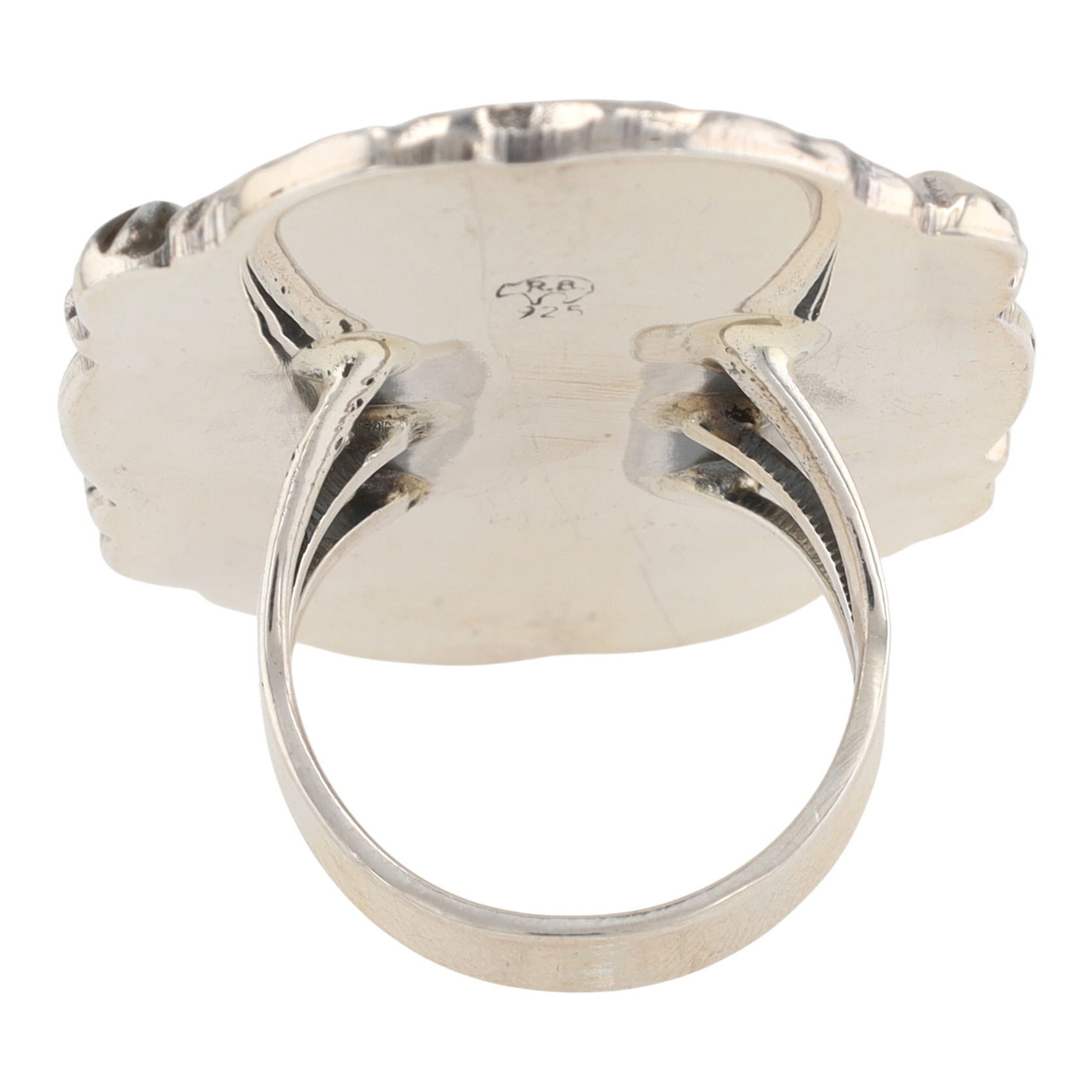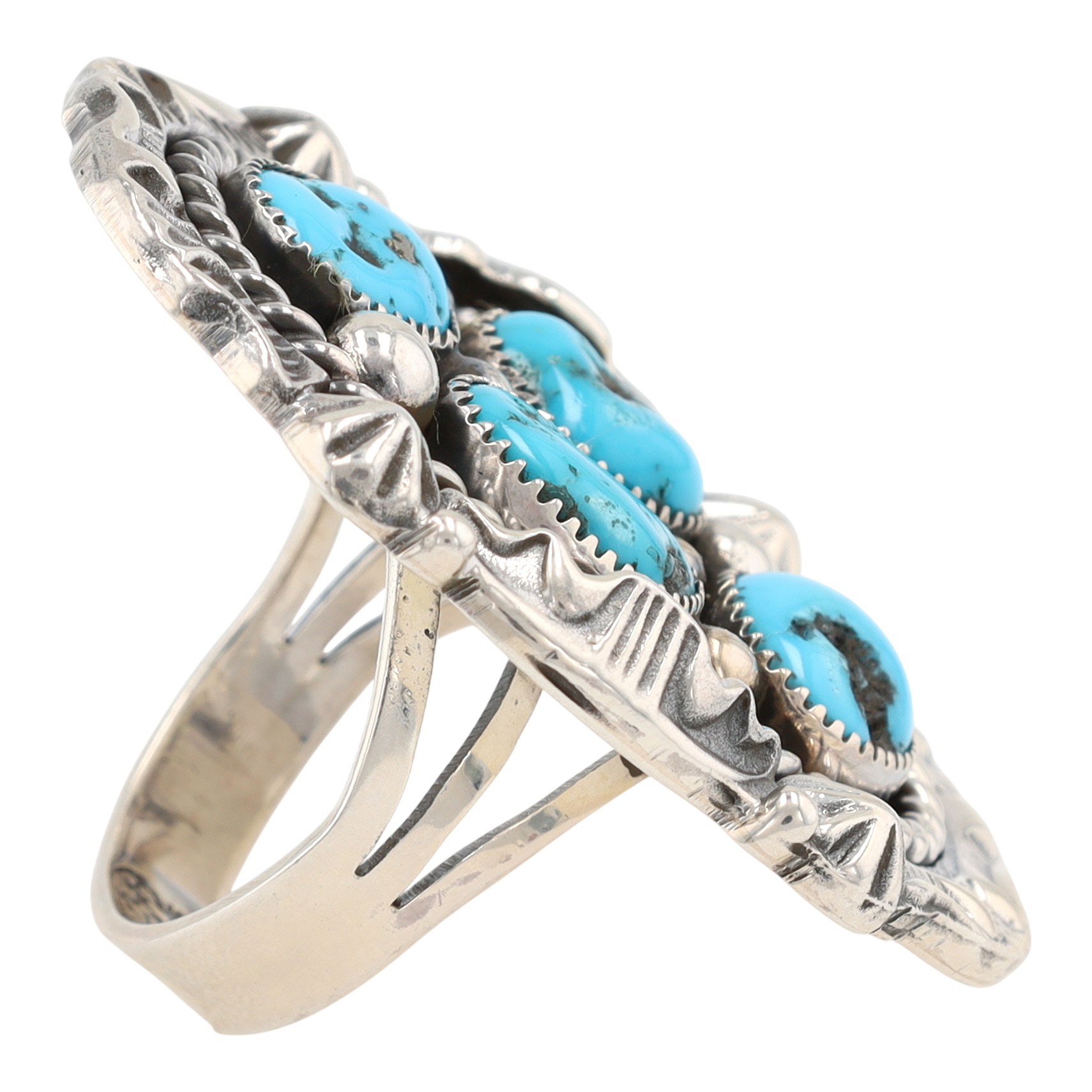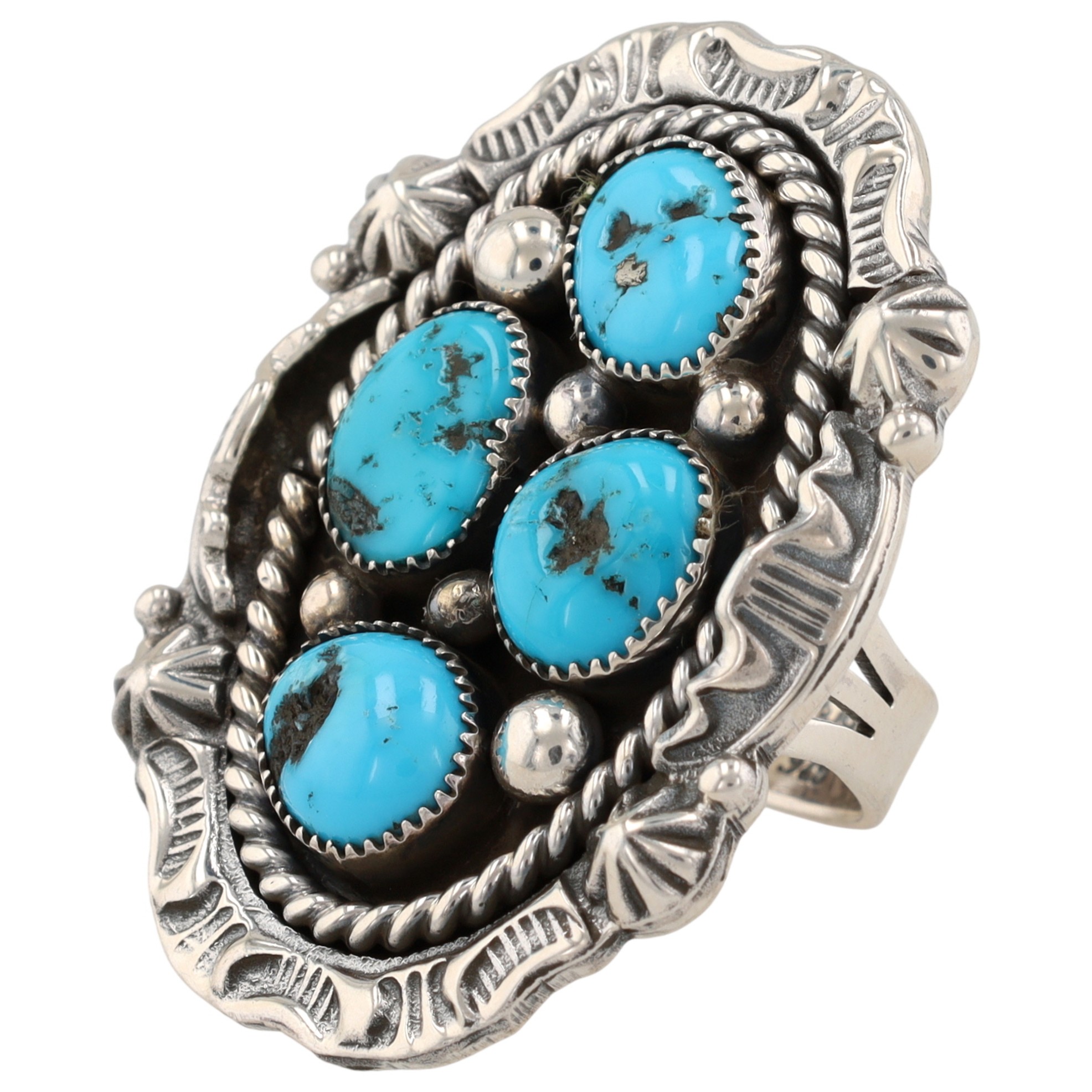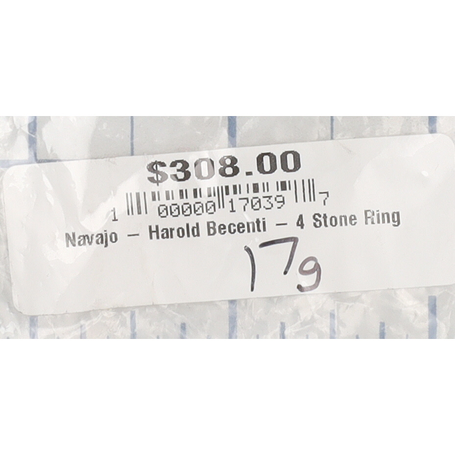 A Navajo Harold Becenti sterling ring for Running Bear Shop, featuring four turquoise stones with black matrix, inscribed with a maker’s mark of “R.B” within a bear outline and “925”, weighing 17g, with a face approximately 1.5 inches long, and a ring size US 6.5.