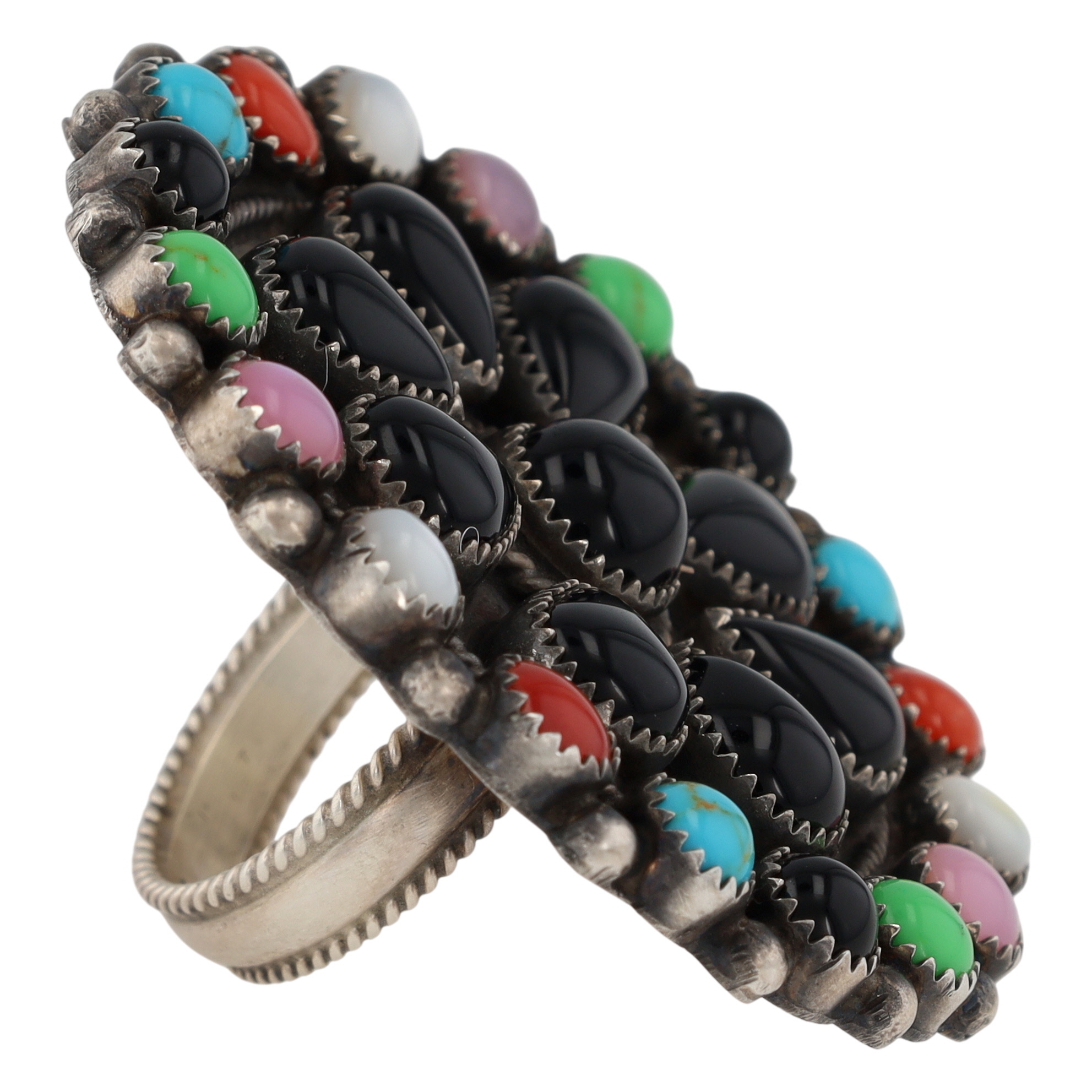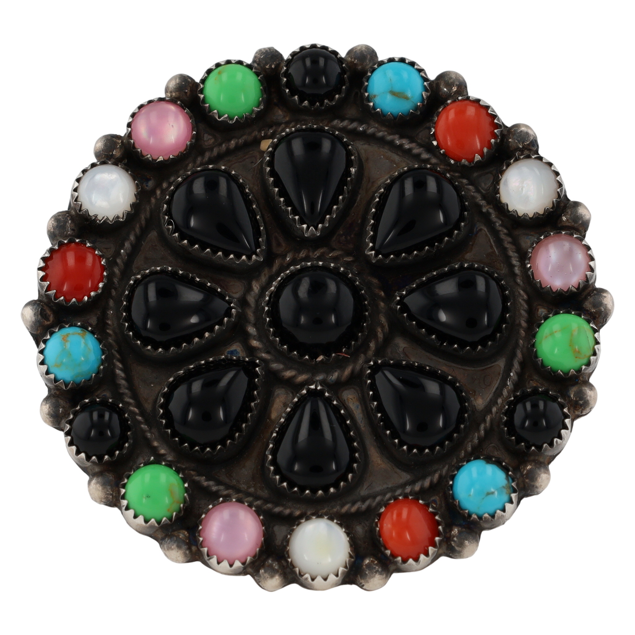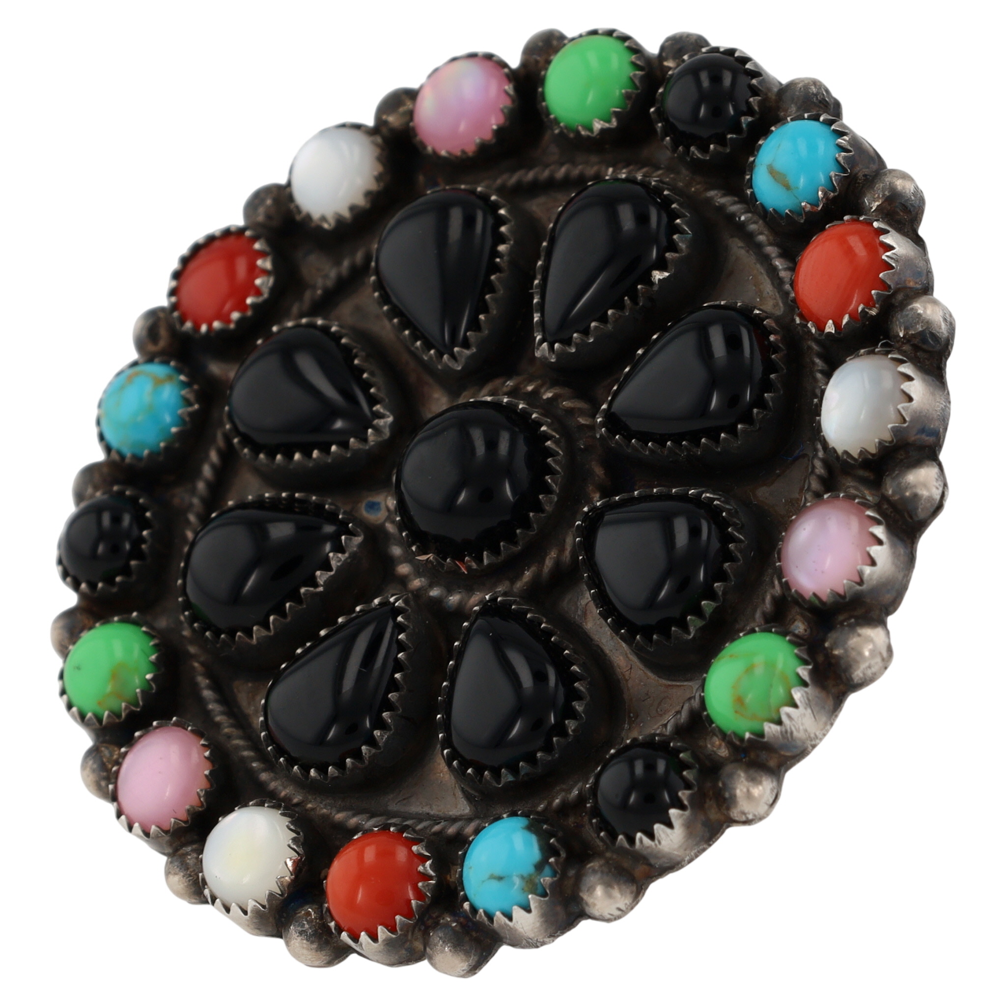 An Adjustable sterling silver cluster ring featuring black teardrop onyx stones surrounded by round cabochon stones of gaspeite, turquoise, coral, mother of pearl, stamped ‘Sterling’ and ‘DB’ for Devin Brown, approximately 1.5 inches in diameter, 21g, and a core ring size of US 7.
