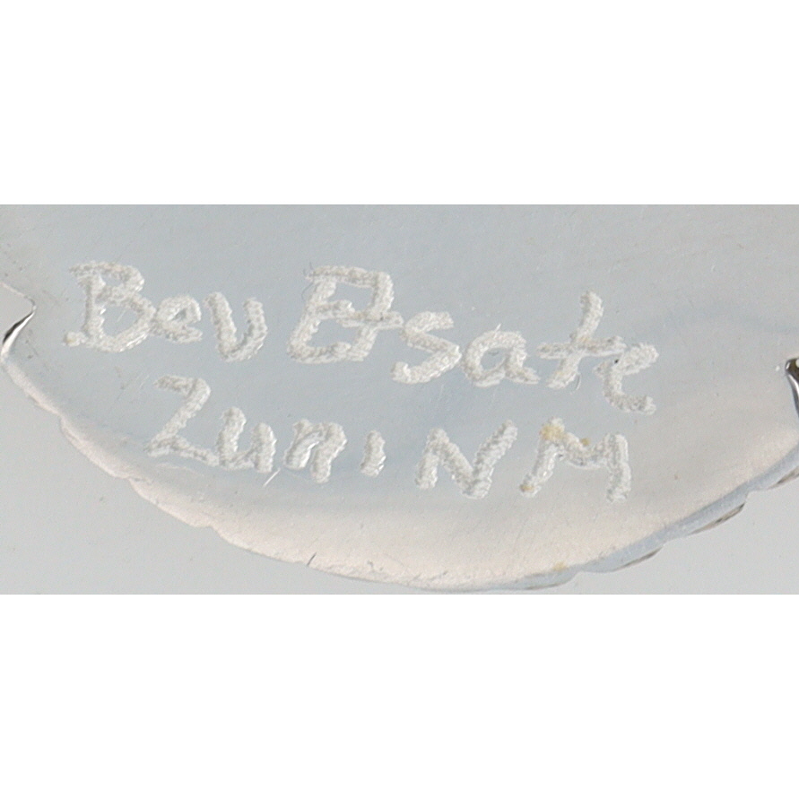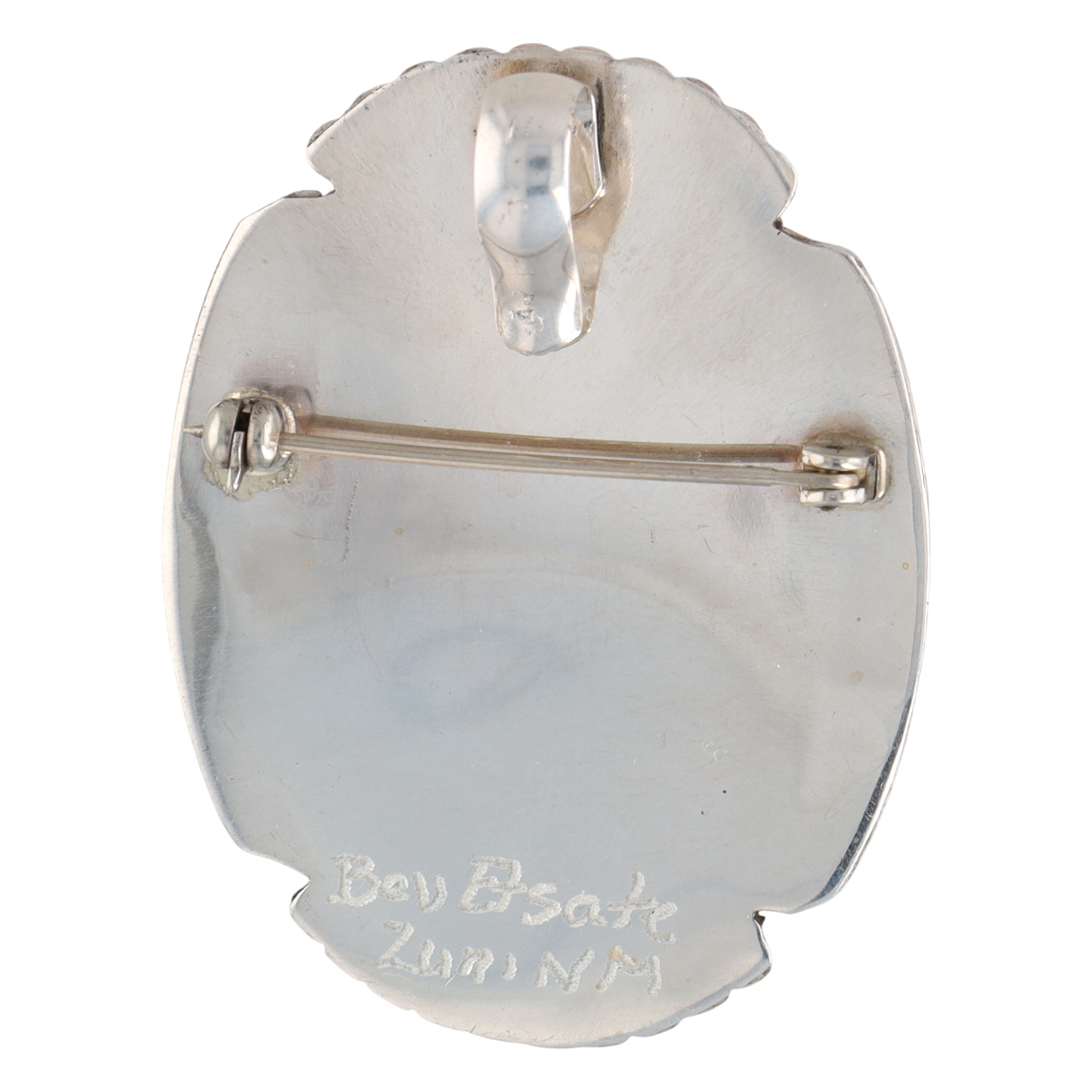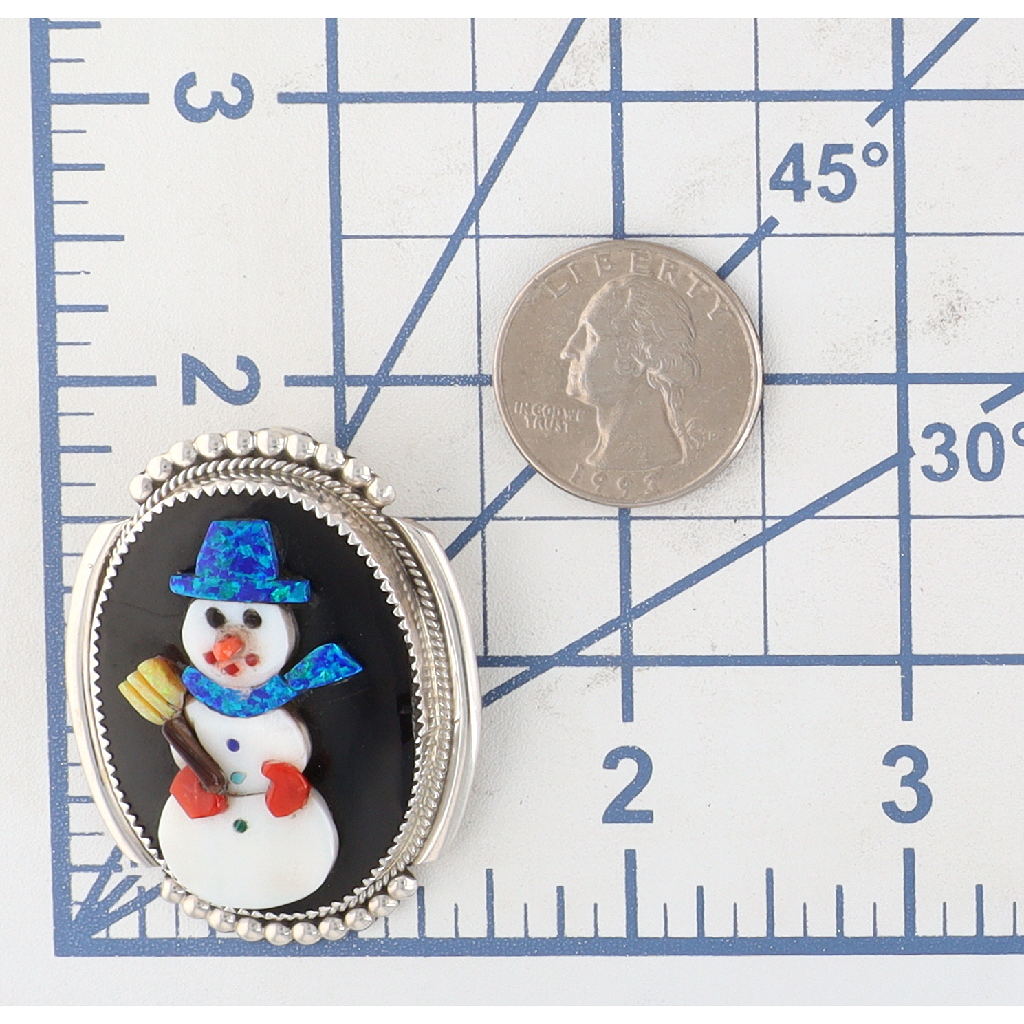 A MUST SEE going into this holiday season! An oval-shaped silver brooch/pendant, 2.5 inches tall and weighing 18g, featuring a white mother-of-pearl snowman with blue opal hat and scarf, red coral mittens, an orange/red coral/spiny oyster nose, and yellow broom that has a handle that may be tigers eye, buttons of lapis/turquoise/malachite, set against a black jet/onyx background, inscribed “Bev Esate Zuni NM” on the back.