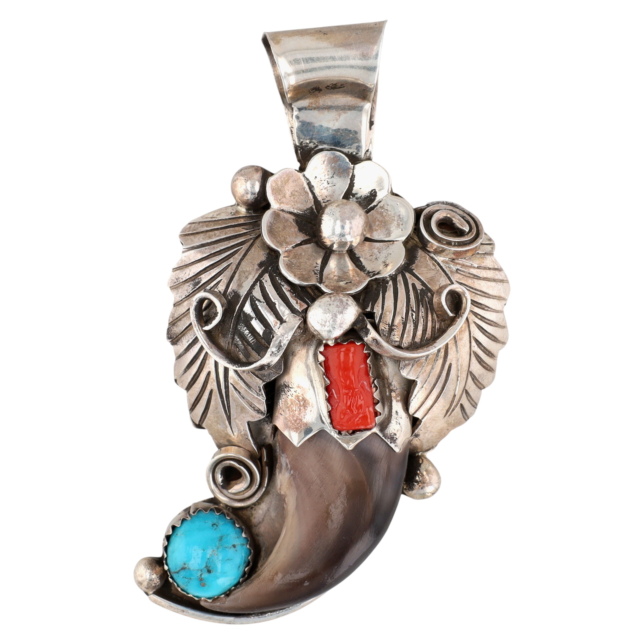 A vintage Jerry Thompson Navajo sterling bear claw pendant with turquoise and coral accents, marked ‘JT, ‘ ‘STERLING’, measuring approximately 2.5 inches long and weighing 17g.