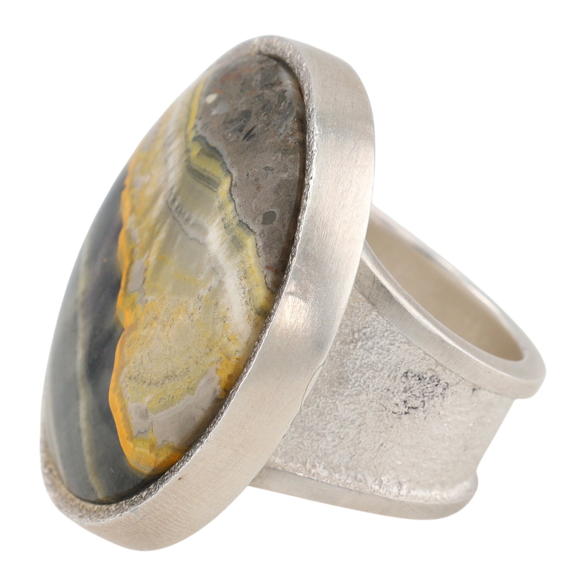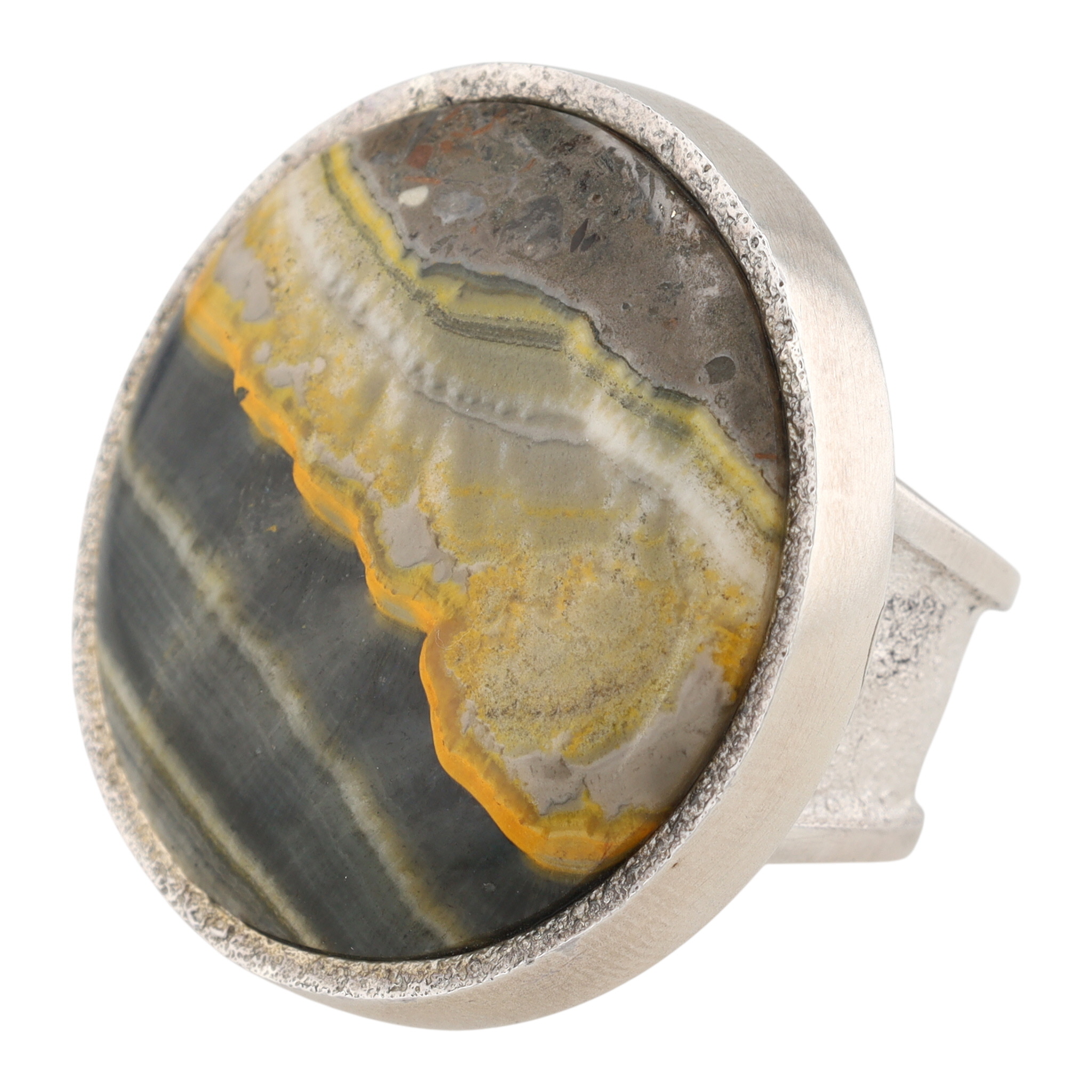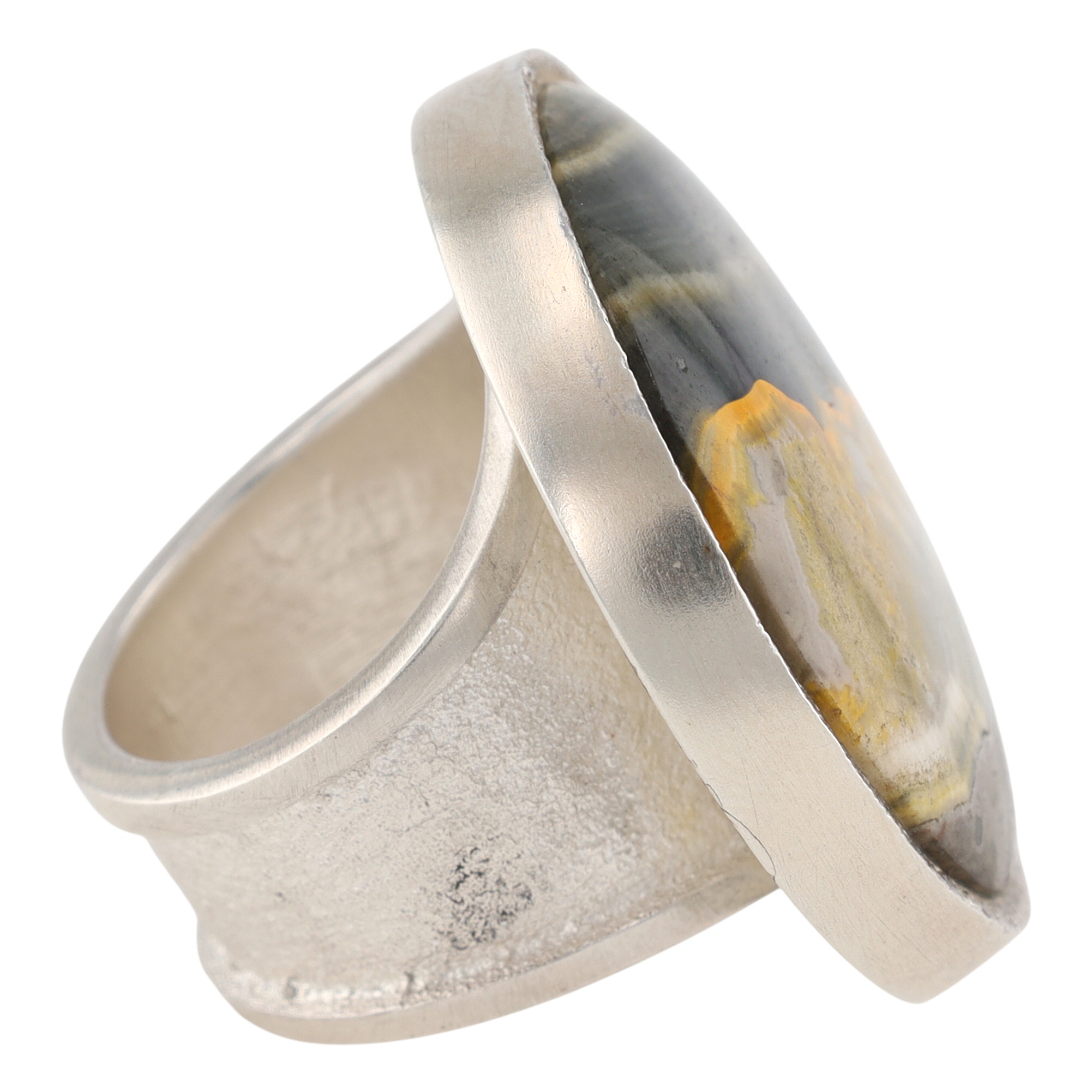 A tufa sterling ring features a large oval Bumblebee Jasper stone with striking bands of bright yellow, gray, white, and dark gray/black, marked “Sterling” and “KGJ”, and sized 7.5, and weighing 35.5g.