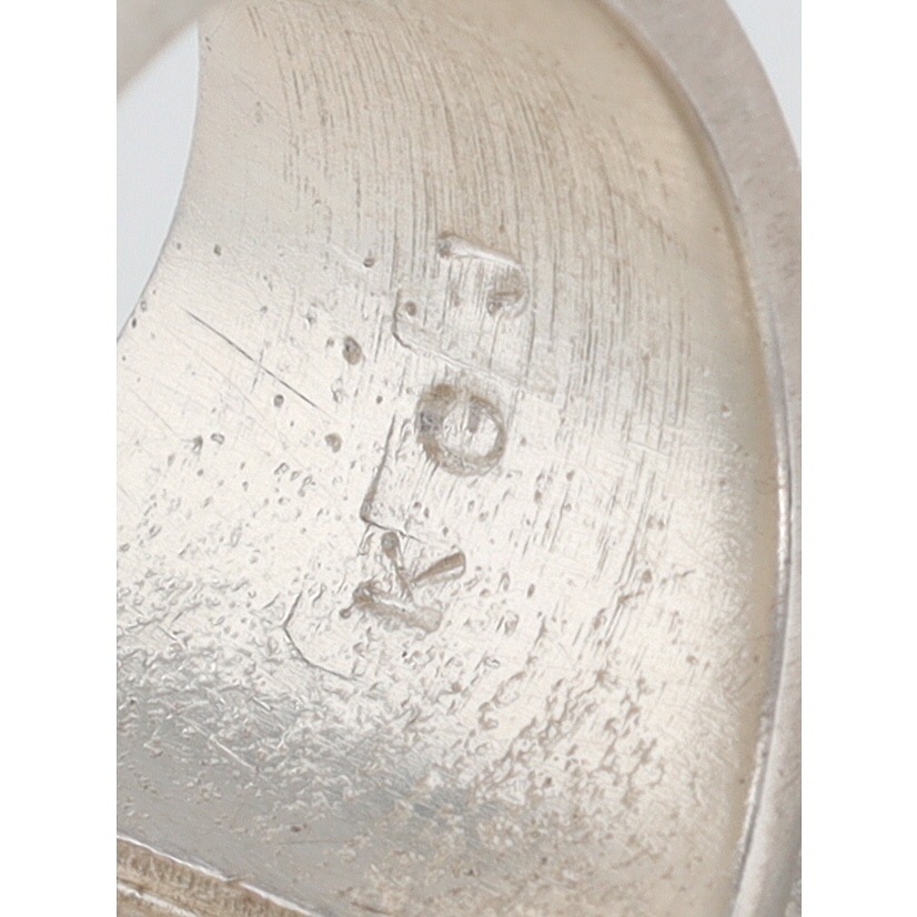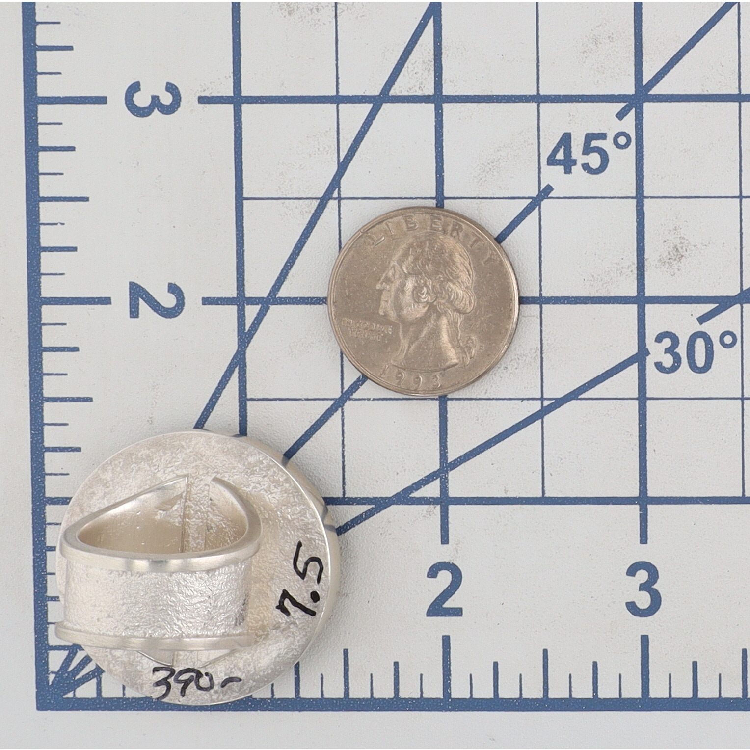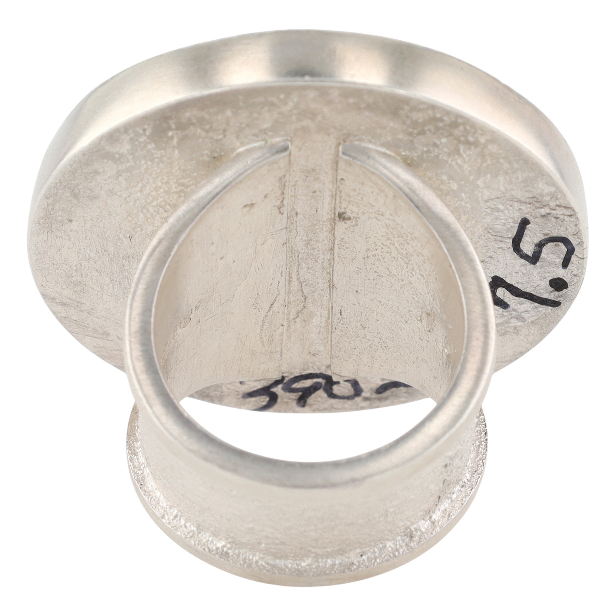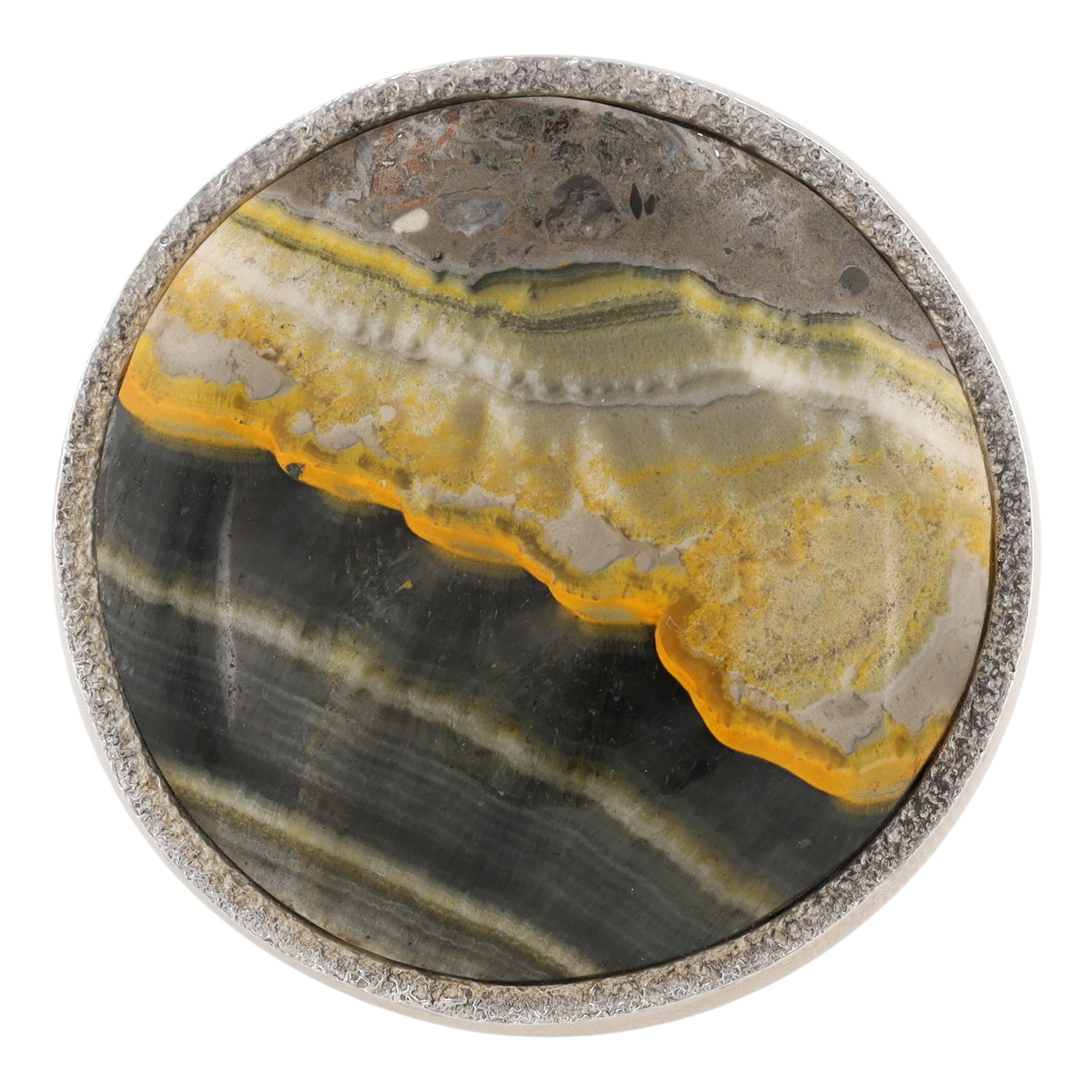 A tufa sterling ring features a large oval Bumblebee Jasper stone with striking bands of bright yellow, gray, white, and dark gray/black, marked “Sterling” and “KGJ”, and sized 7.5, and weighing 35.5g.
