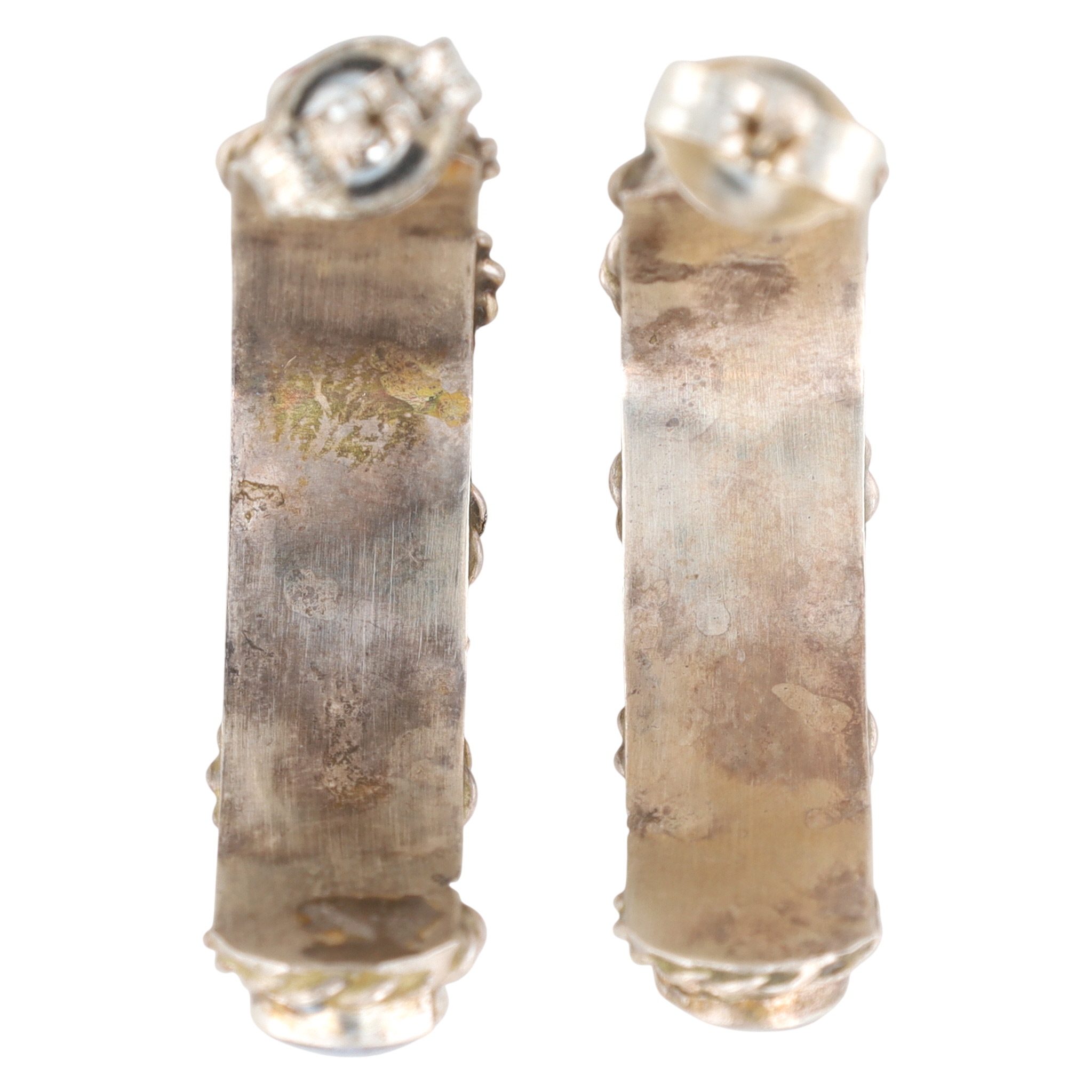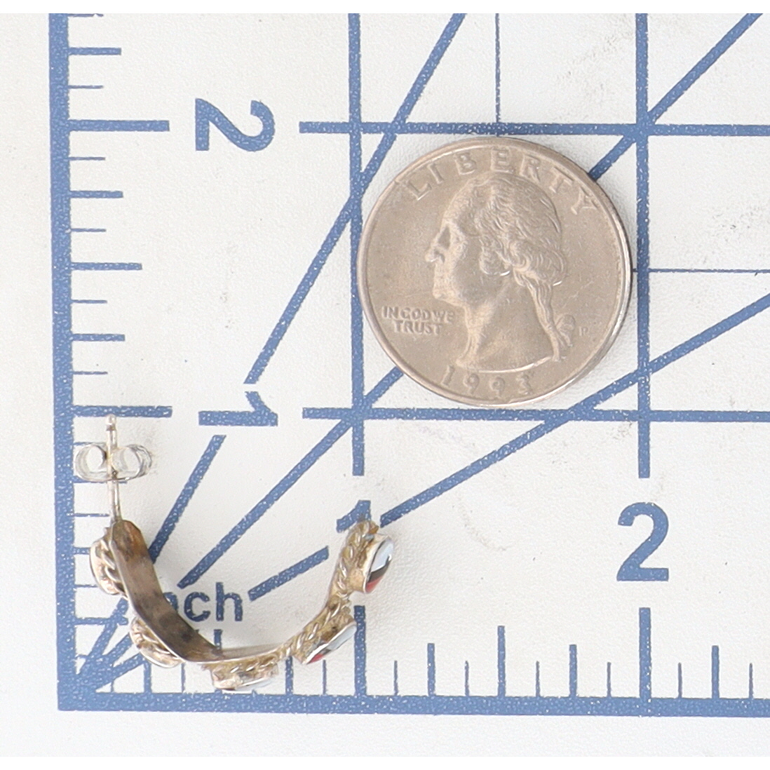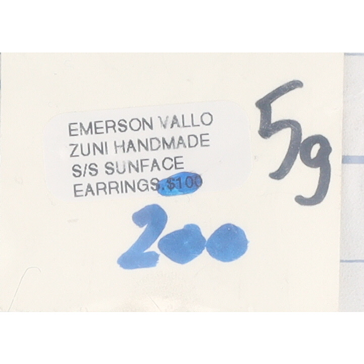 A pair of Zuni handmade sterling earrings featuring multiple Sunface inlay designs in turquoise, coral, mother-of-pearl, onyx, weighing 5g and measuring approximately 1 inch long.