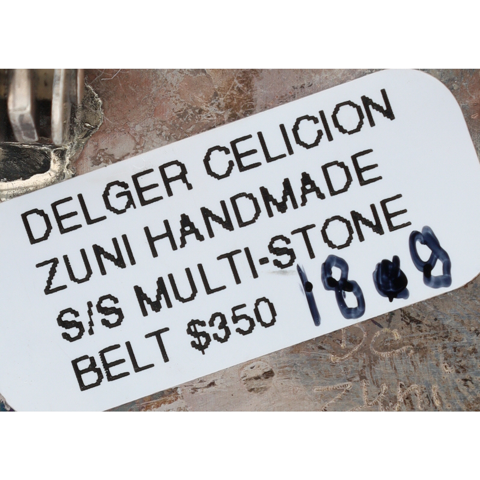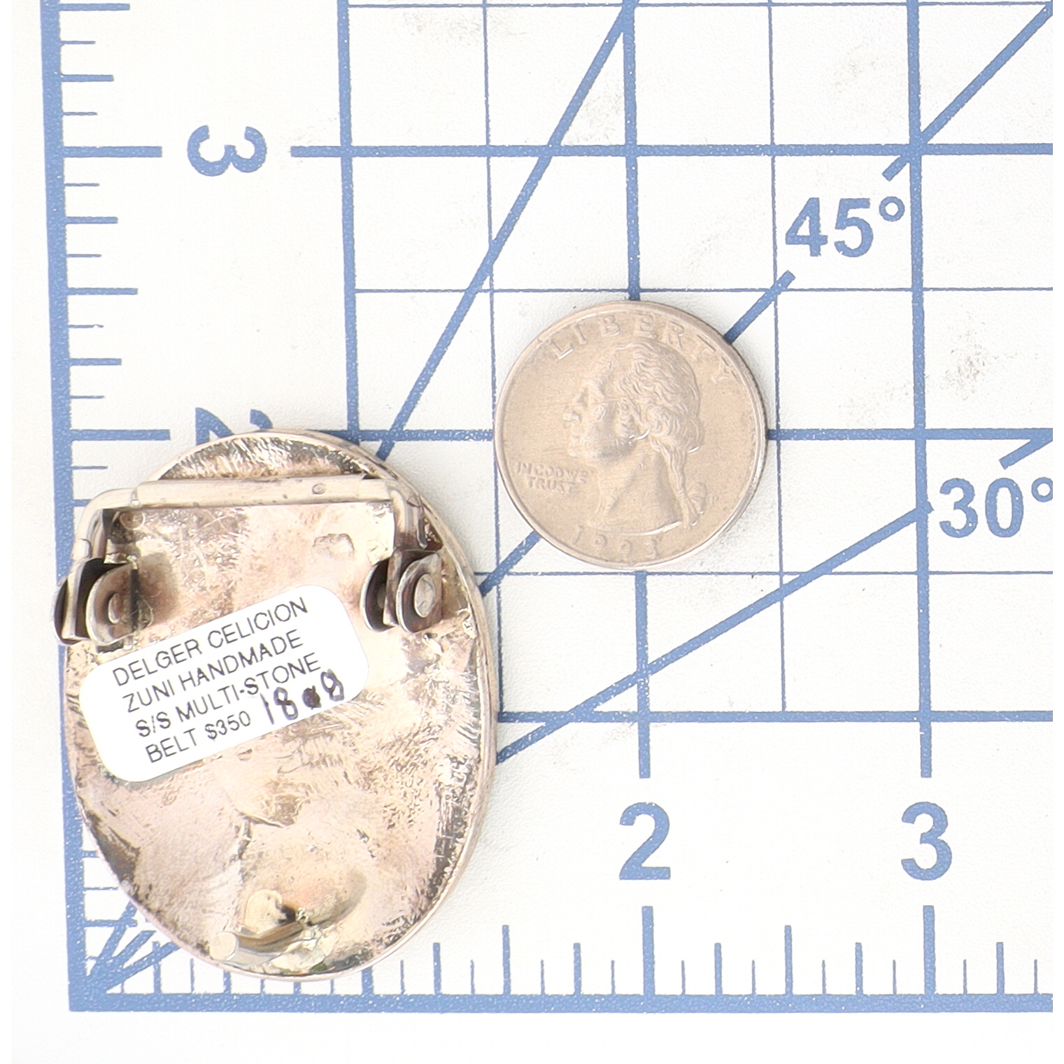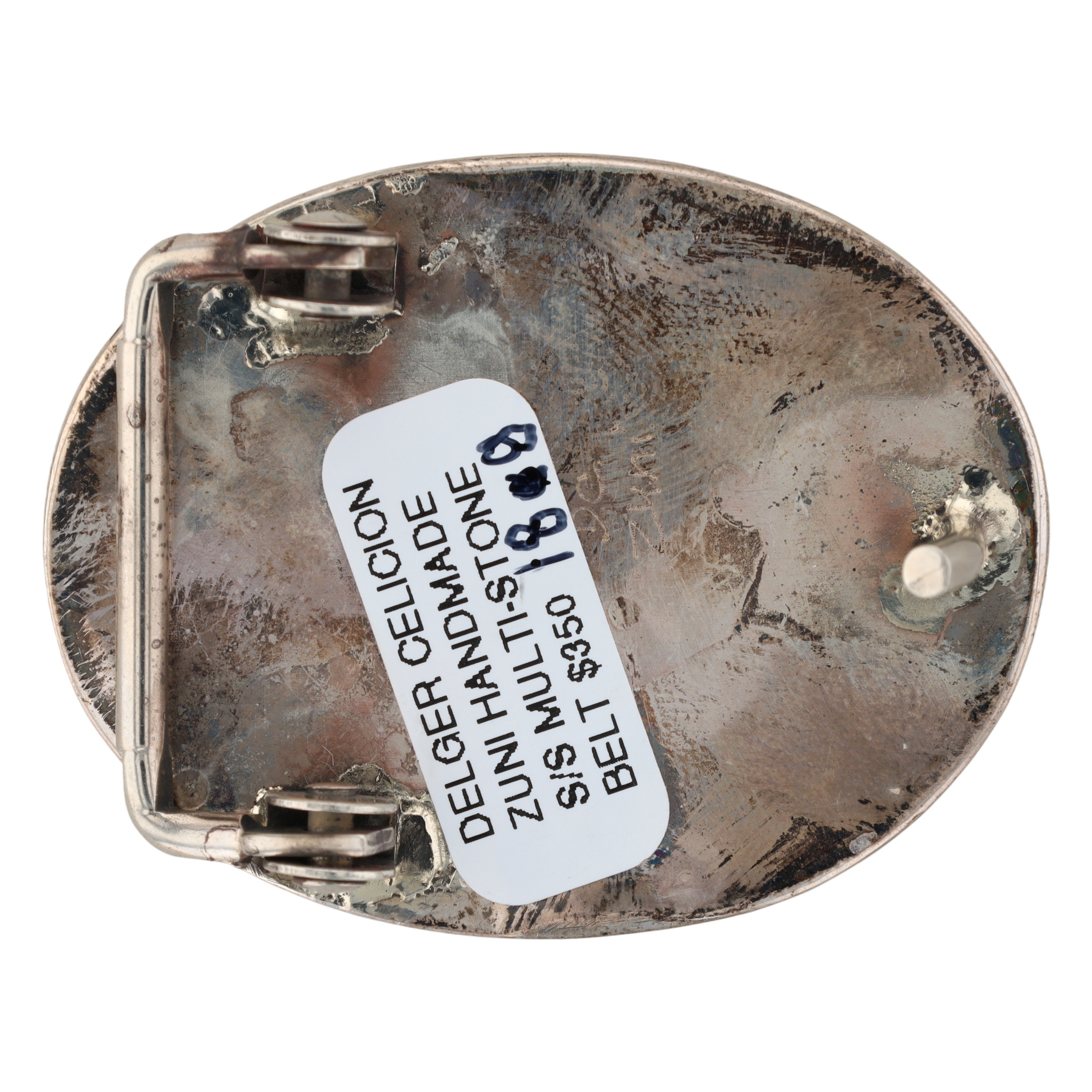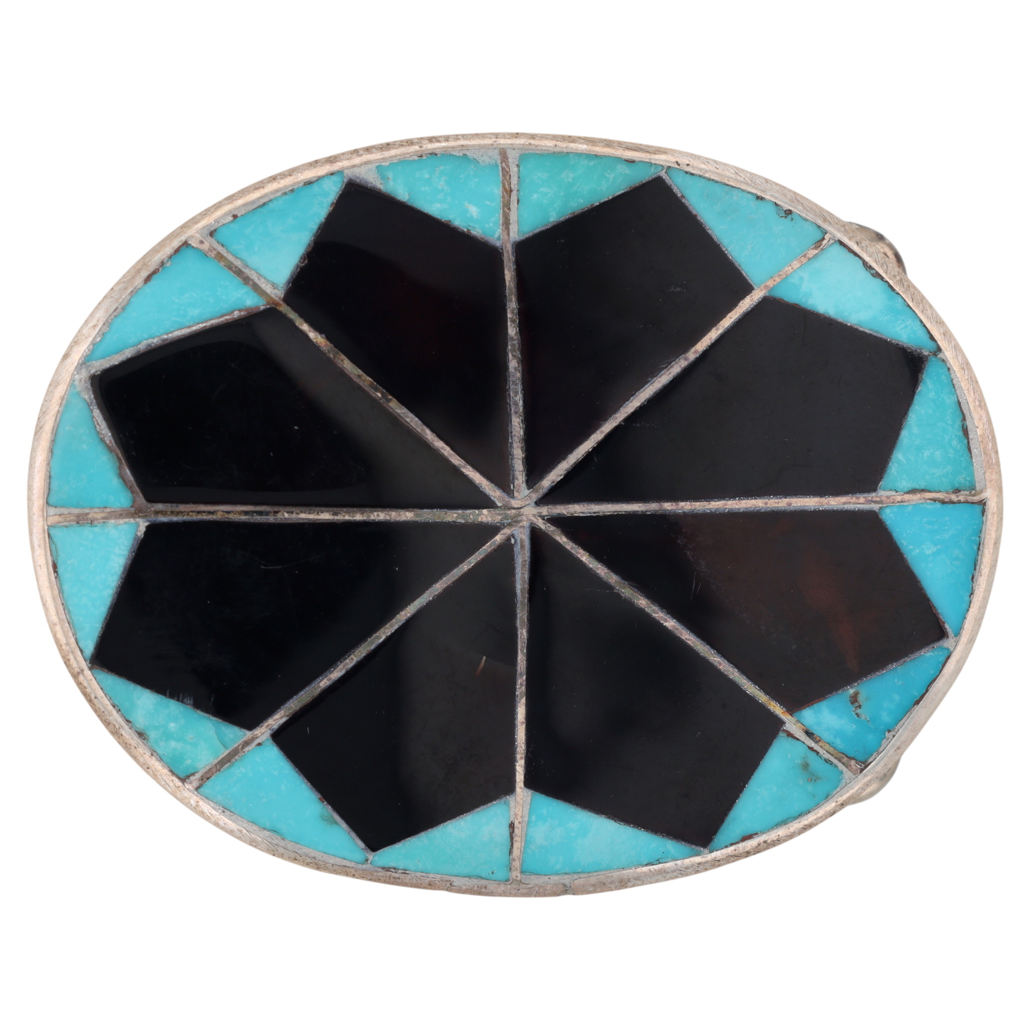 A Zuni handmade sterling silver multi-stone inlaid belt buckle by Delger Cellicion, featuring onyx and turquoise stones in a geometric design, measuring approximately 2.5 x 1.75 inches, and weighing 18g.