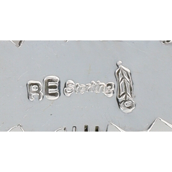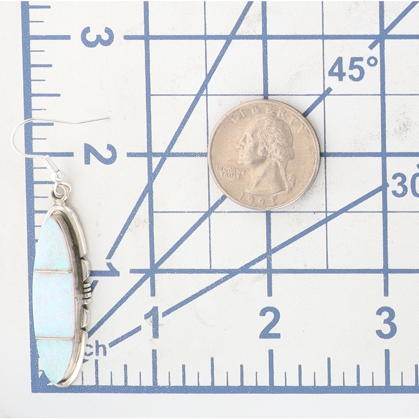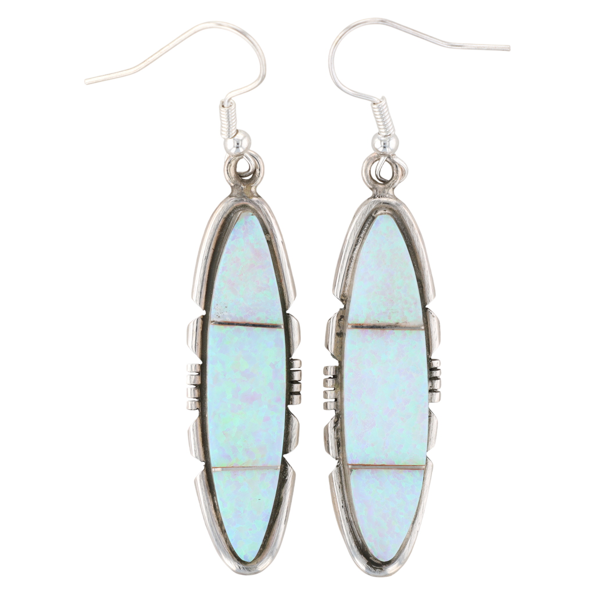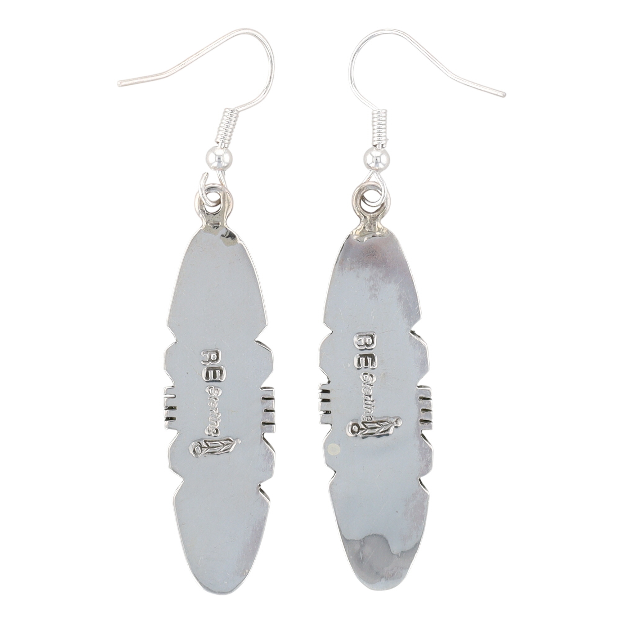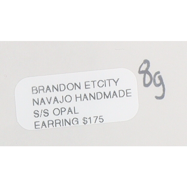A pair of sterling dangle earrings by Brandon Etcitty with iridescent light blue/white opal inlay, marked “B.E. Sterling” with a feather symbol, identified as Navajo Handmade S/S Opal Earring, weighing 8g, and measuring approximately 1.75 inches long.