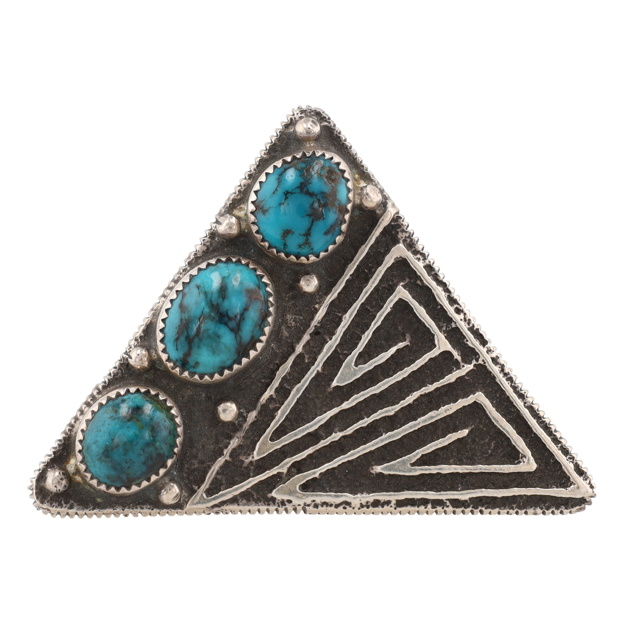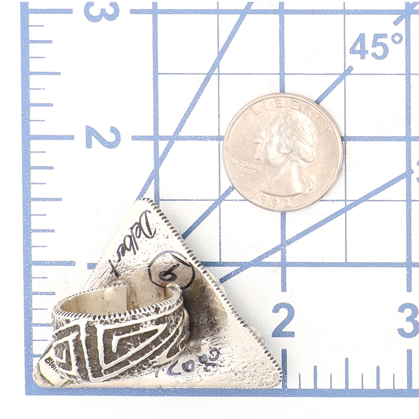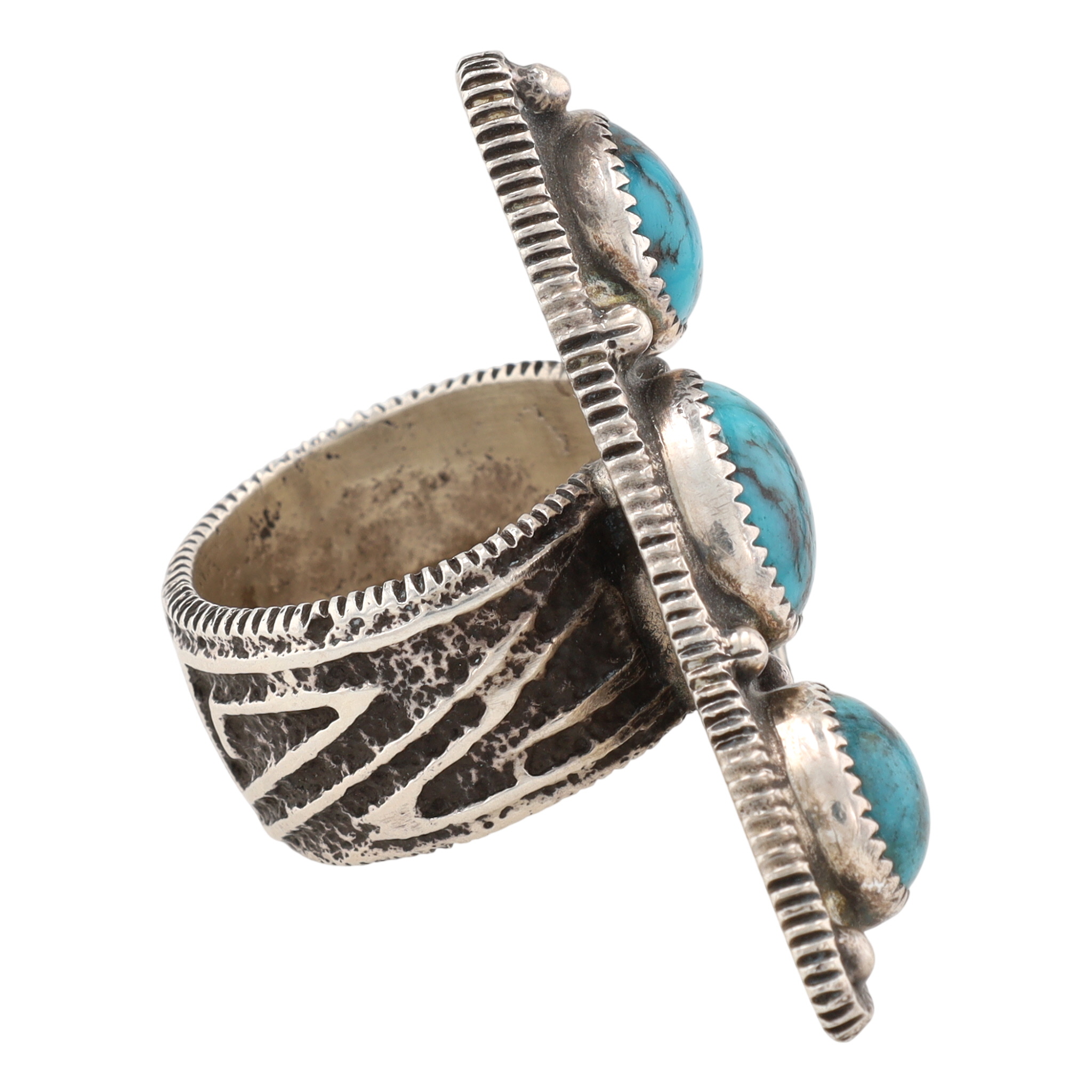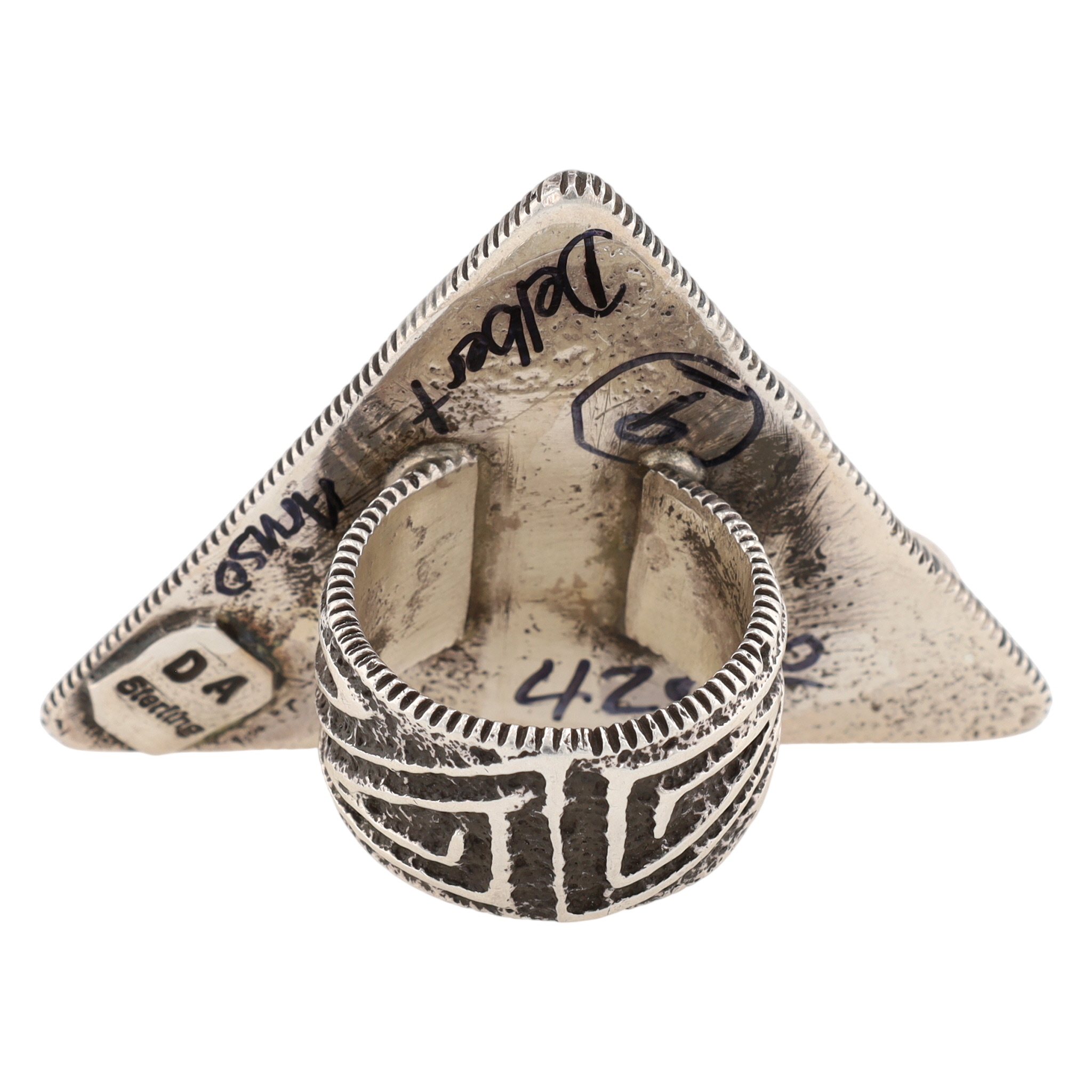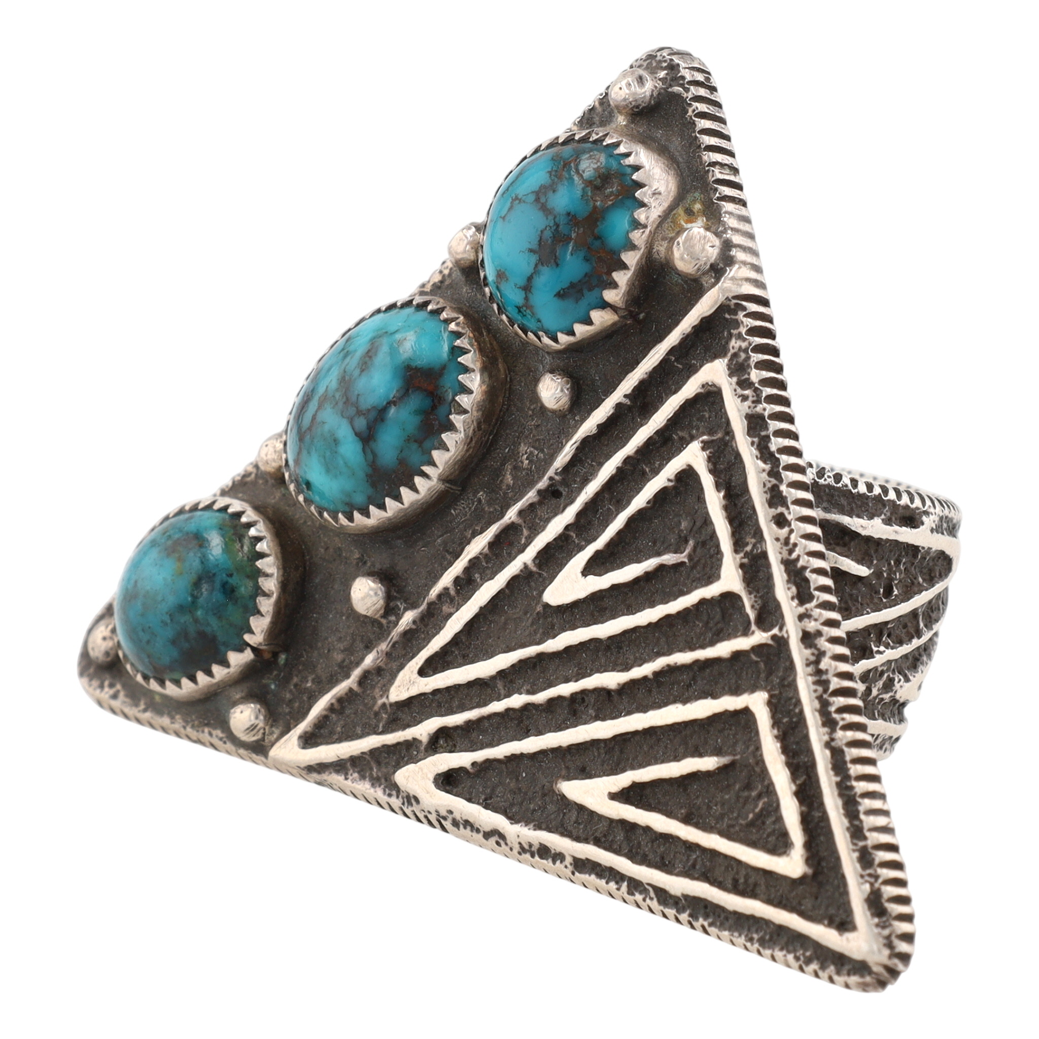 A large, triangular, sterling silver ring by Delbert Arviso, featuring three oval turquoise stones and geometric patterns, inscribed “DA Sterling”, weighing 39.5g and measuring approximately 1.75 inches across the top, size US 9