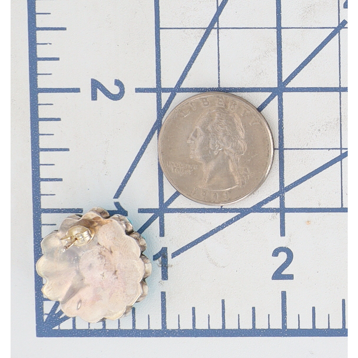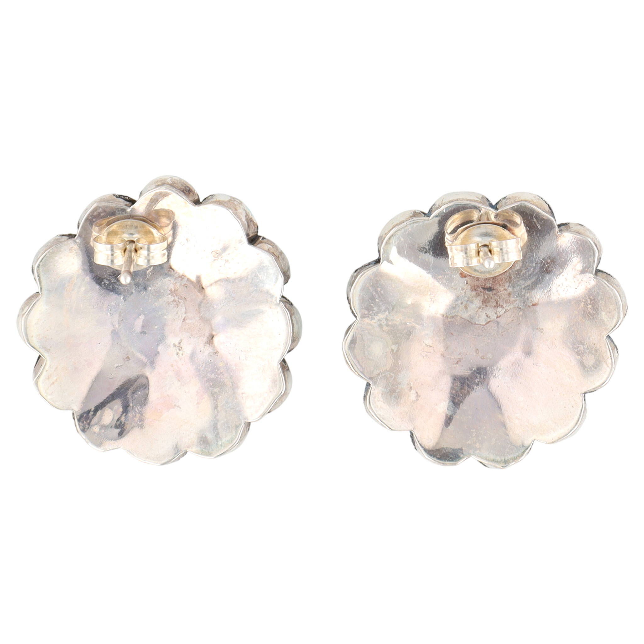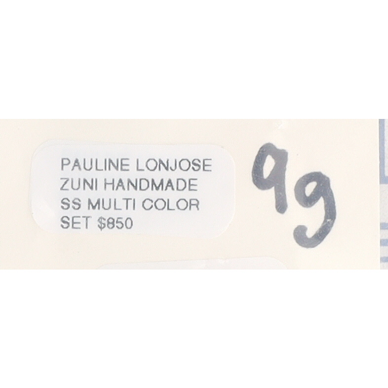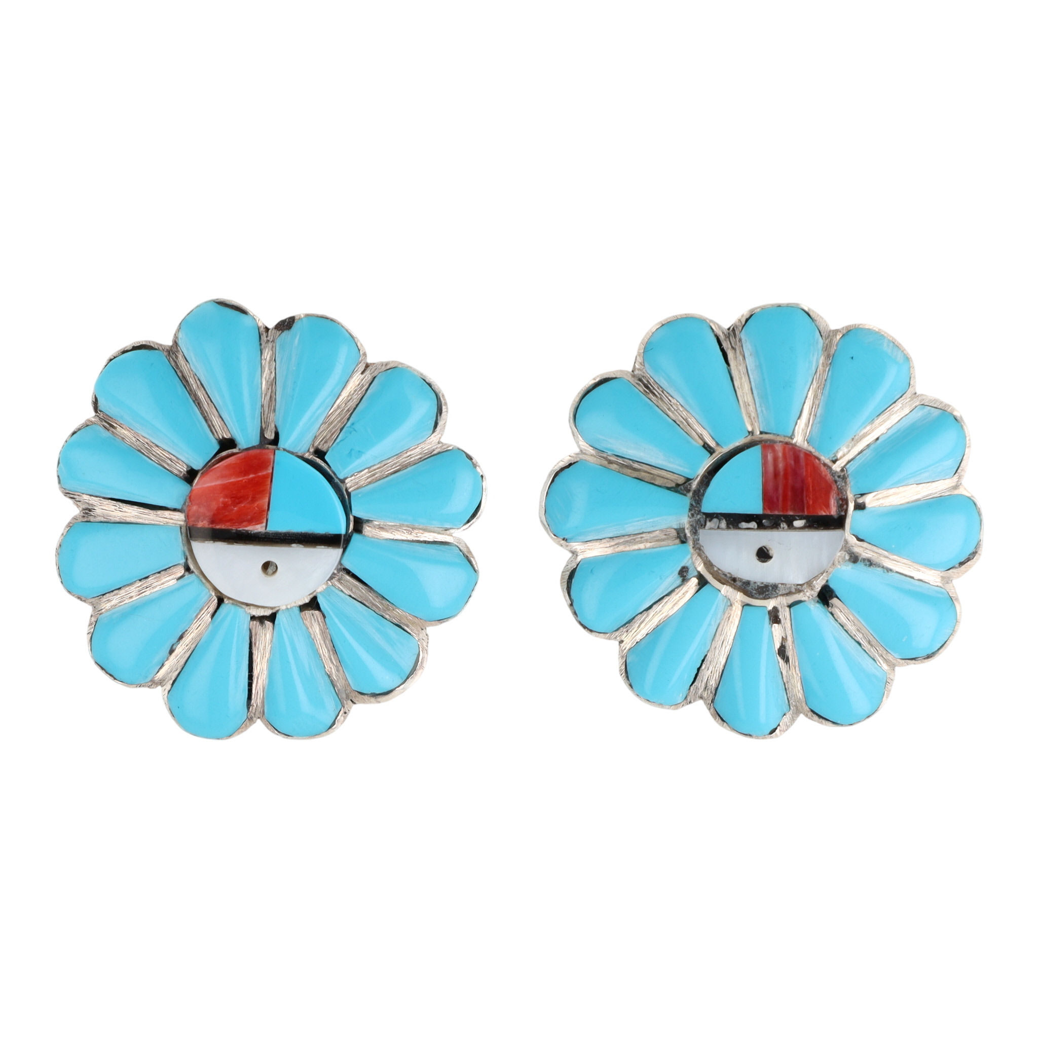 A pair of Zuni handmade sterling silver Sunface stud earrings by Pauline Lonjose, featuring multi-stone inlay with turquoise, coral, onyx, and mother-of-pearl stones, approximately 1 inch in diameter.