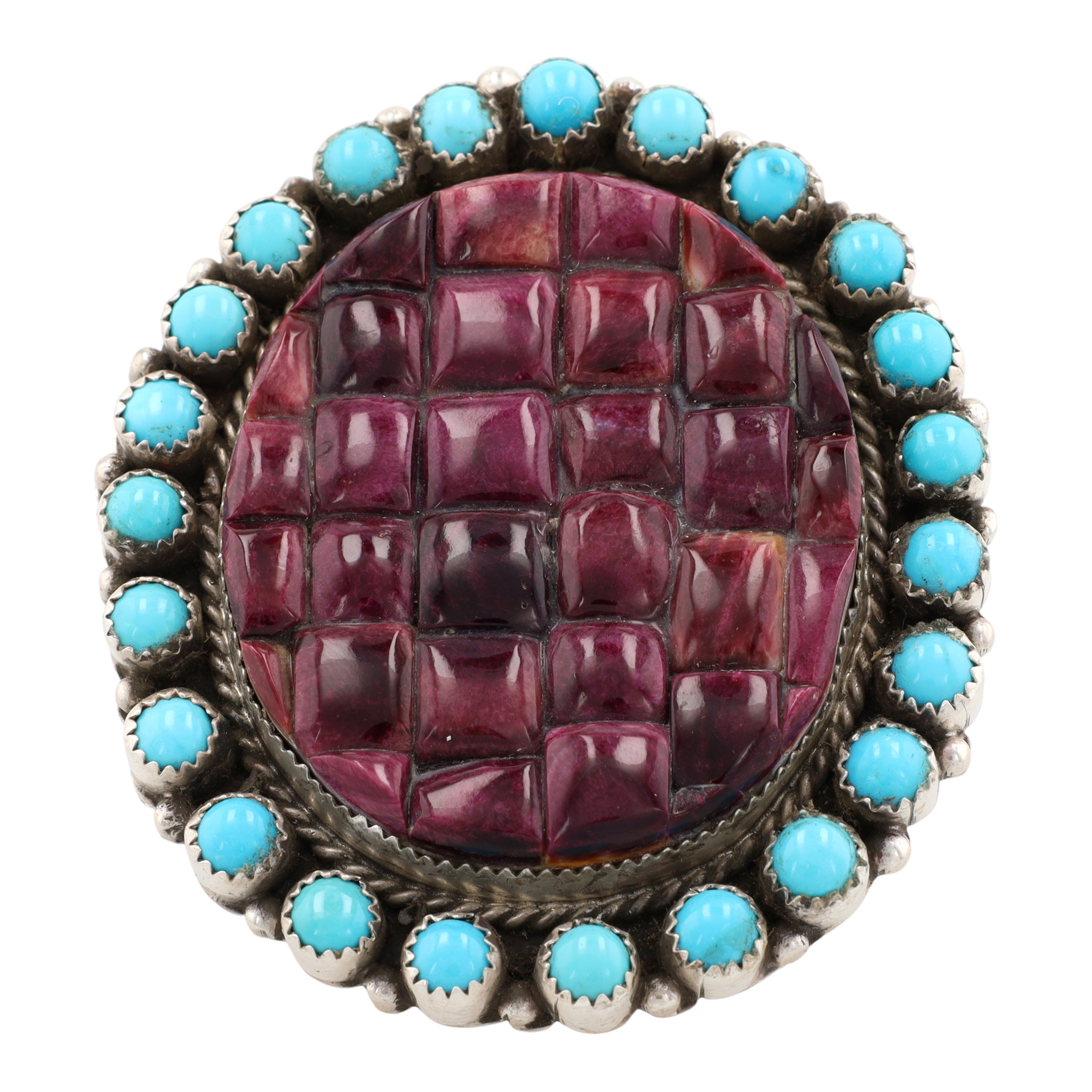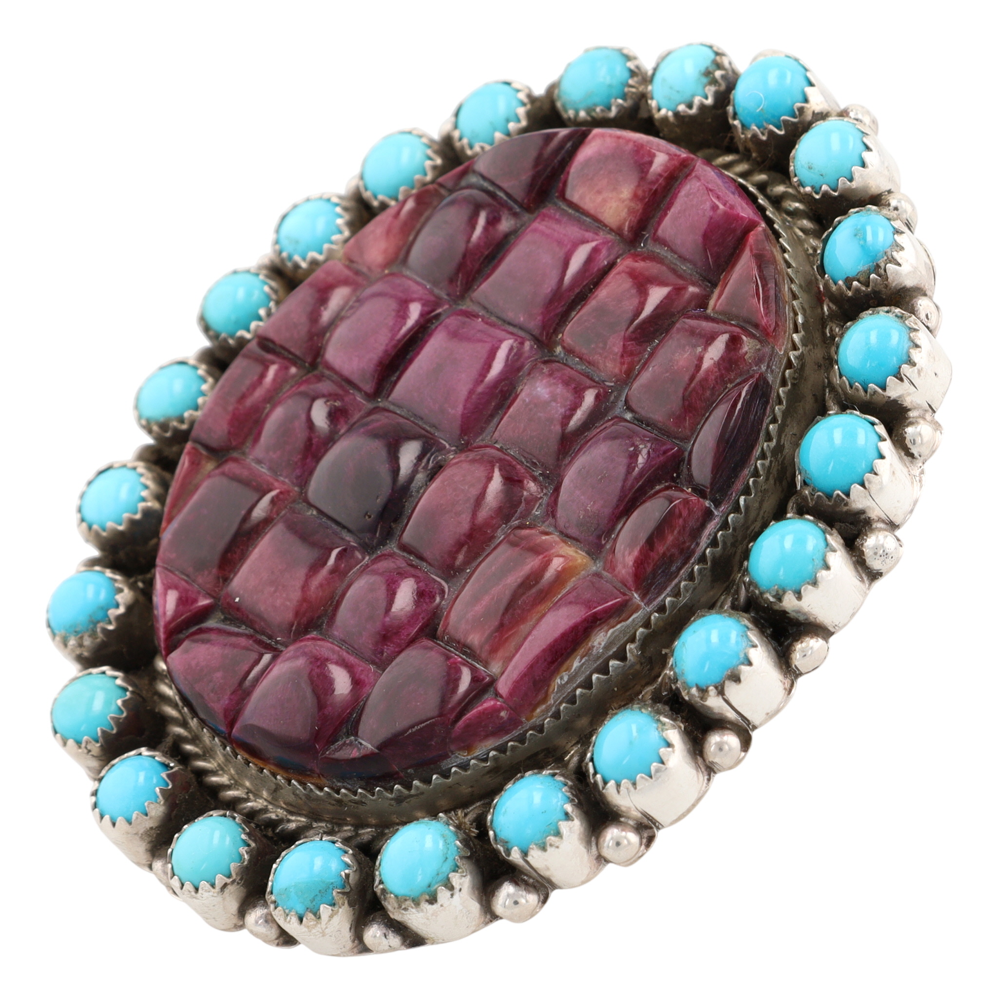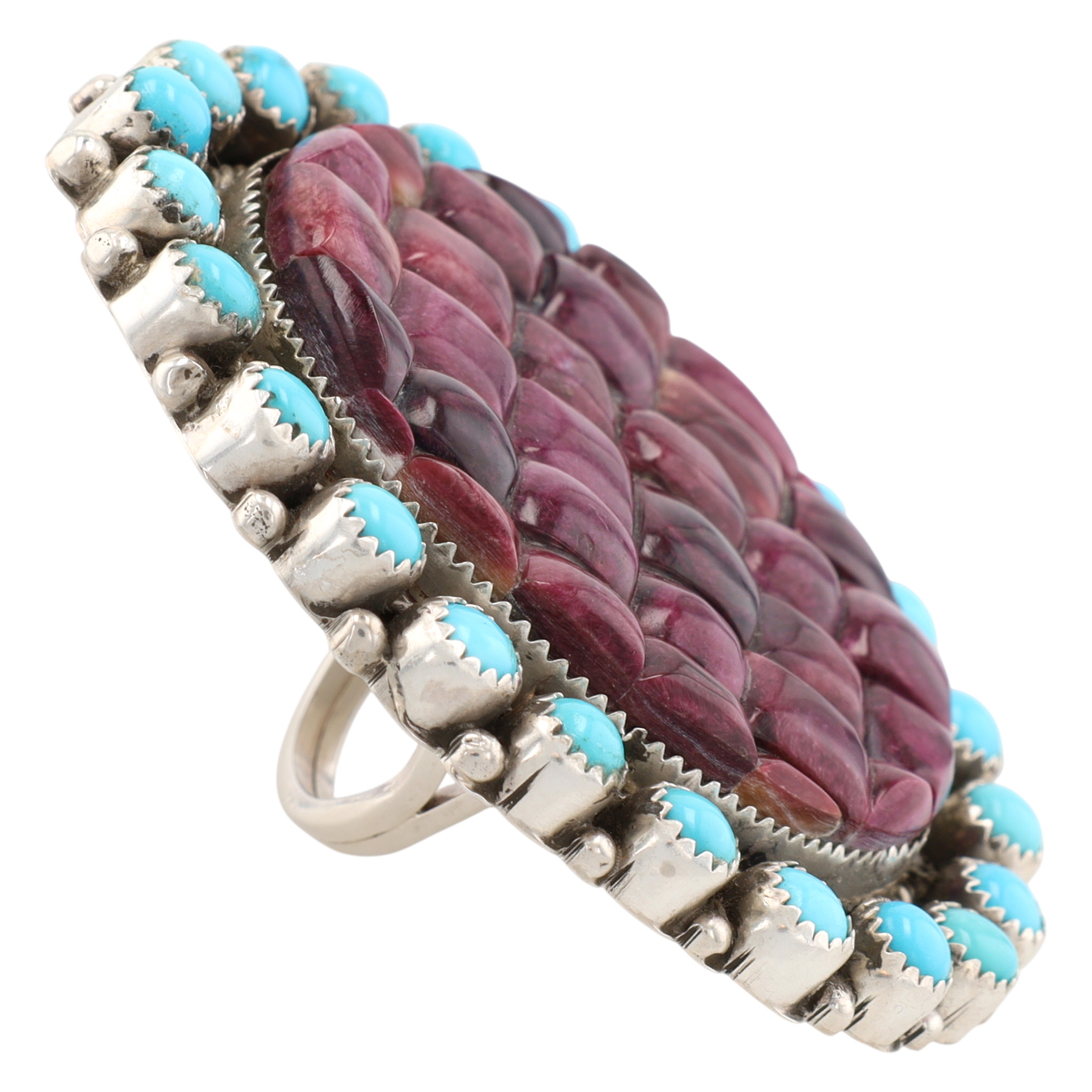 A single sterling silver ring features a large reddish-purple spiny oyster and surrounded by 23 bright blue turquoise stones, stamped ‘STERLING’, measuring approximately 2.5 inches long and weighing 50g, and a ring size US 7.5.