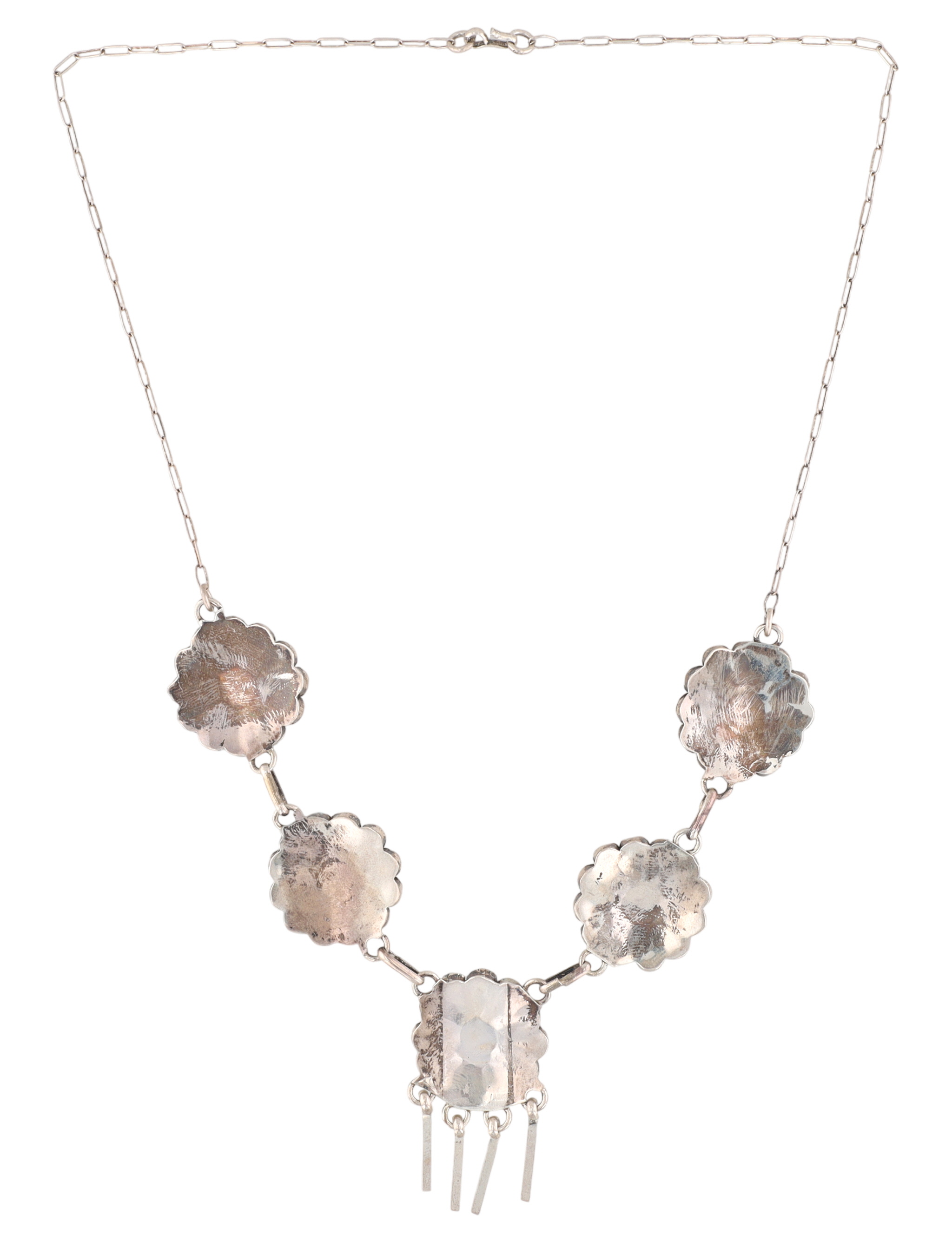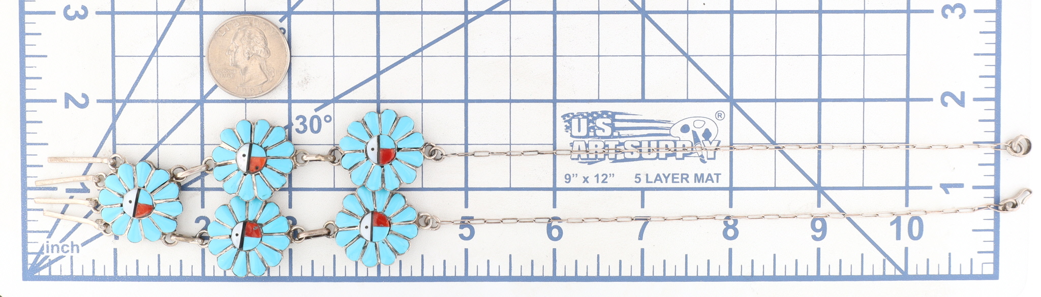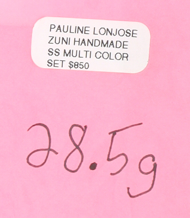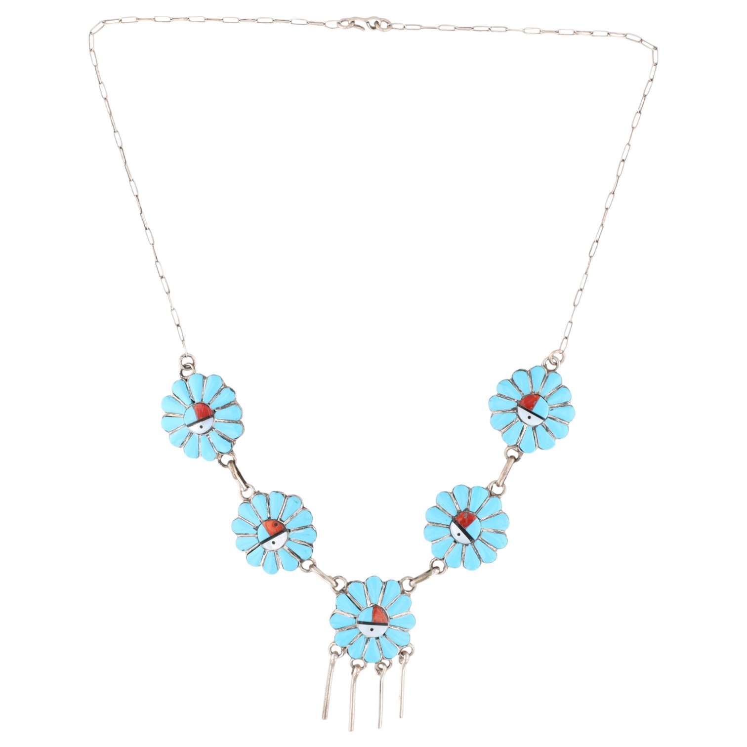 A Pauline Lonjose Zuni Handmade Sterling Silver Multi-Stone Inlay Necklace, featuring five light blue turquoise, mother-of-pearl, onyx, and coral, Sunface segments with bust designs, labeled “SS MULTI COLOR SET”, weighing 28.5g and approx. 20 inches.
