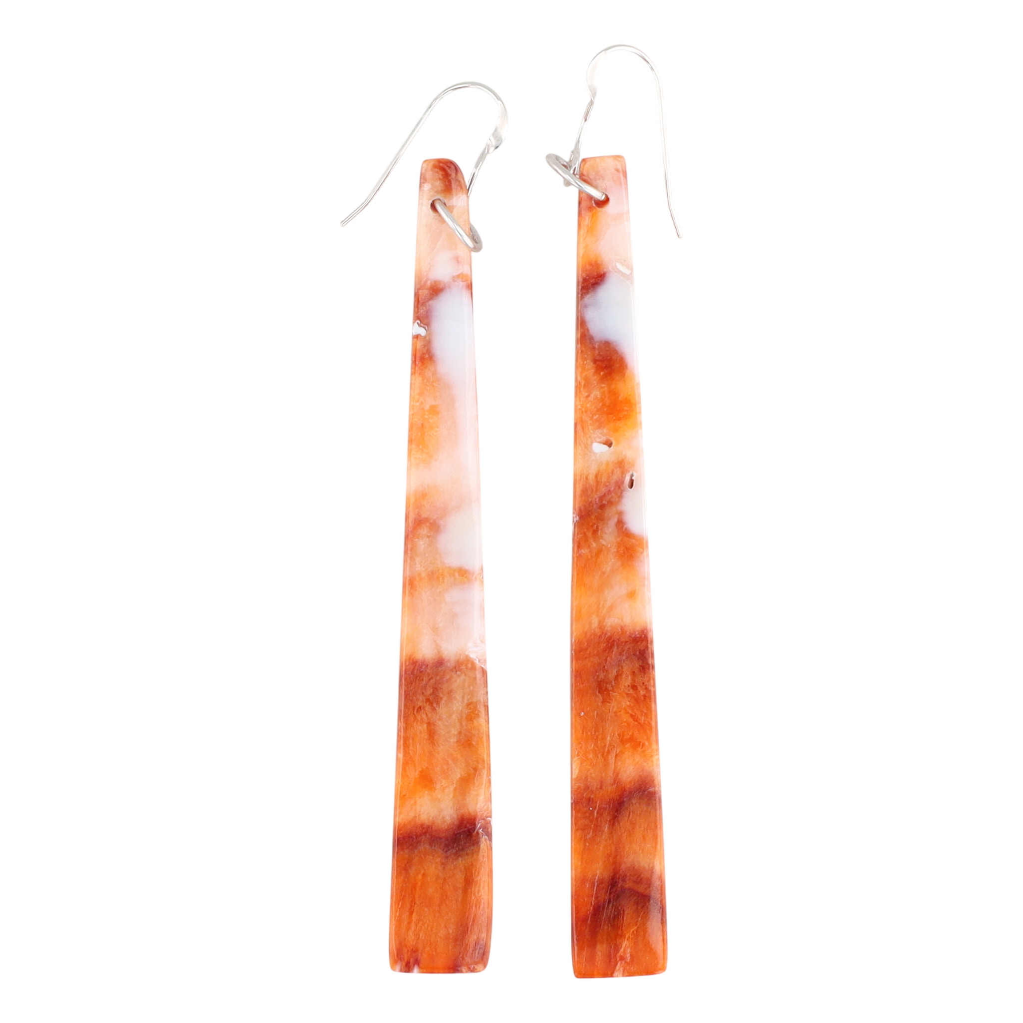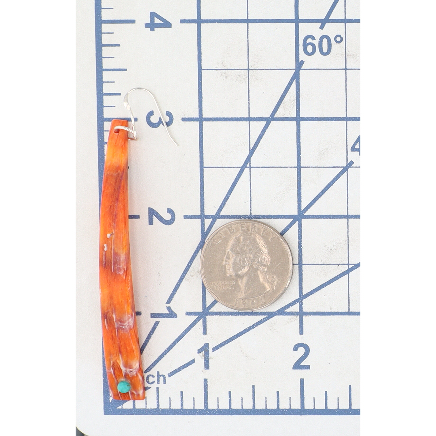 A pair of Zuni Jesus Espino orange and white spiny oyster shell dangle earrings with small turquoise accents, weighing 8.5g and measuring approximately 2.5 inches long.