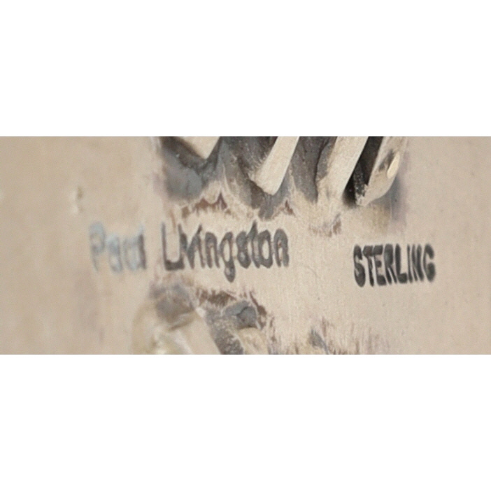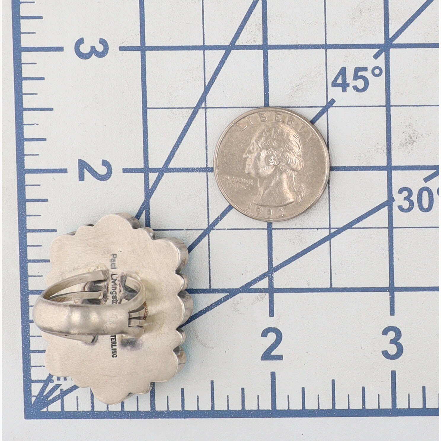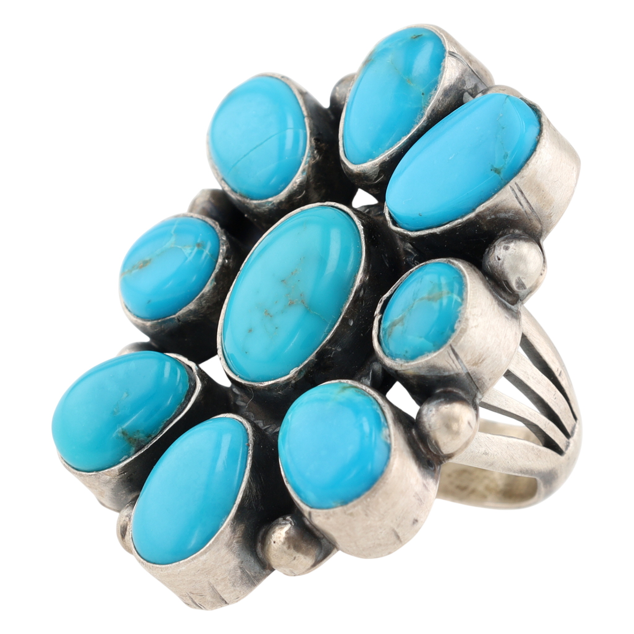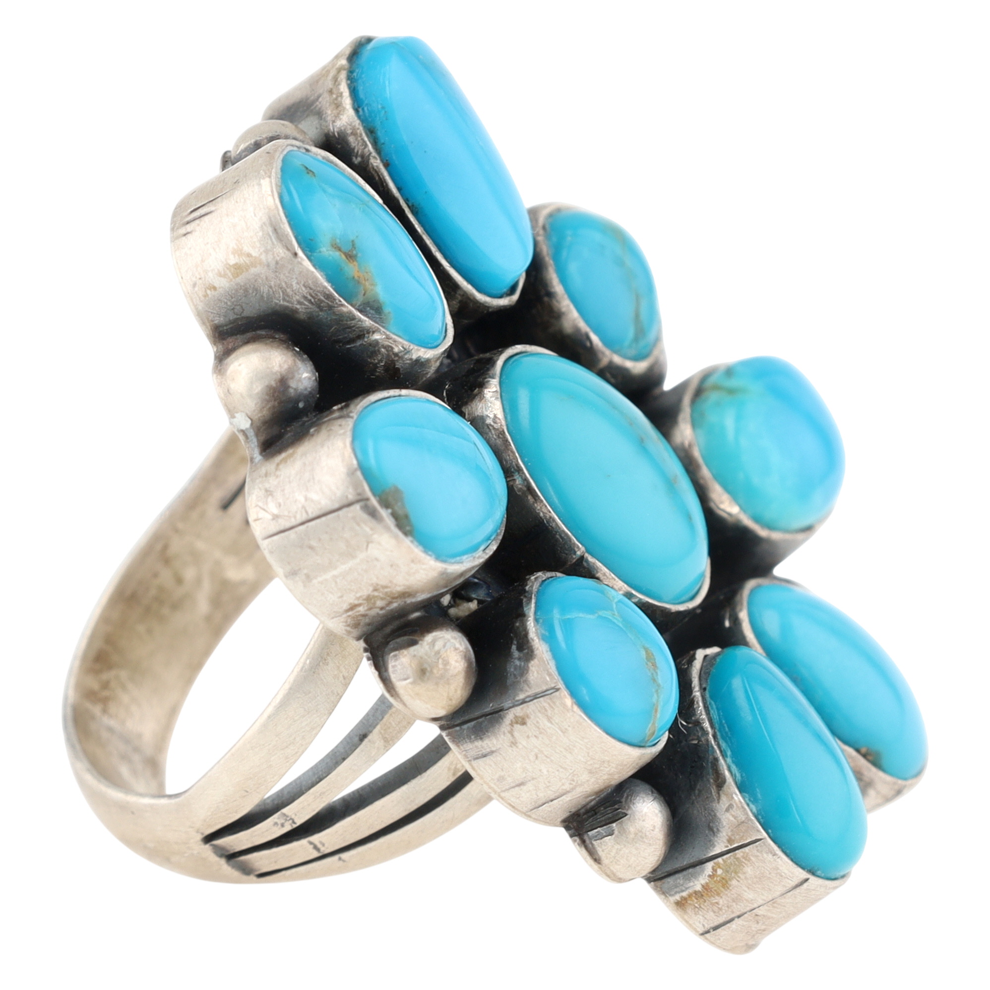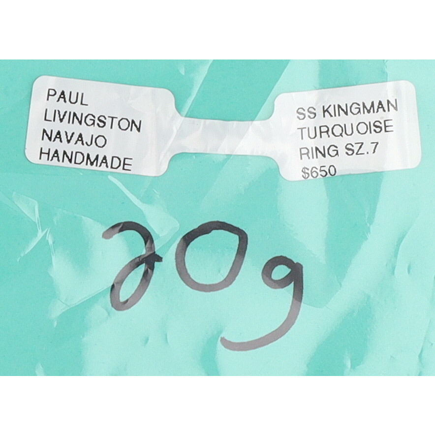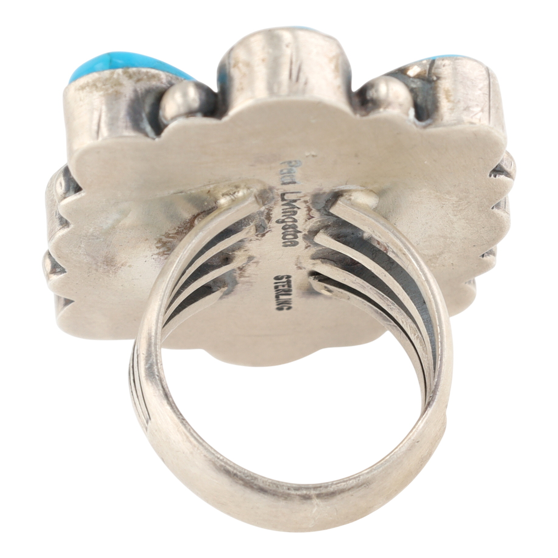 A Navajo handmade sterling silver Kingman turquoise cluster ring, size 7, weighing 20g, measuring approximately 1.25 inches long, inscribed ‘Paul Livingston’ and ‘STERLING’.