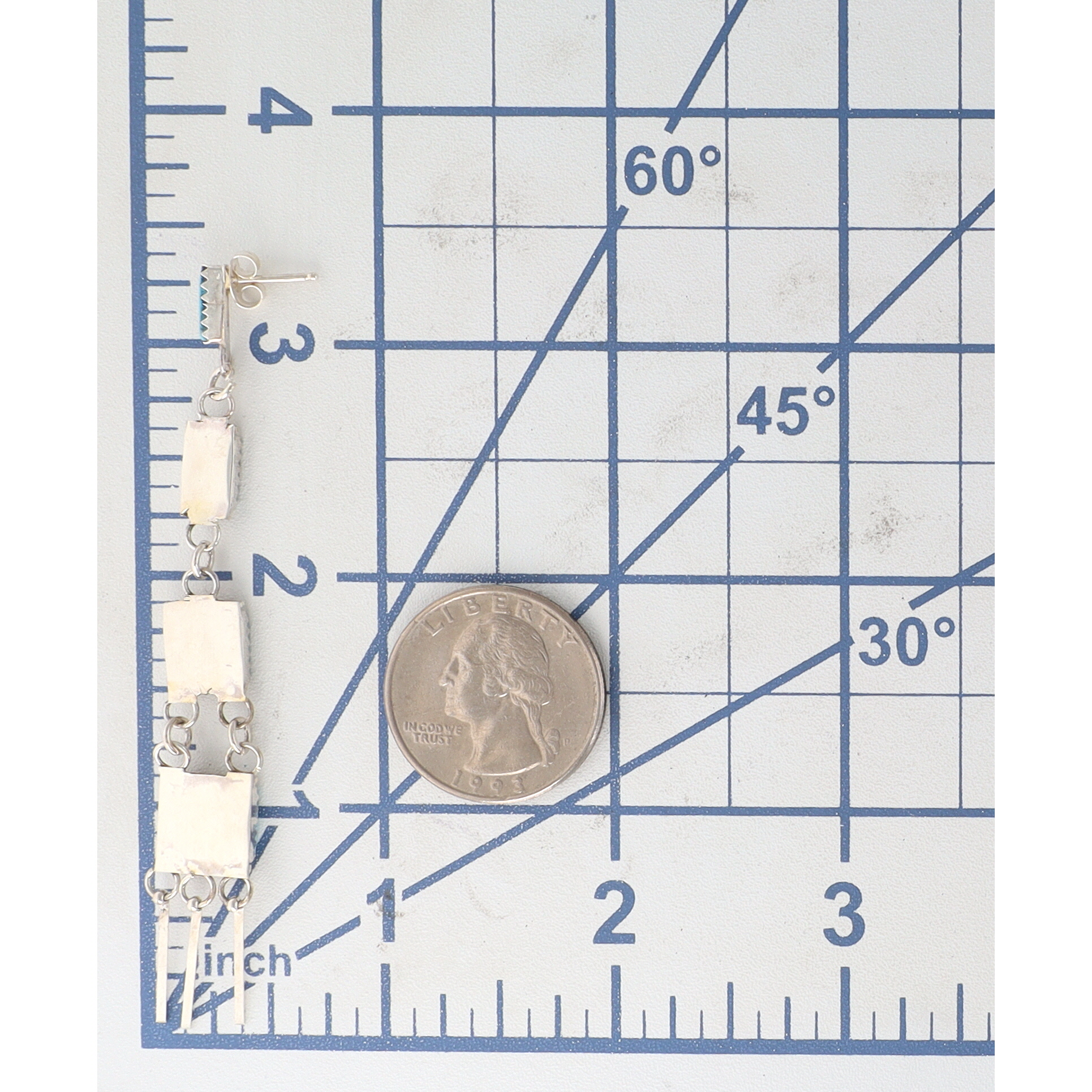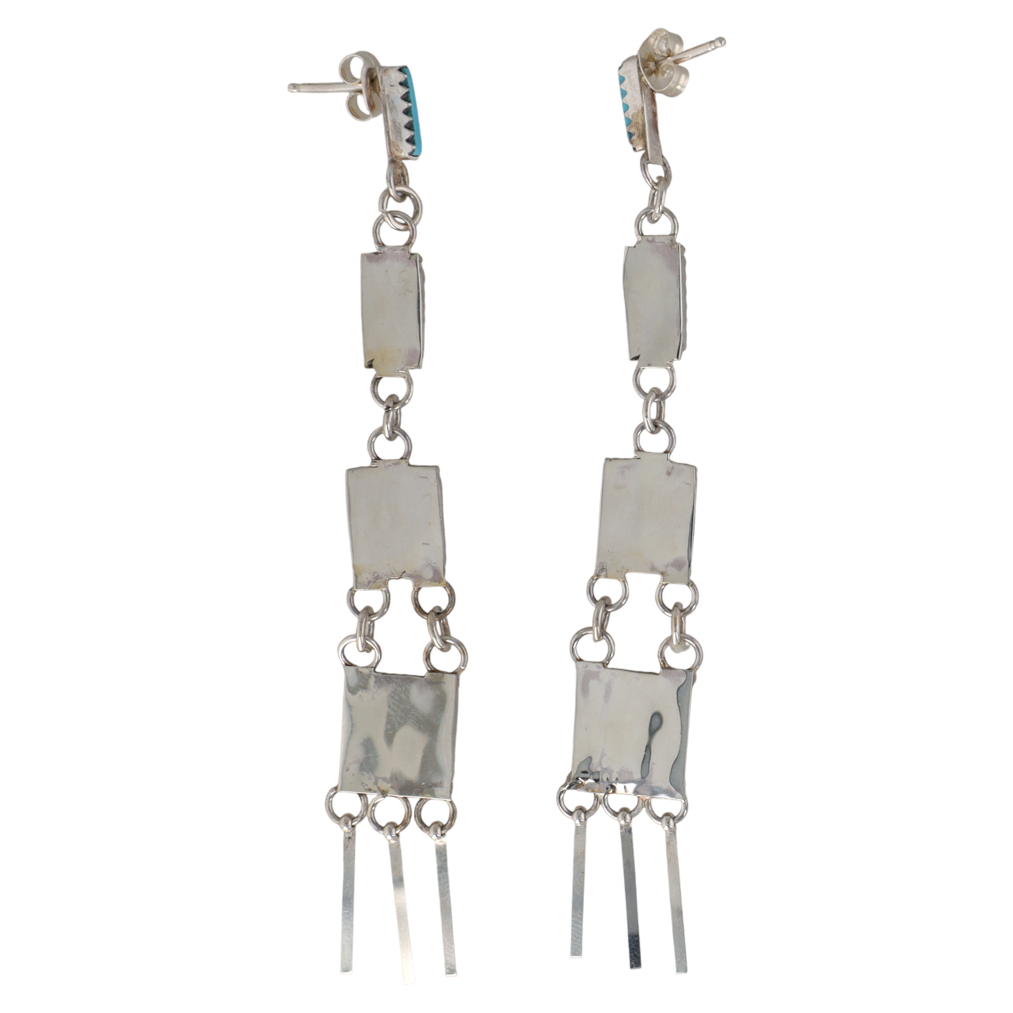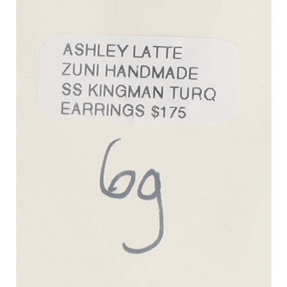 A pair of Zuni handmade sterling silver drop earrings featuring rectangular segments with Kingman turquoise, labeled ‘ASHLEY LAATE’, ‘ZUNI HANDMADE’, ‘SS KINGMAN TURQ’, and ‘EARRINGS’, measuring approximately 3.25 inches long, weighing 6g.