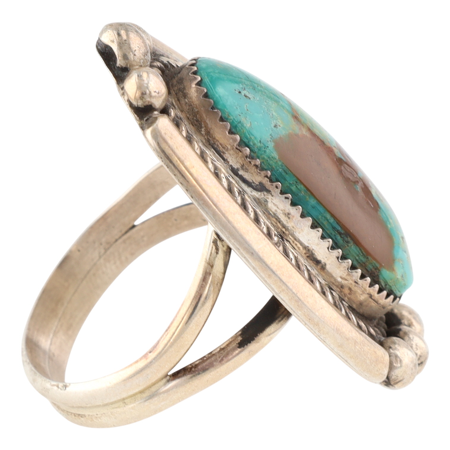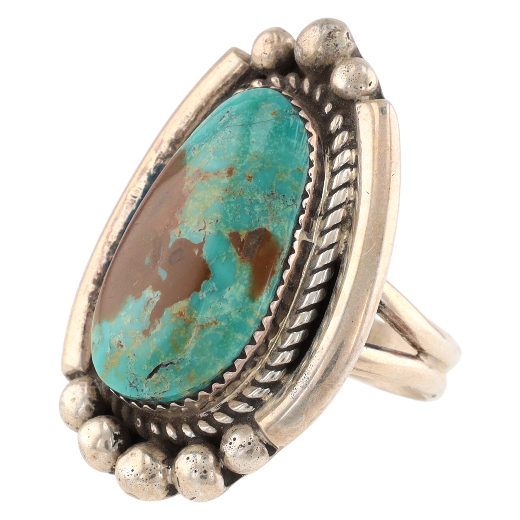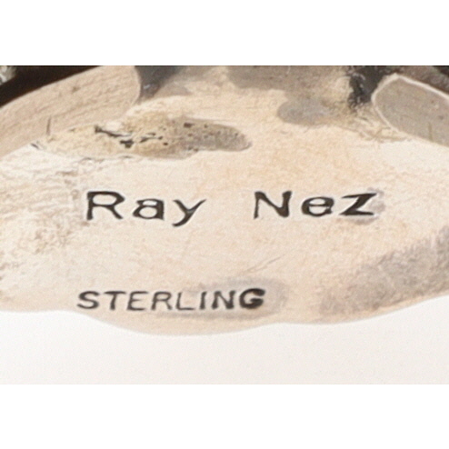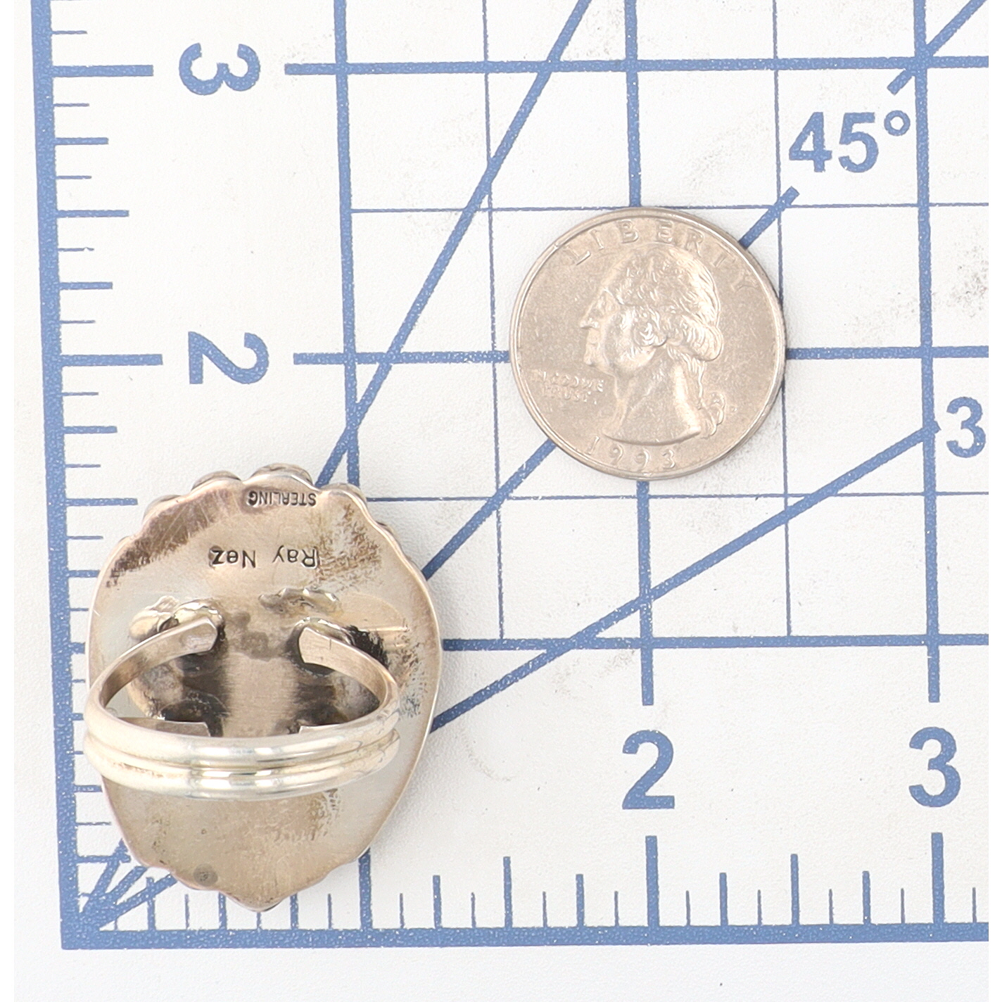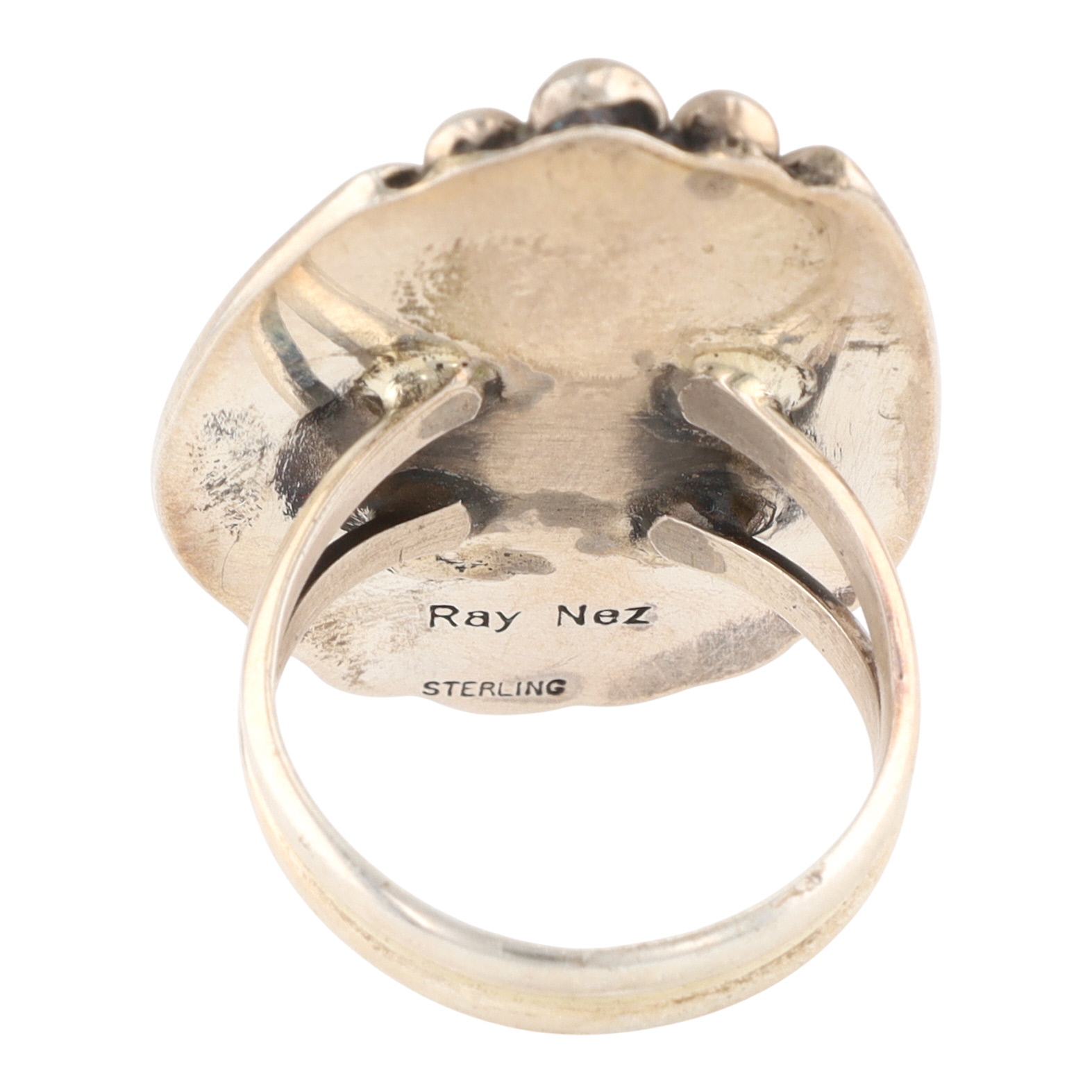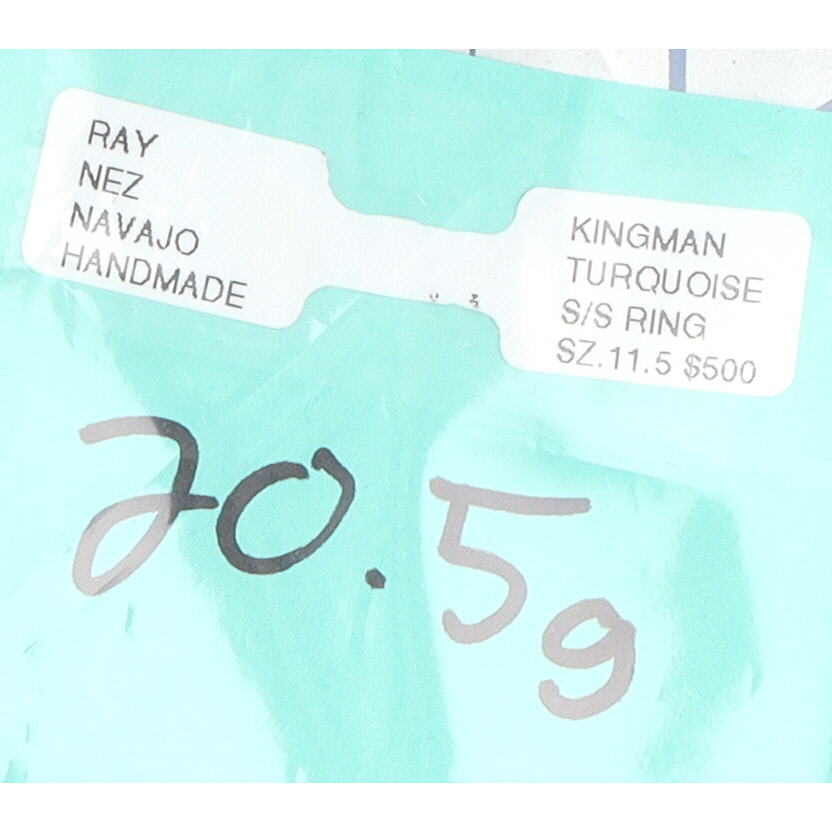 A sterling silver ring with an oval blue-green Kingman turquoise stone featuring brown matrix, inscribed “Ray Nez” and “STERLING”, weighing 20.5g and size 11.5.