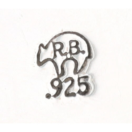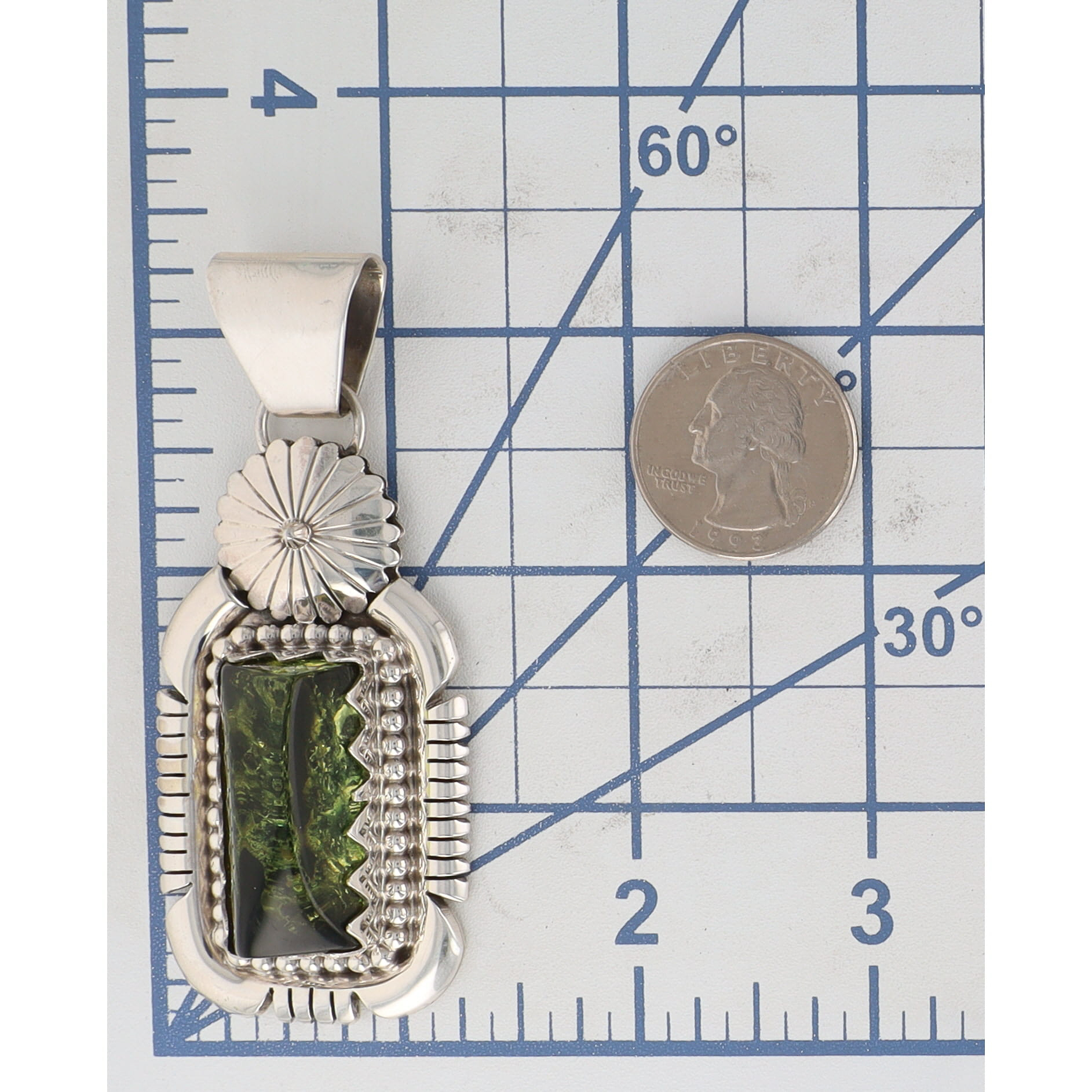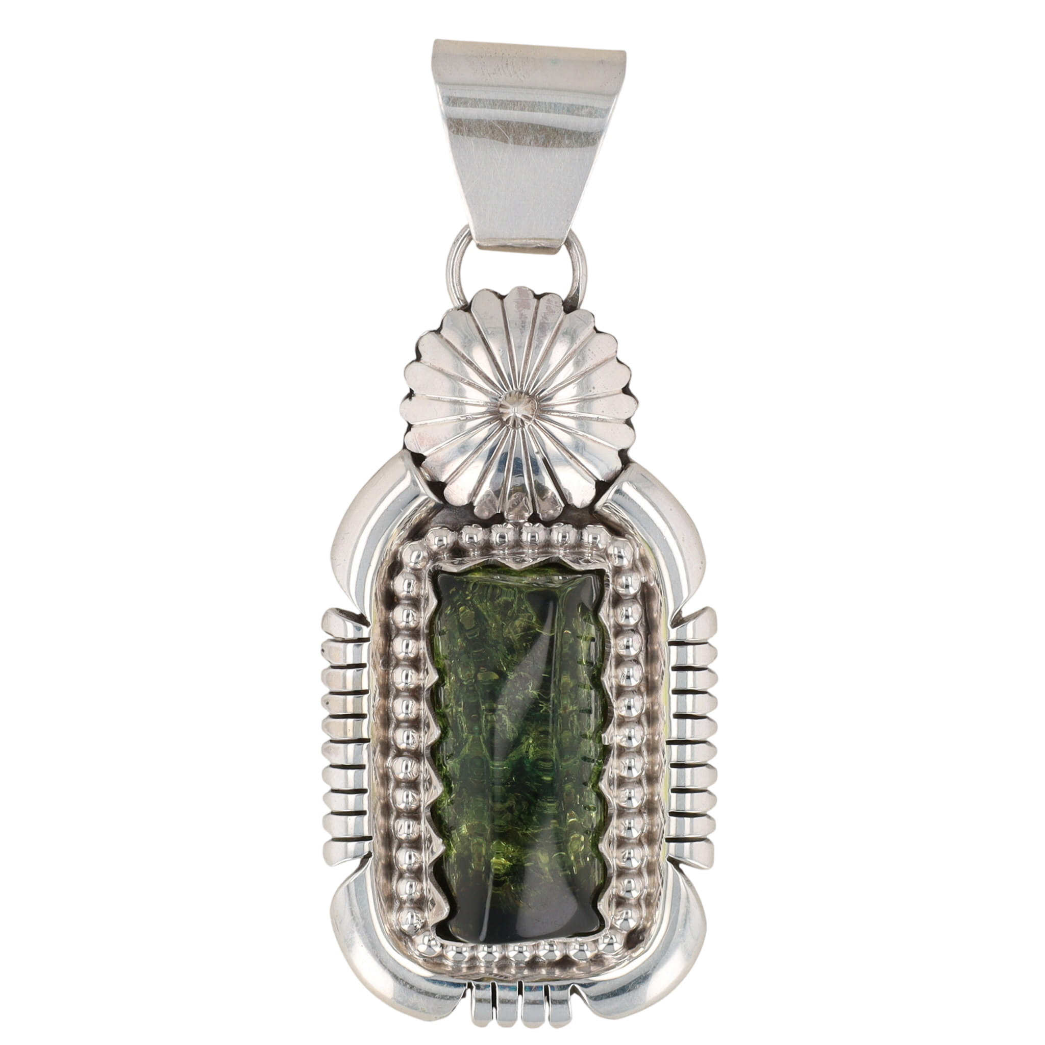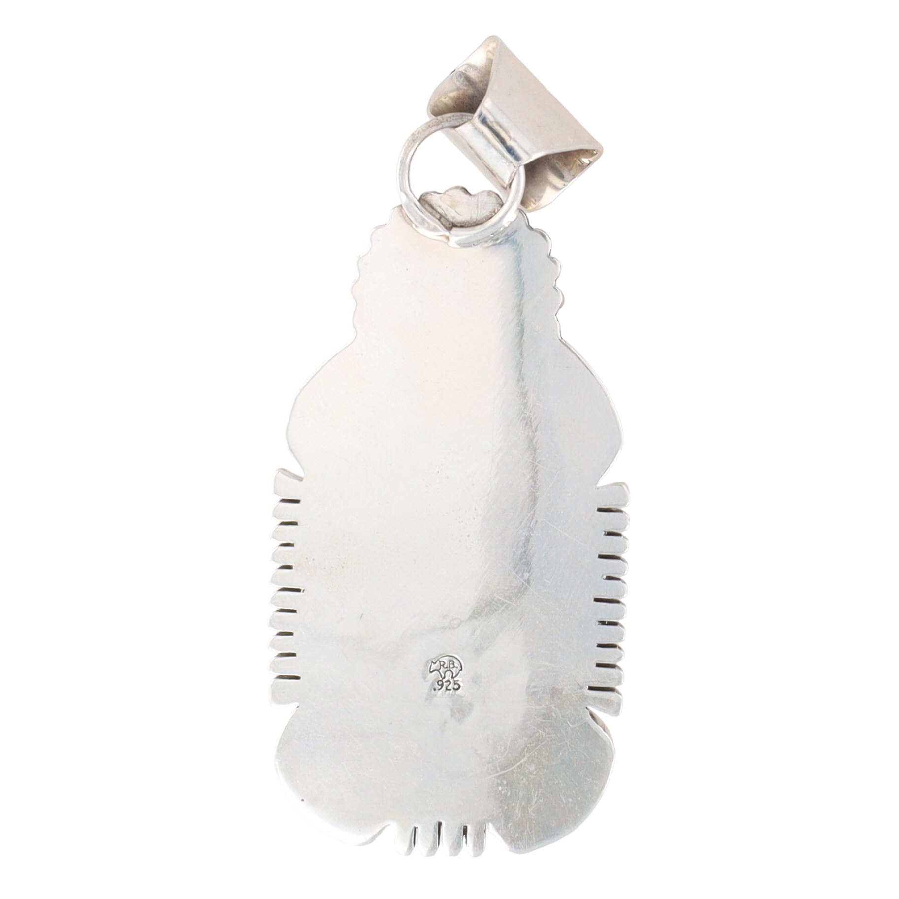 A sterling silver pendant with a rectangular dark green stone/foiled glass, marked “R.B. .925” on the reverse, measuring approximately 3.5 inches long and weighing 37.5g.