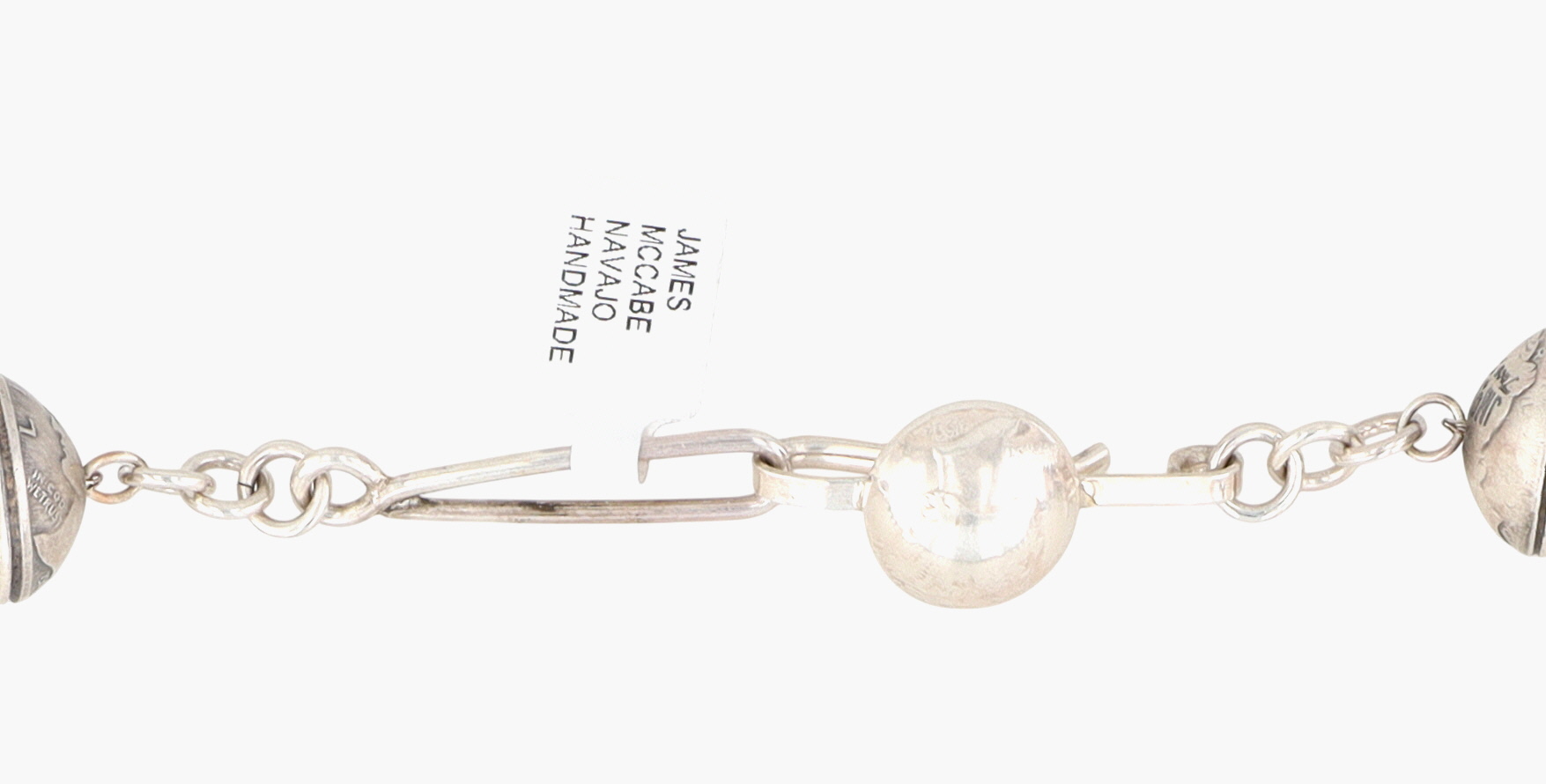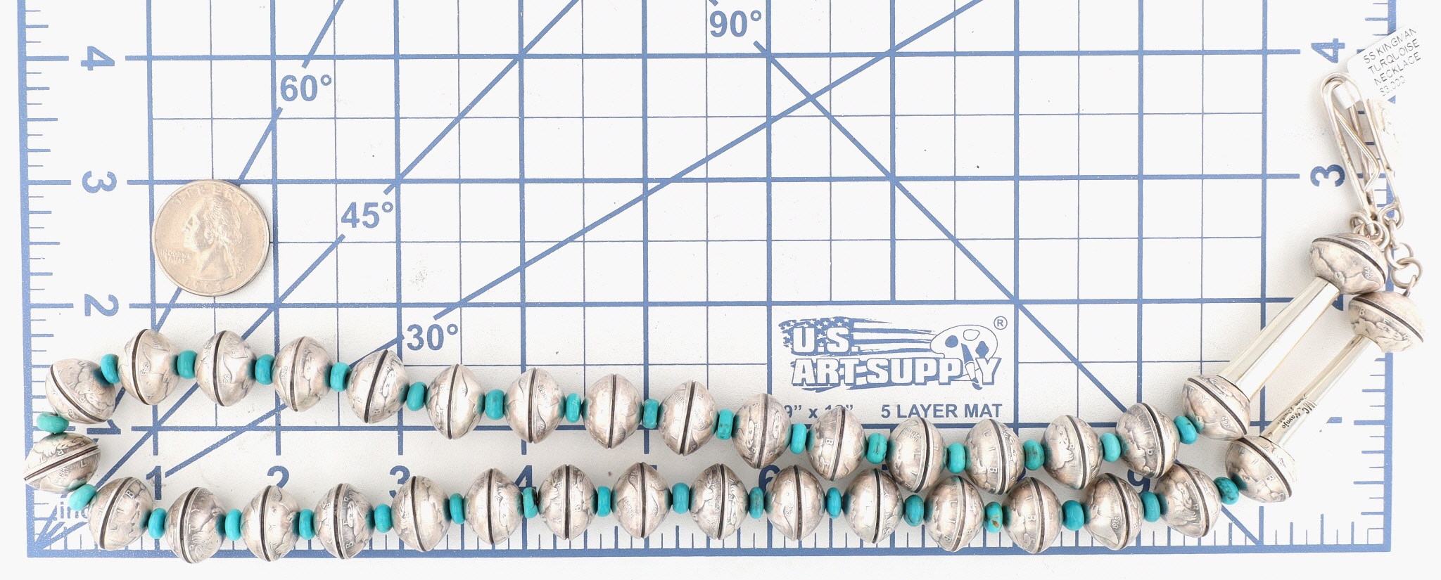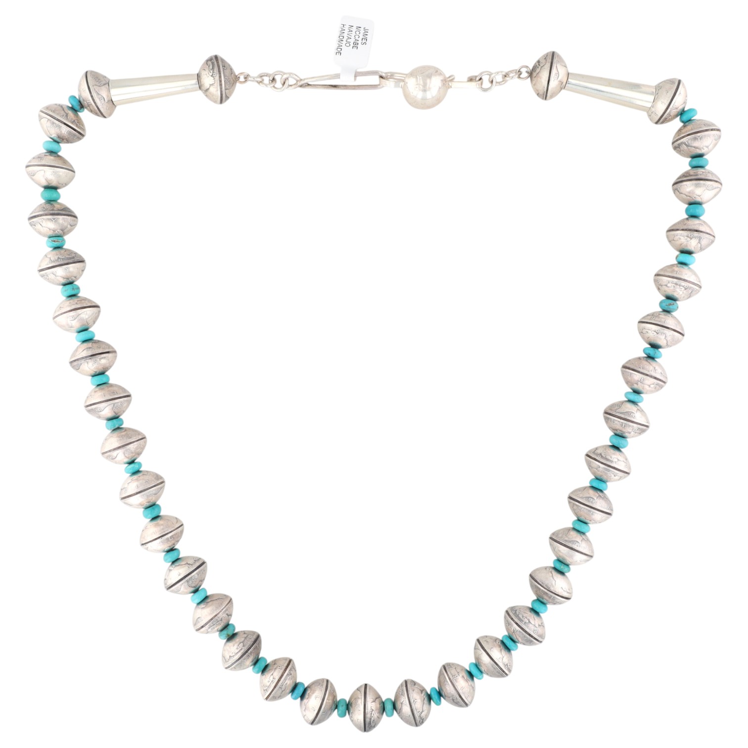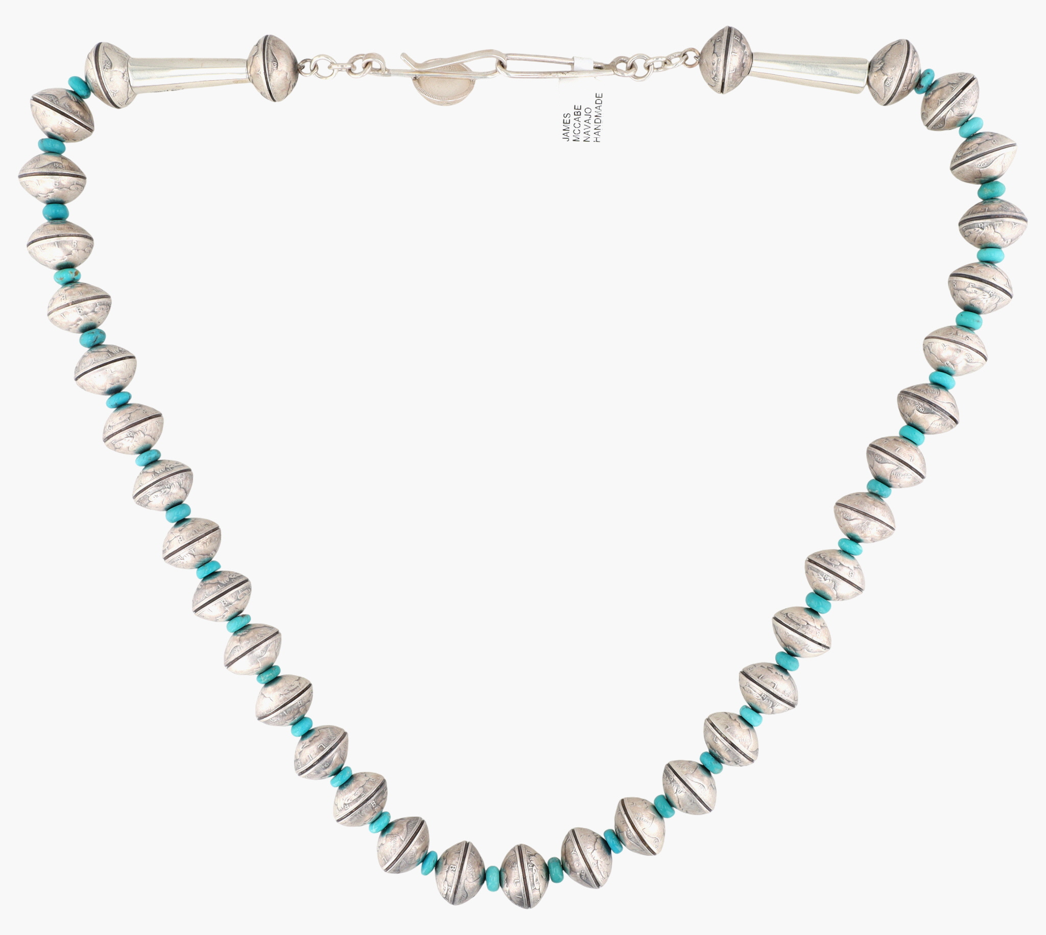 A silver and turquoise Liberty Dime necklace by James McCabe, Navajo handmade, 27 inches long, and weighing 187g.