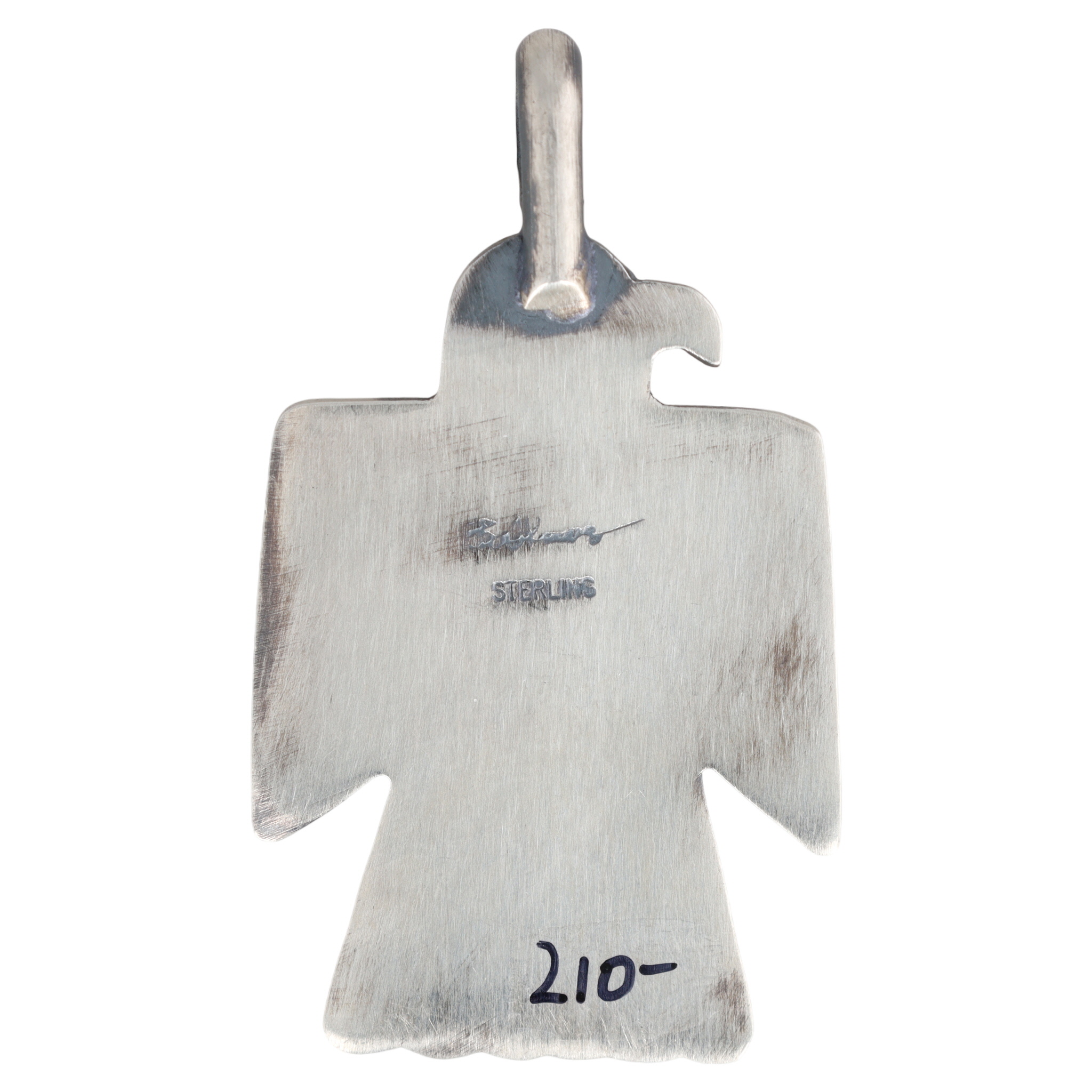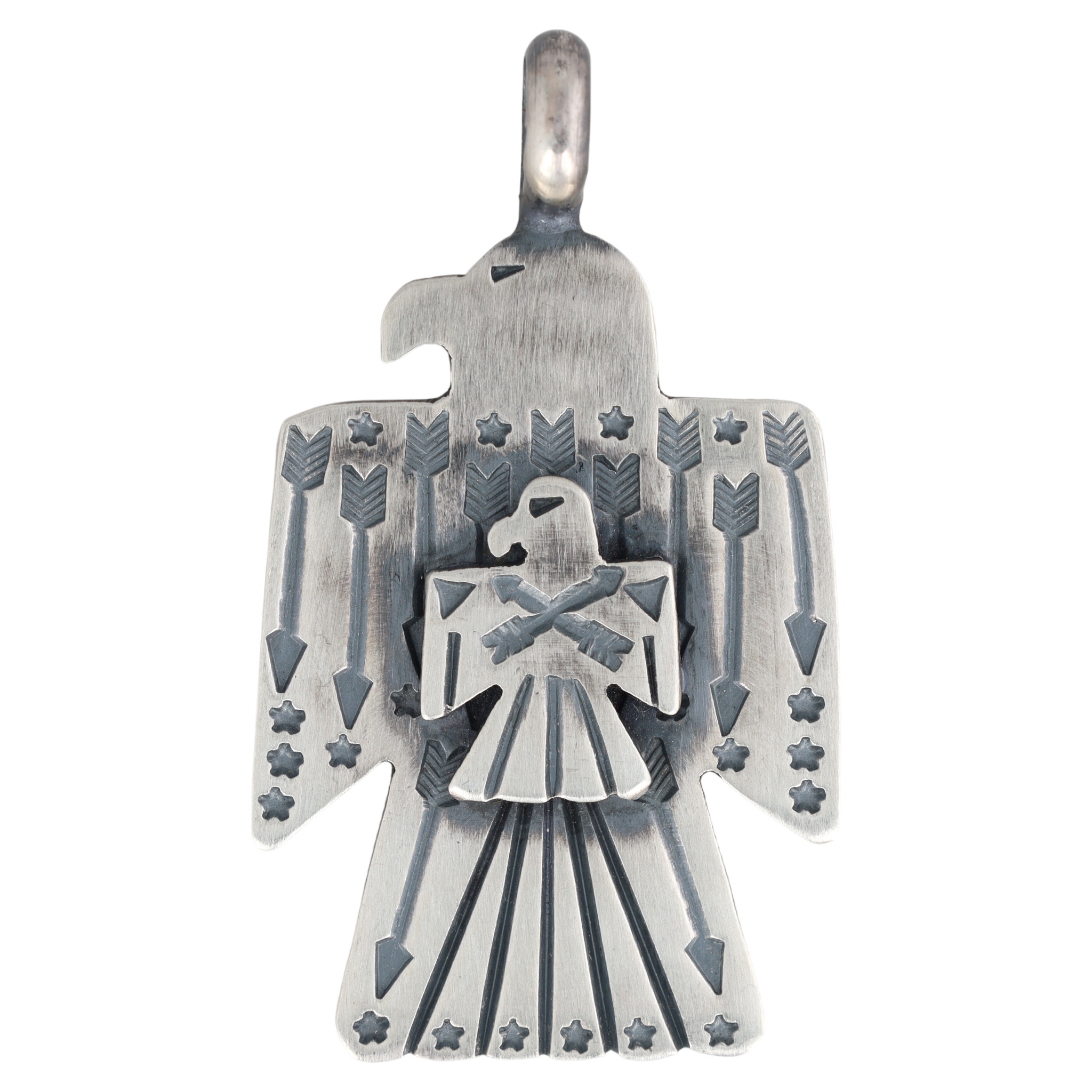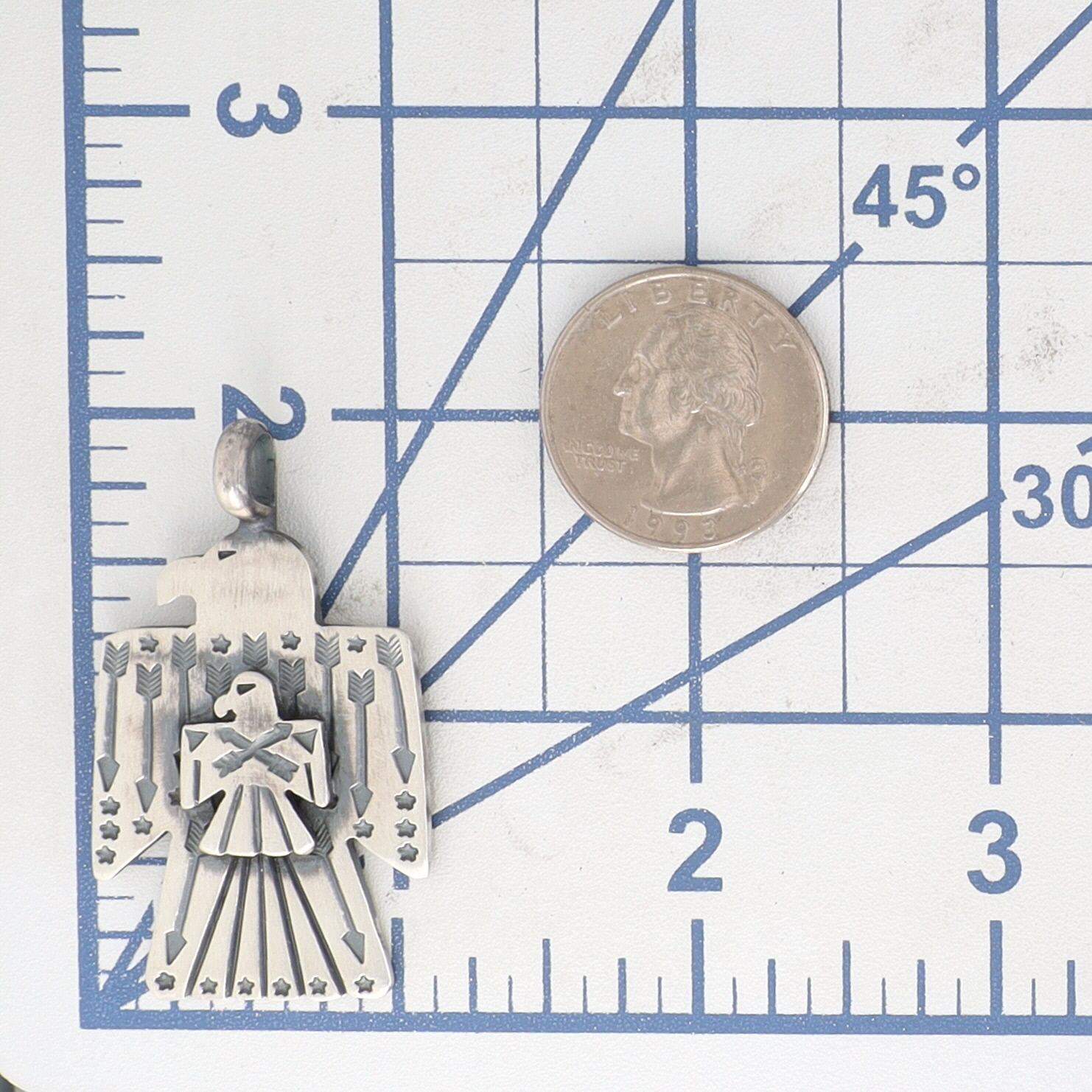 A sterling Navajo Thunderbird pendant, etched with an illegible signature, and stamped ‘STERLING’ on the back, weighing 14.5g and measuring approximately 1.75 inches tall.