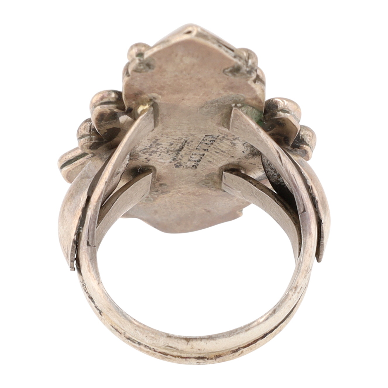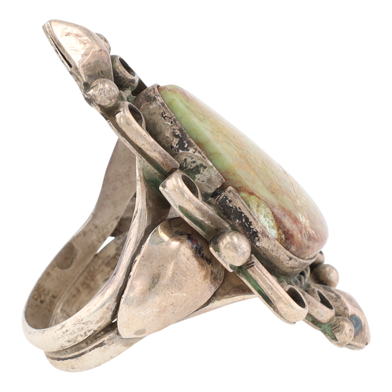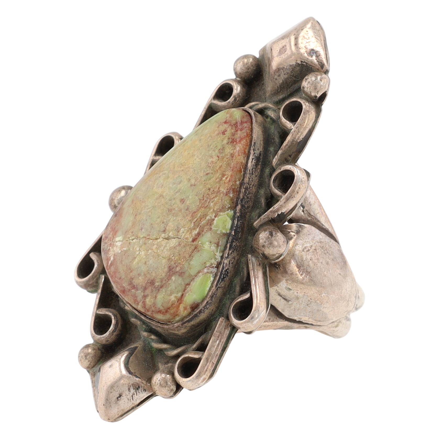 A handmade Navajo sterling silver ring featuring a large green and reddish-brown Kingman turquoise stone, marked ‘STERLING’ and ‘MERLE HOUSE’, size 6, weighing 10.5g. Crack in stone shown in photo