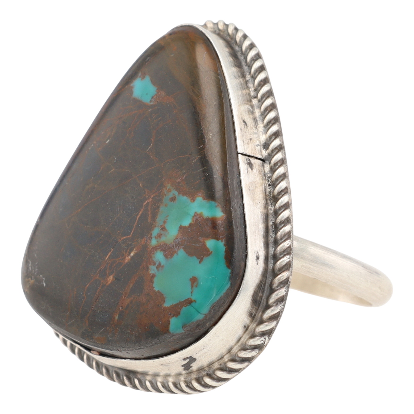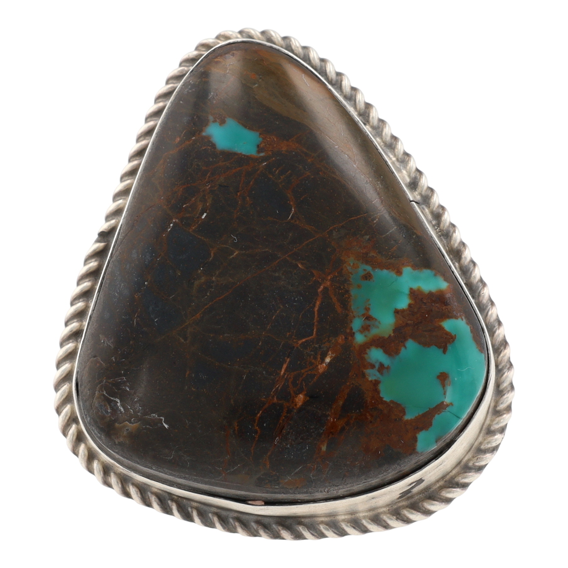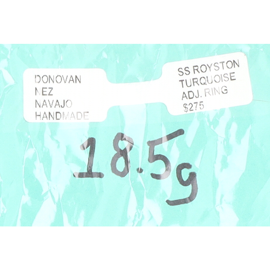 A silver ring featuring a large, triangular, dark brown and turquoise blue Royston turquoise stone, labeled “DONOVAN NEZ NAVAJO HANDMADE SS ROYSTON TURQUOISE ADJ. RING”, weighing 18.5g, with a core size of US 9.5
