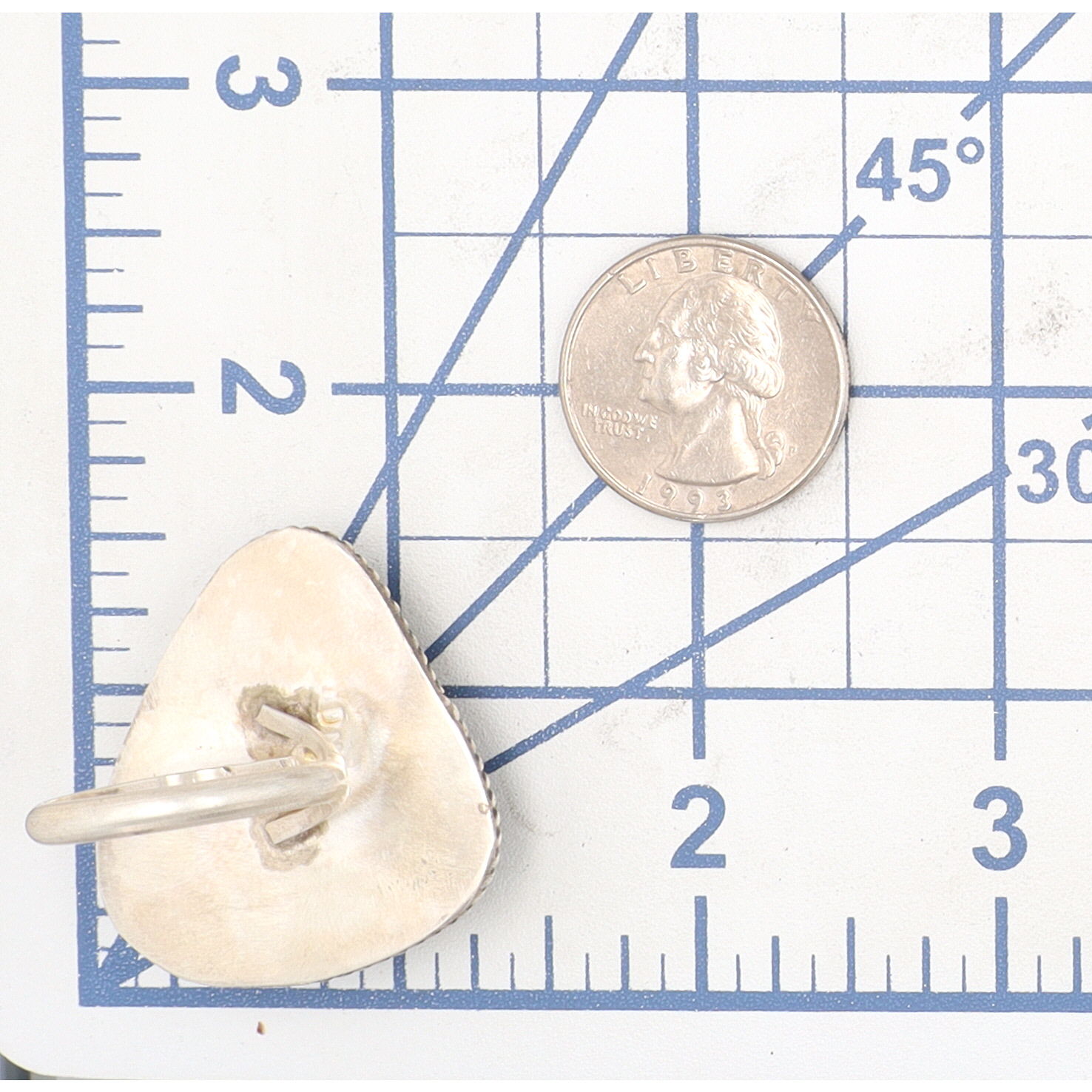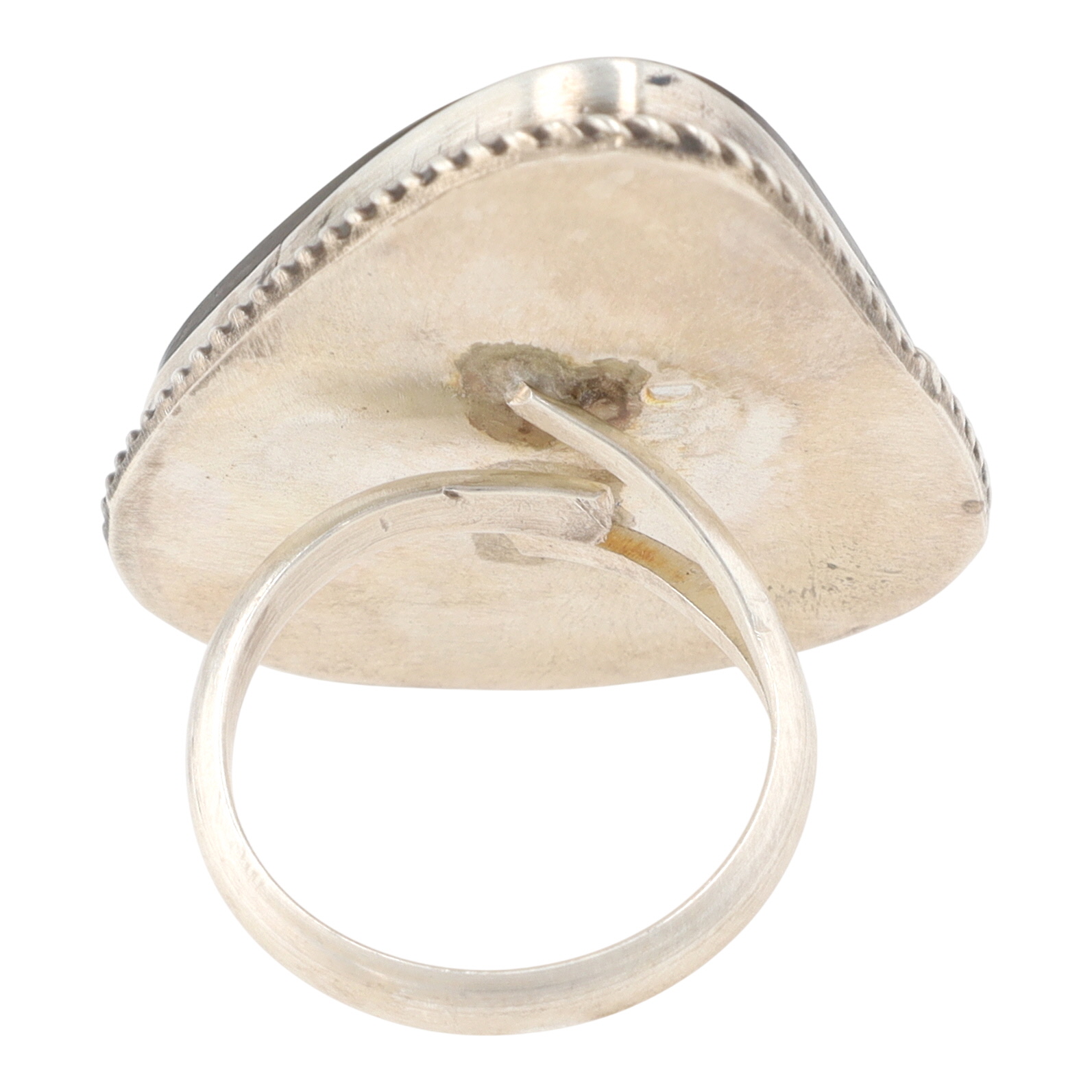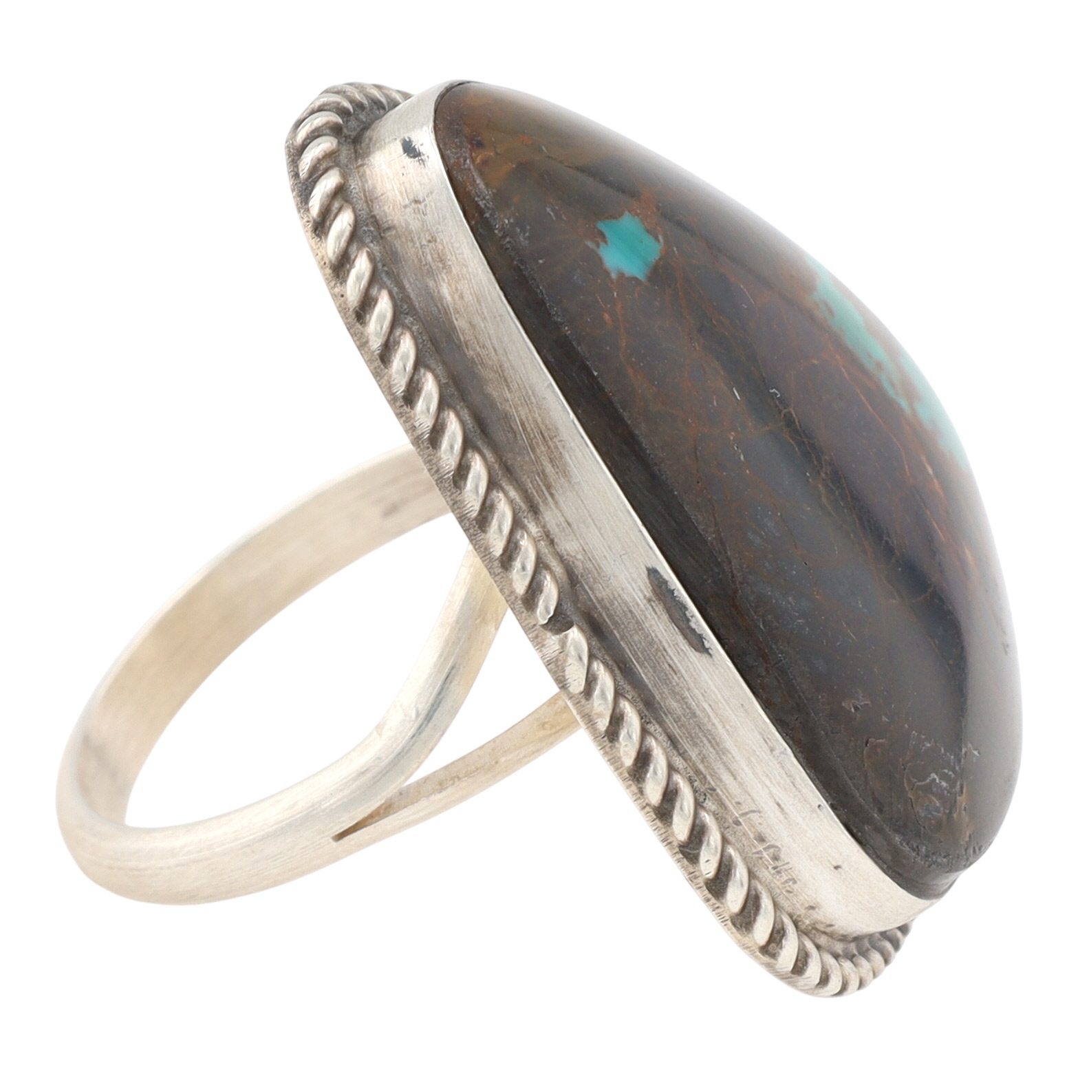 A silver ring featuring a large, triangular, dark brown and turquoise blue Royston turquoise stone, labeled “DONOVAN NEZ NAVAJO HANDMADE SS ROYSTON TURQUOISE ADJ. RING”, weighing 18.5g, with a core size of US 9.5