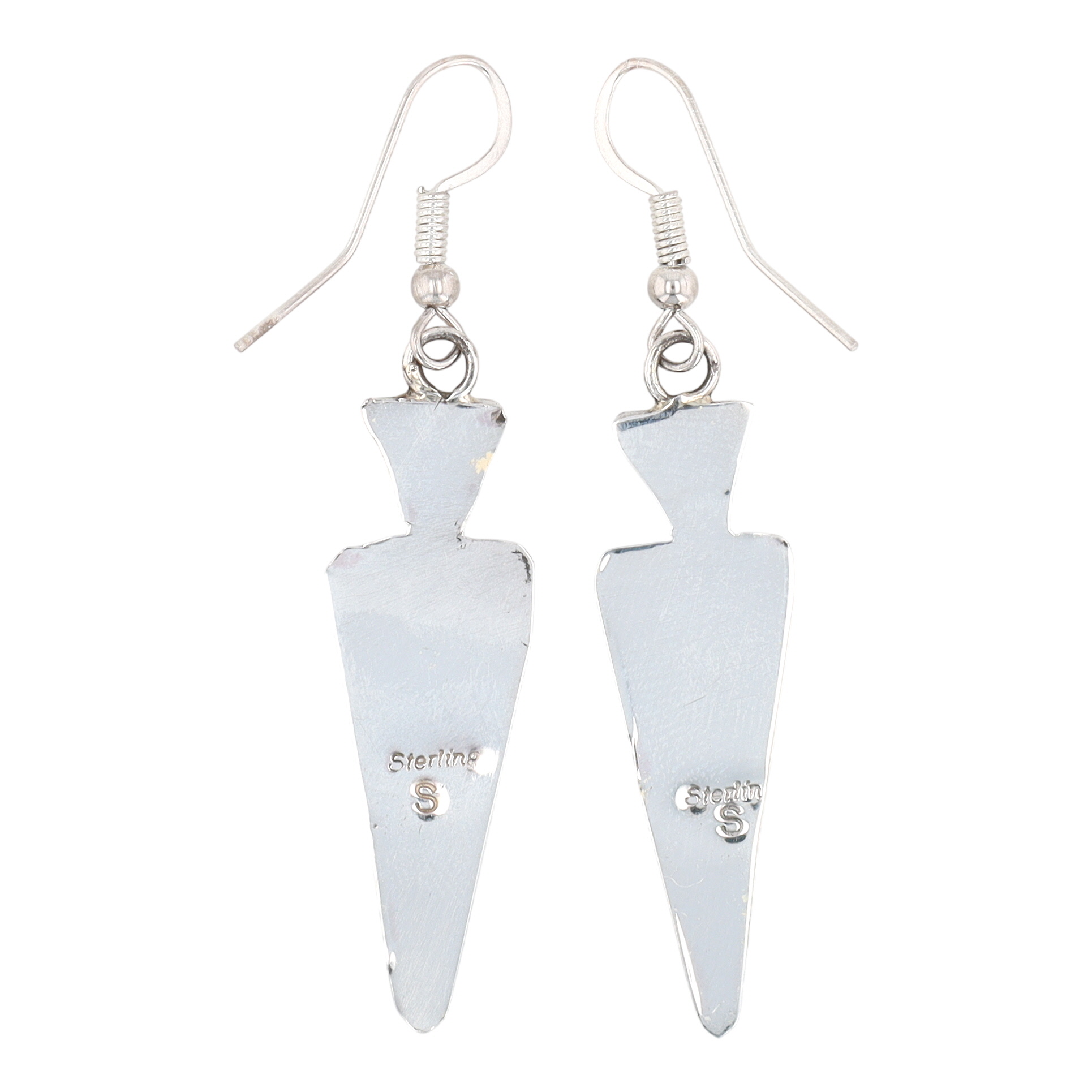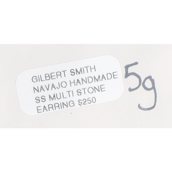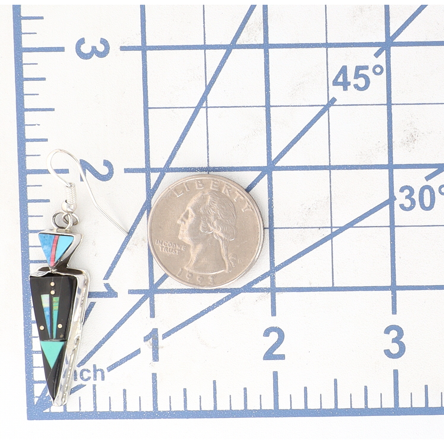 A pair of Gilbert Smith Navajo handmade sterling silver drop earrings with multi-stone inlay of jet/onyx, opal, turquoise, coral, and denim lapis, marked ‘Sterling S’ and weighing 5g, each measuring approximately 2 inches long.