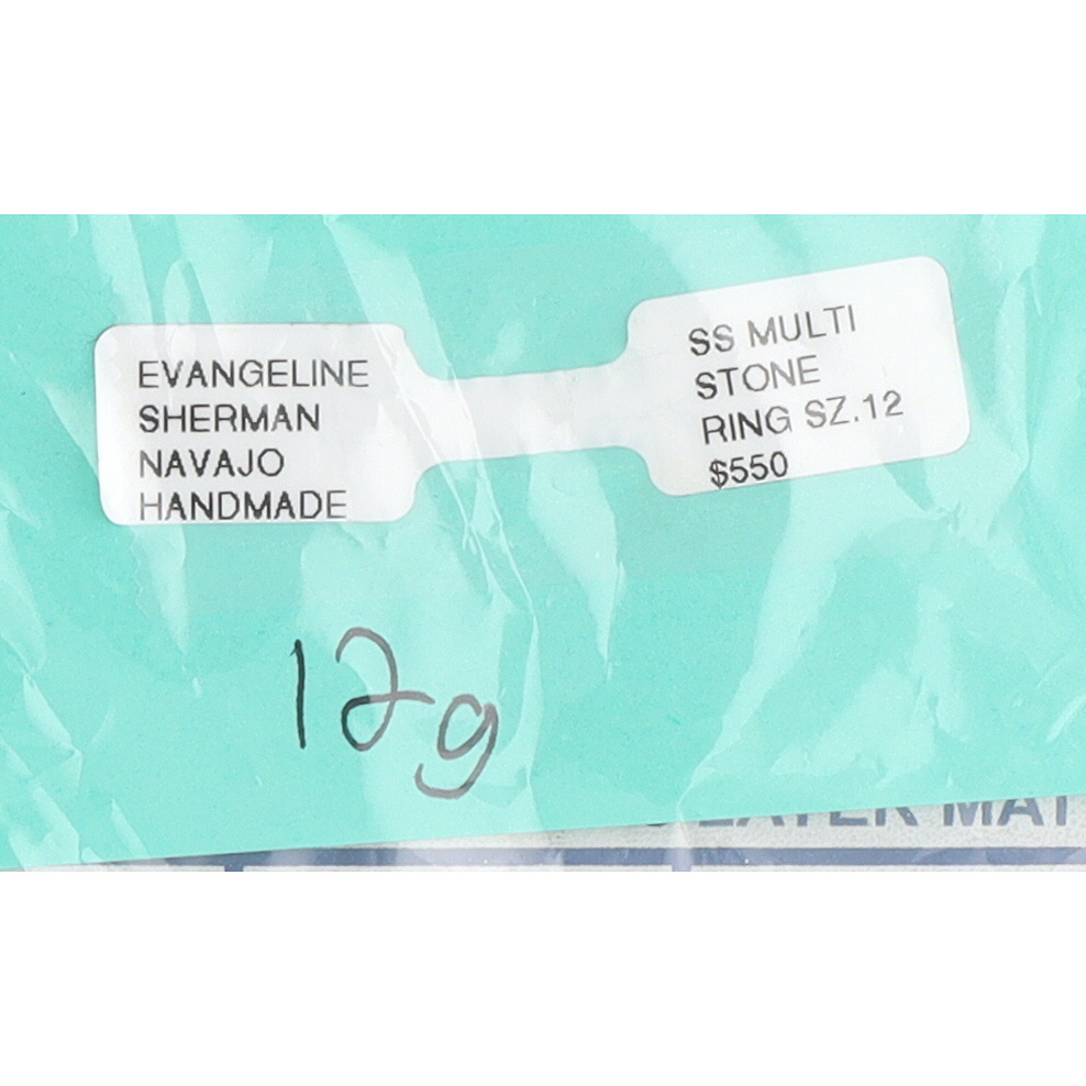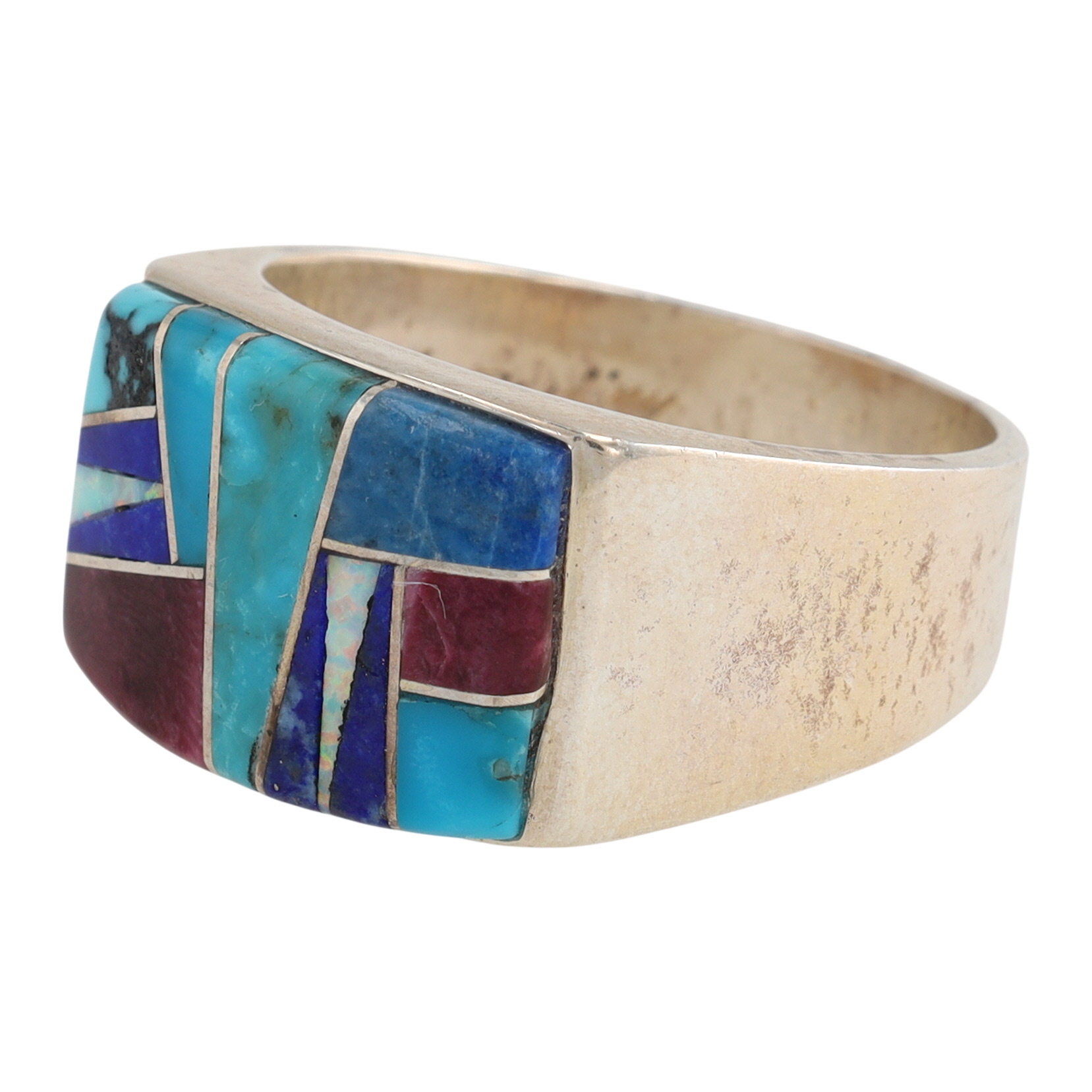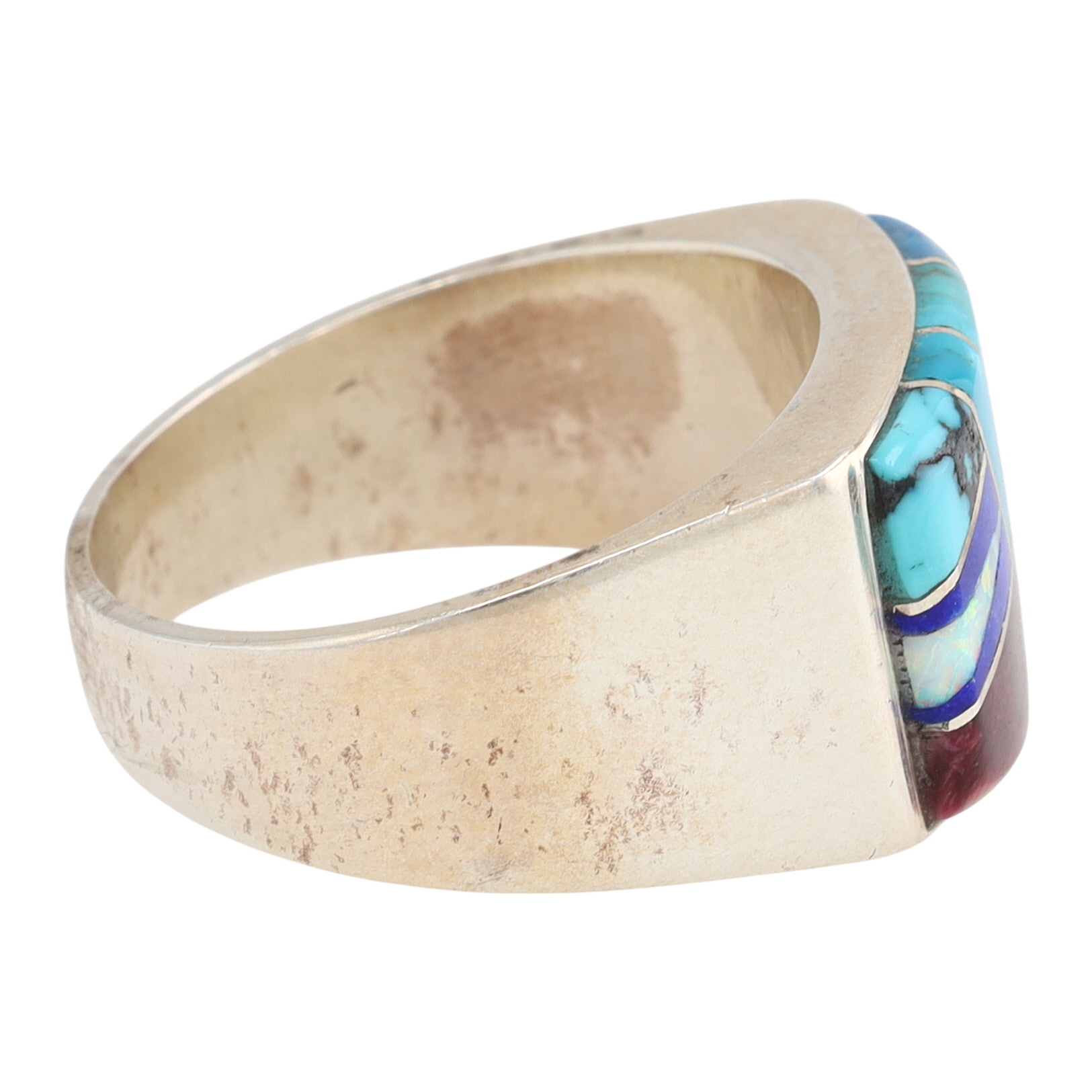 An Evangeline Sherman Navajo handmade sterling silver multi-stone inlay ring, size 12, with denim lapis, purple spiny oyster, opal, turquoise, lapis, marked “ES” and “Hózhó (Shop) Sterling” inside the band, weighing 12g.