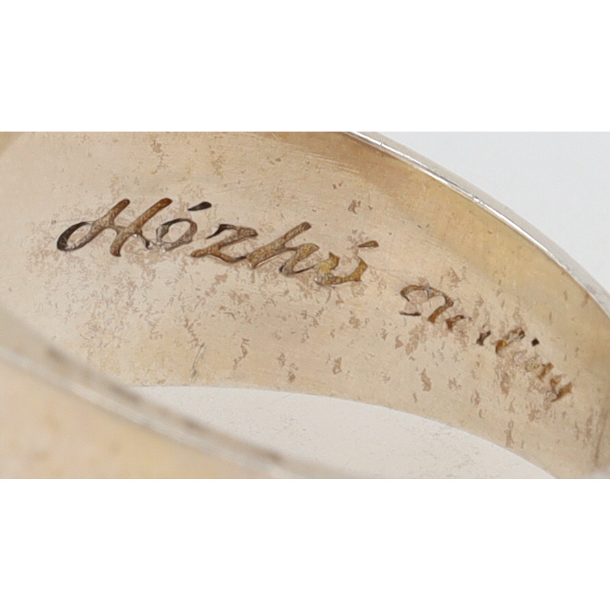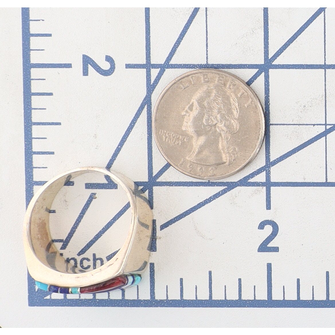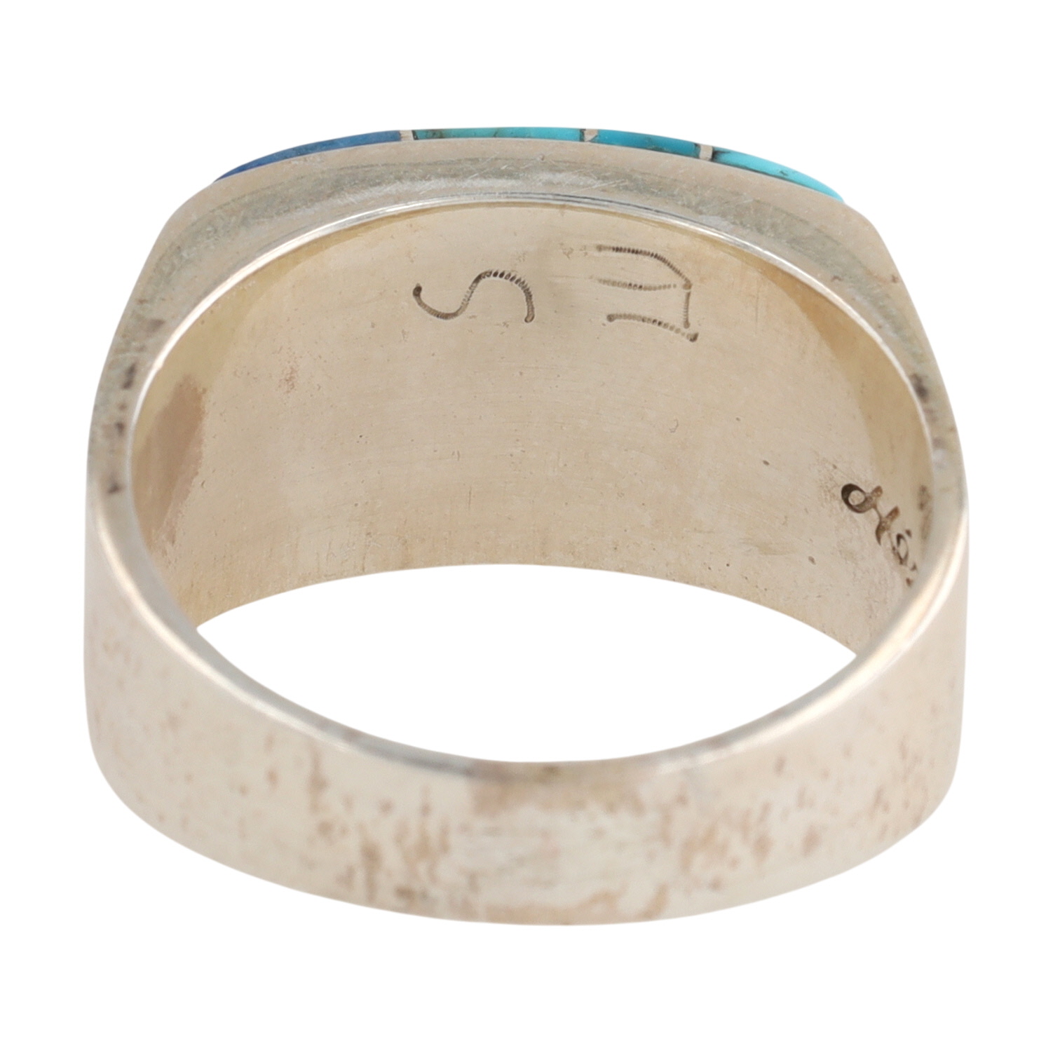 An Evangeline Sherman Navajo handmade sterling silver multi-stone inlay ring, size 12, with denim lapis, purple spiny oyster, opal, turquoise, lapis, marked “ES” and “Hózhó (Shop) Sterling” inside the band, weighing 12g.