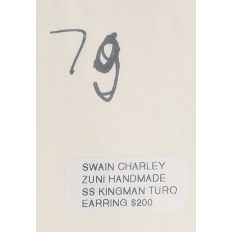 A pair of Zuni handmade silver and Kingman turquoise drop earrings by Swain Charley, measuring approximately 2.5 inches long, 7g.