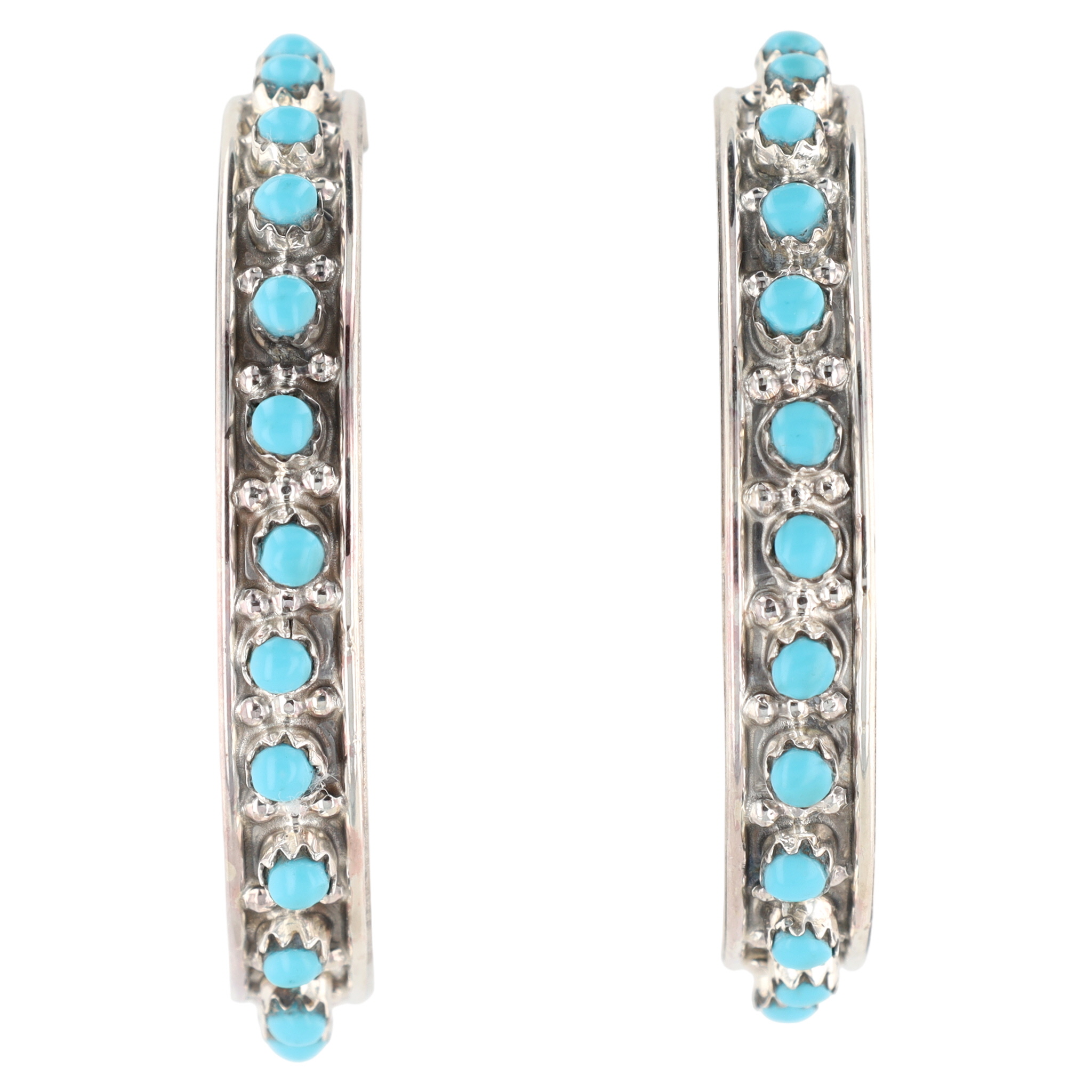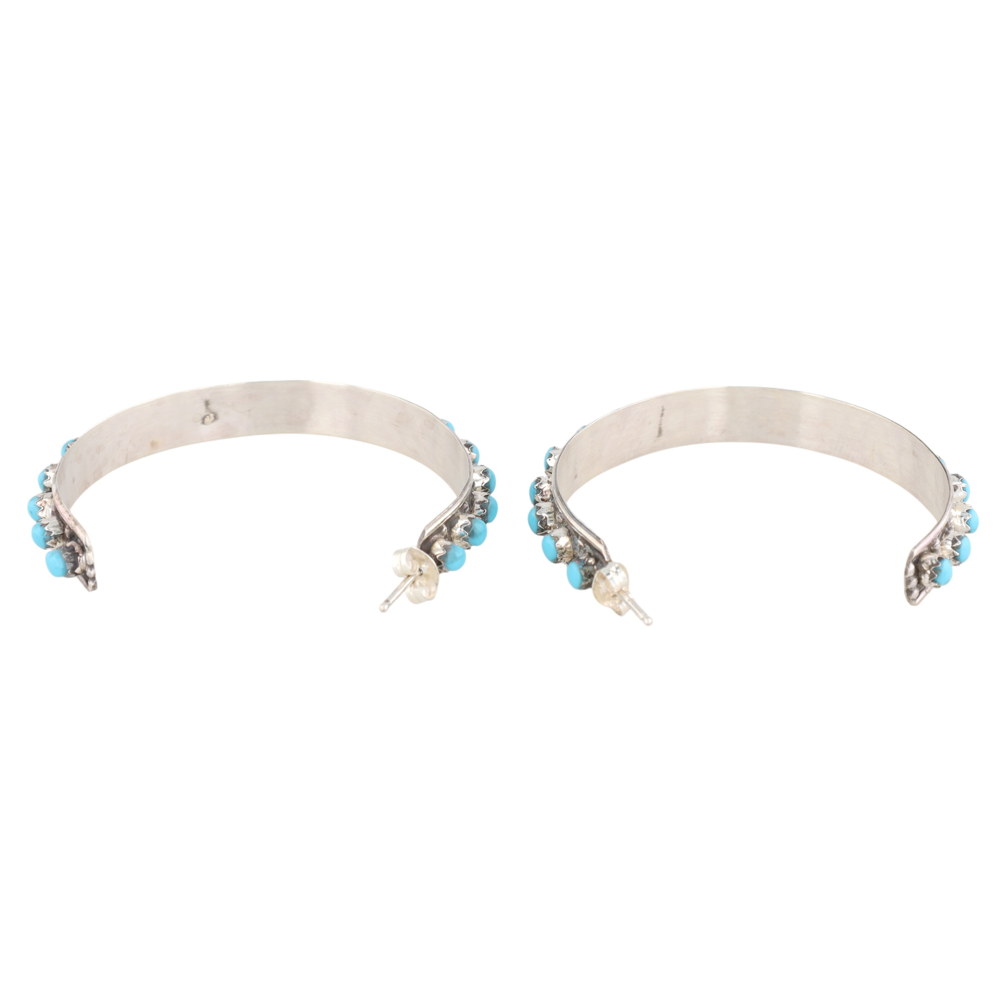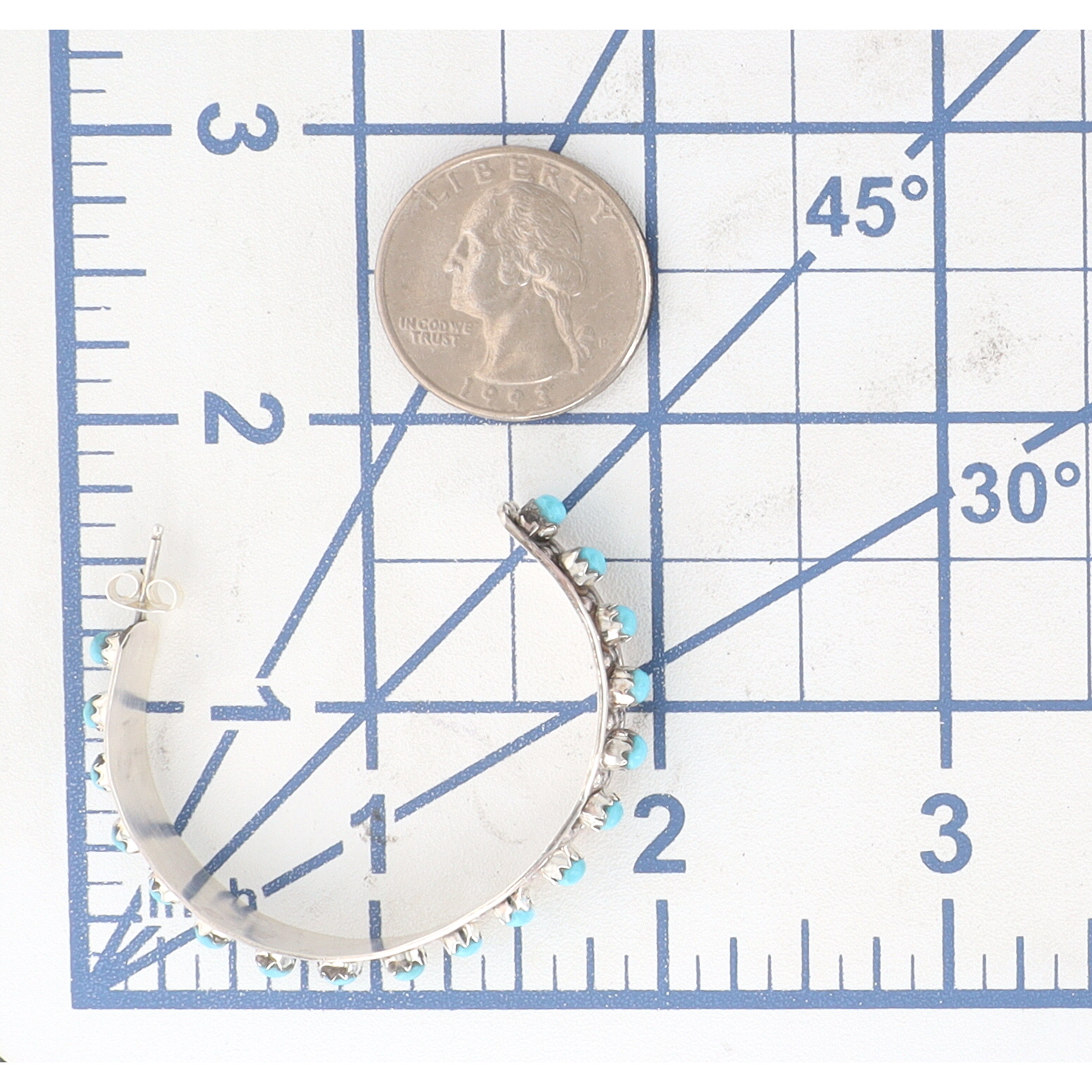 A pair of Marlon Quam Zuni handmade sterling hoop earrings, adorned with multiple small, light blue ‘Sleeping Beauty’ turquoise stones, measuring approximately 1.5 inches in diameter, weighing 9g.
