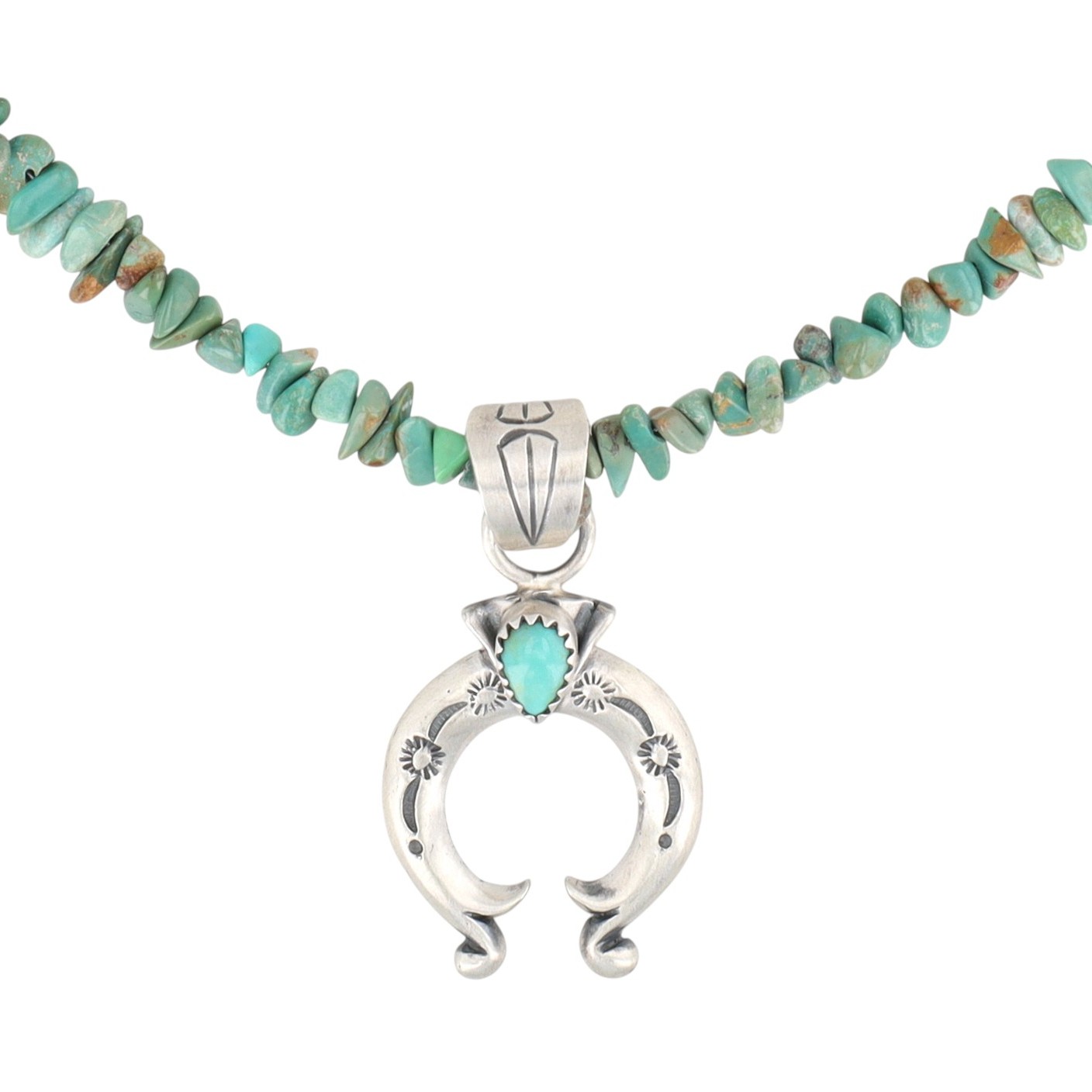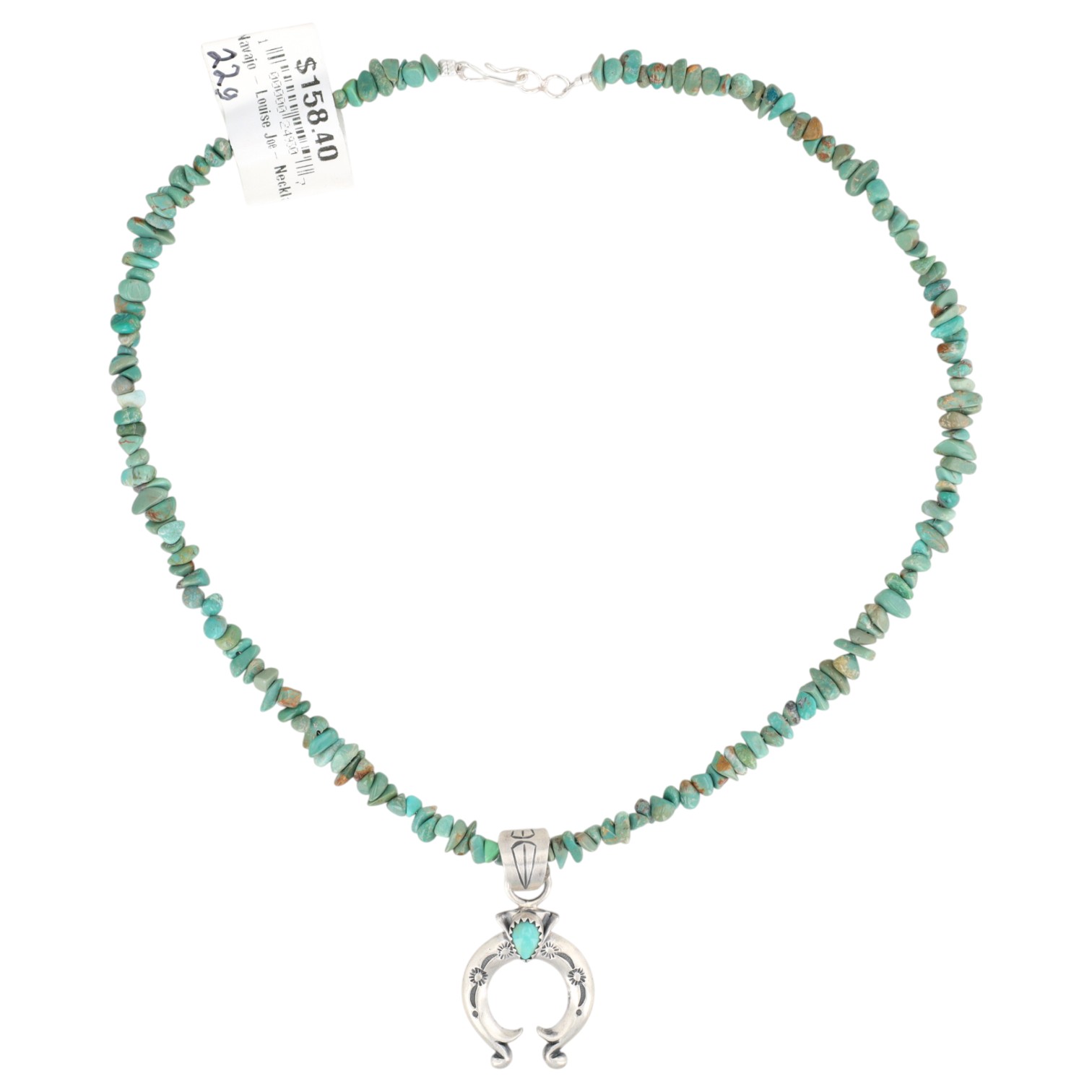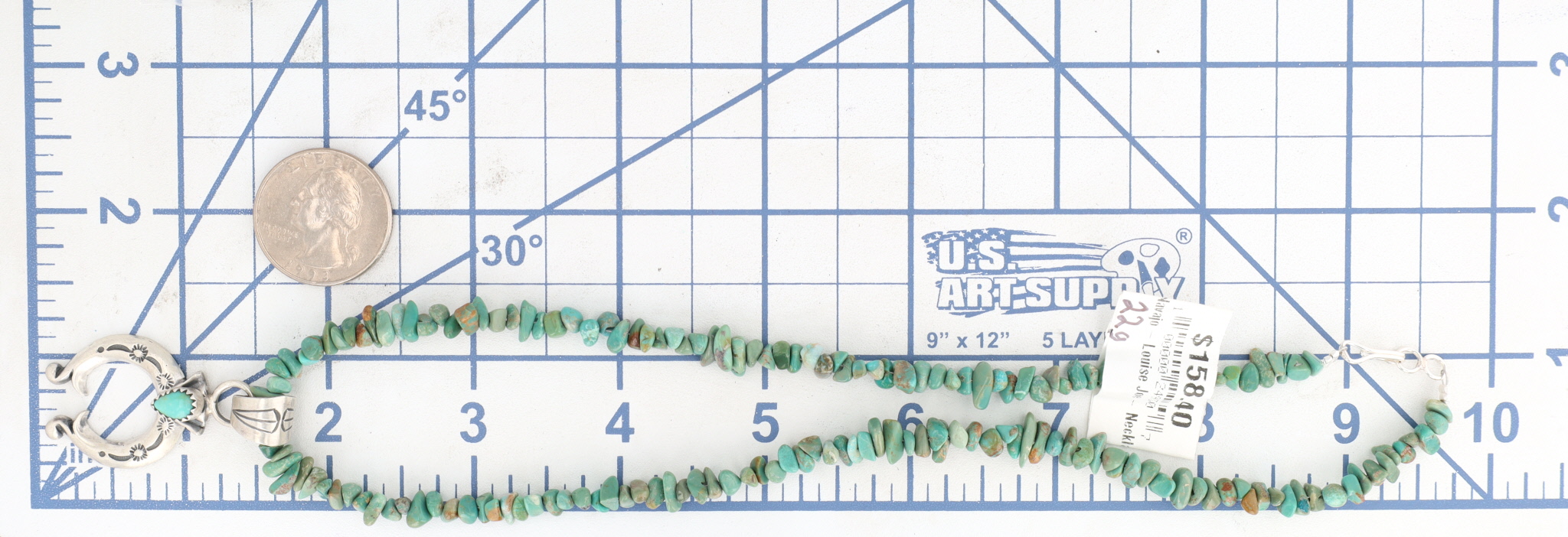 A turquoise chip bead necklace with a sterling Naja pendant set with a central turquoise stone and etched designs, identified as Navajo by Louise Joe, approximately 16 inches long.